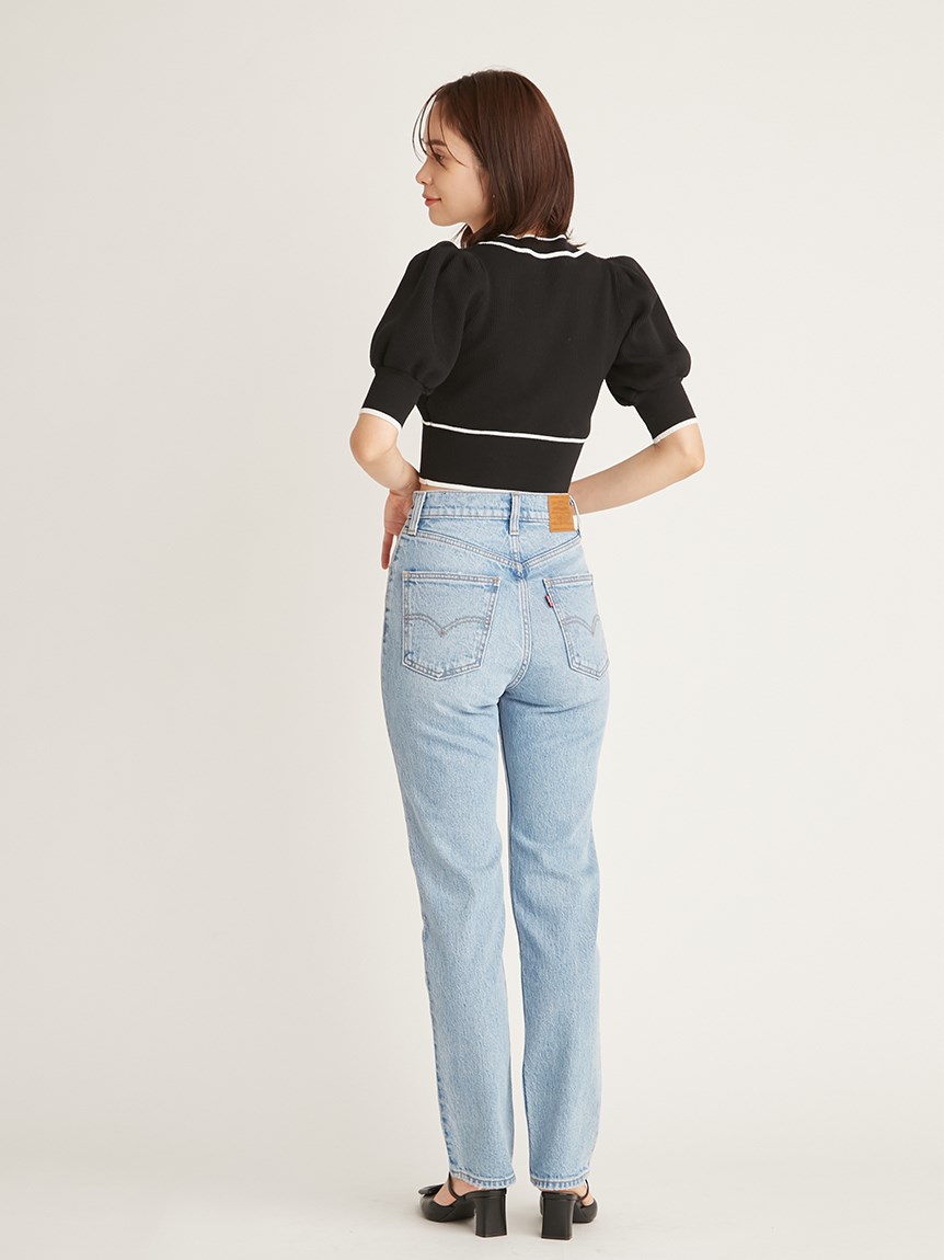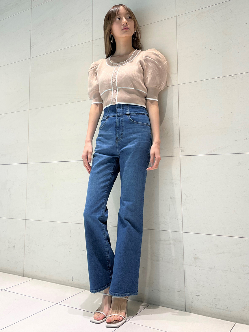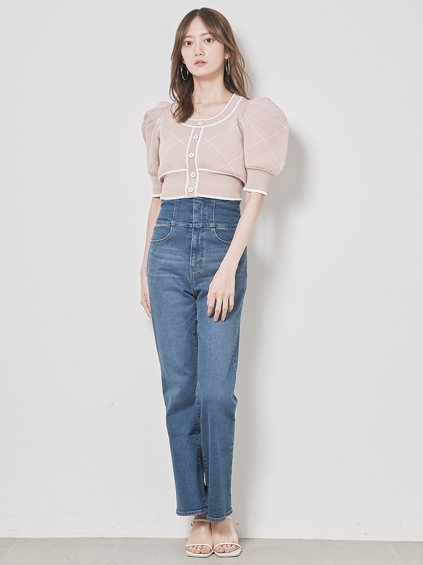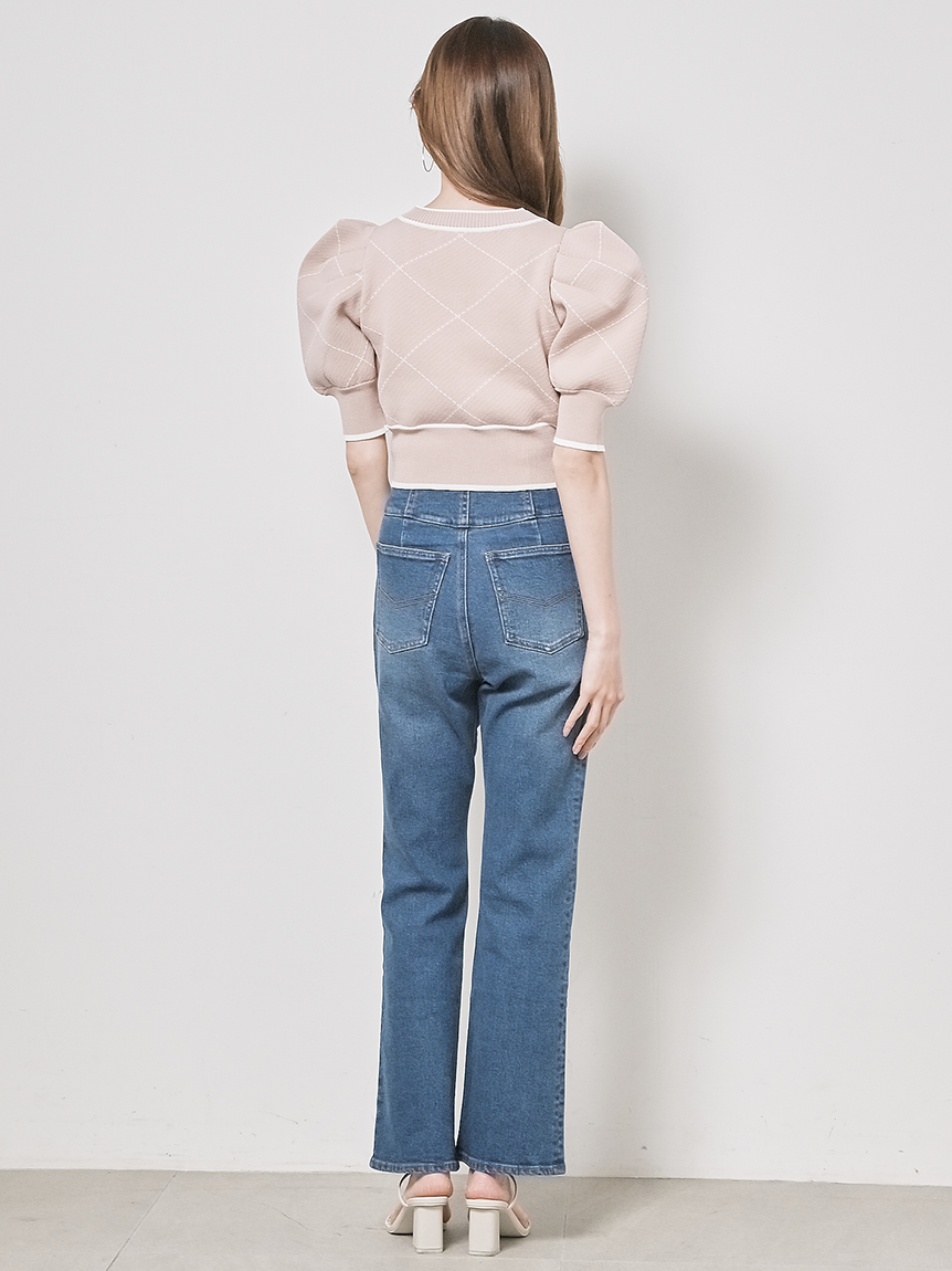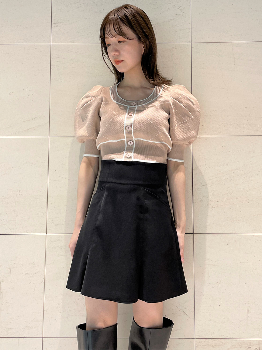 トレンドのクロップド丈を採用した、プラスワンでスタイリングの鮮度が高まるニットプルオーバー。たっぷりとボリュームを持たせたパフスリーブでモードな印象に。バイカラーデザインとカーディガンのようなフロントデザインに金縁ボタンが今年らしいレトロなムードを演出しています。裾&袖口を幅広のリブで切り替えたメリハリシルエットでスタイルアップ効果も抜群です。