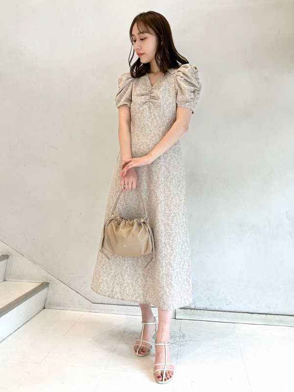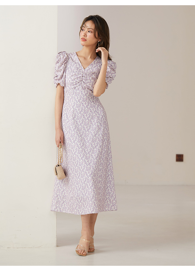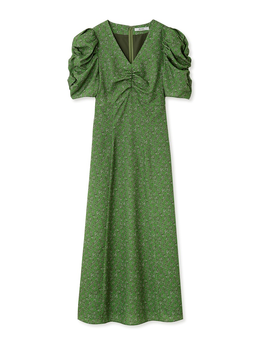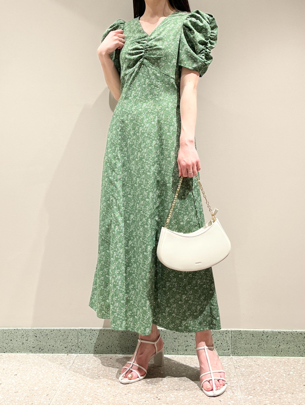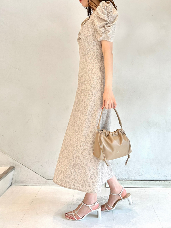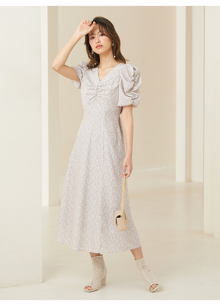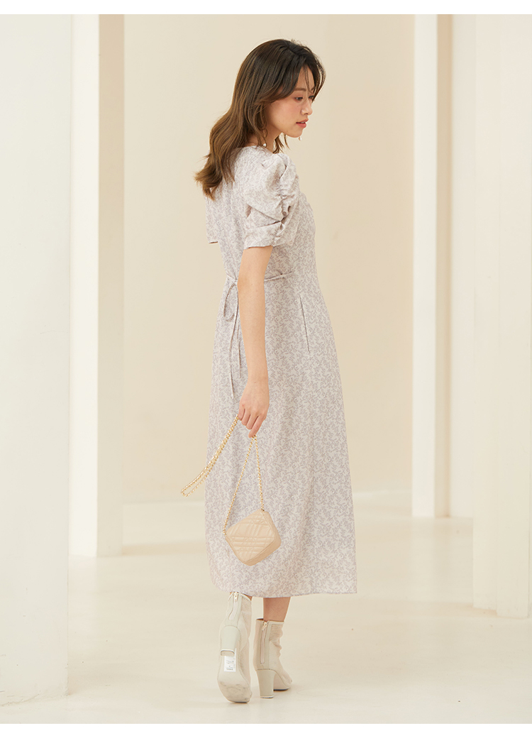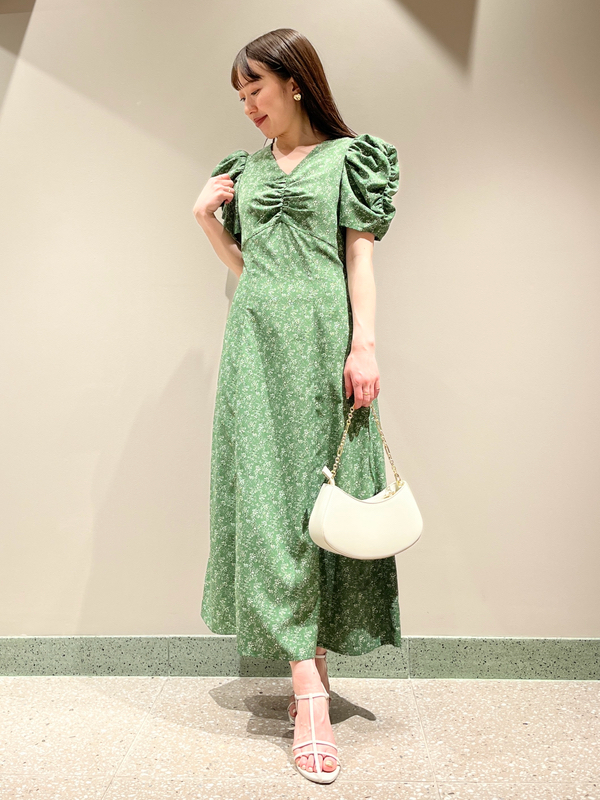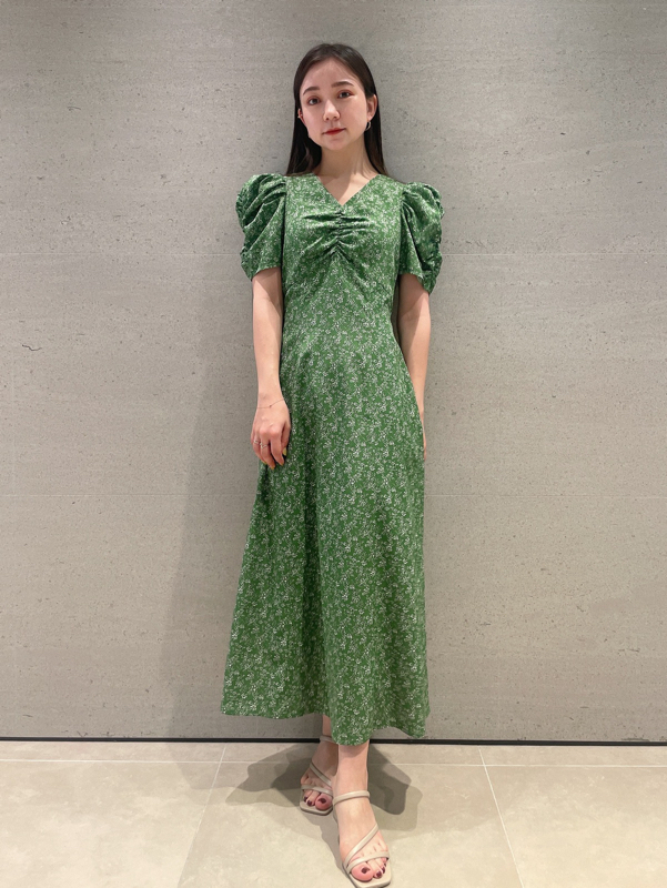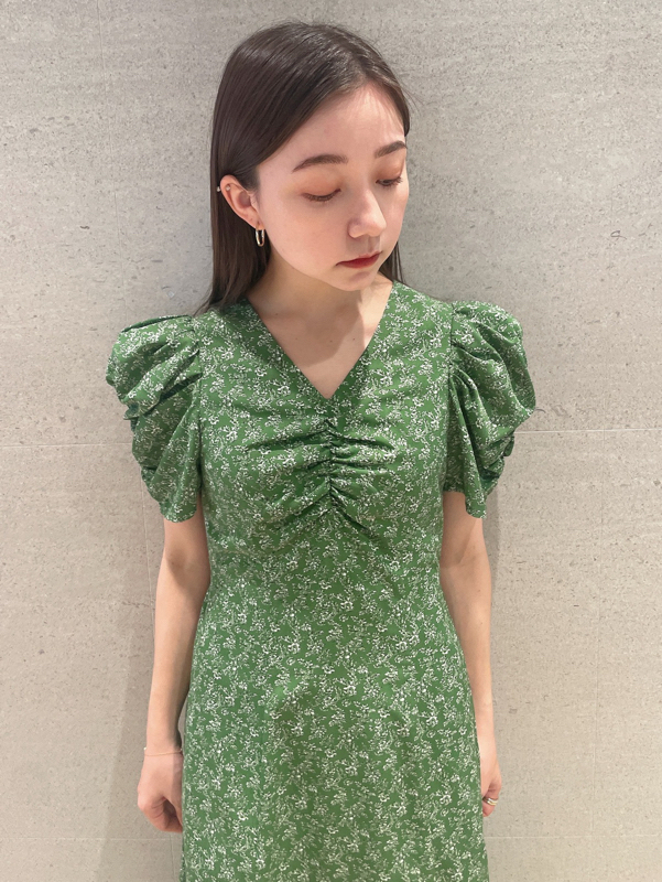 飽きの来ない小花のオリジナルプリントがスタイリングにシーズンムードをもたらすワンピース。胸元と袖に施されたギャザーで女性らしく華やかな表情に。身体のラインが美しく見えるよう、胸下の切り替えと縦パネルで仕上げています。バックウエストには華奢なリボンをあしらい、後ろ姿まで抜かりなし。