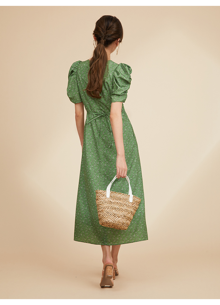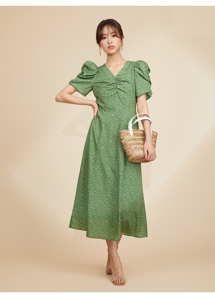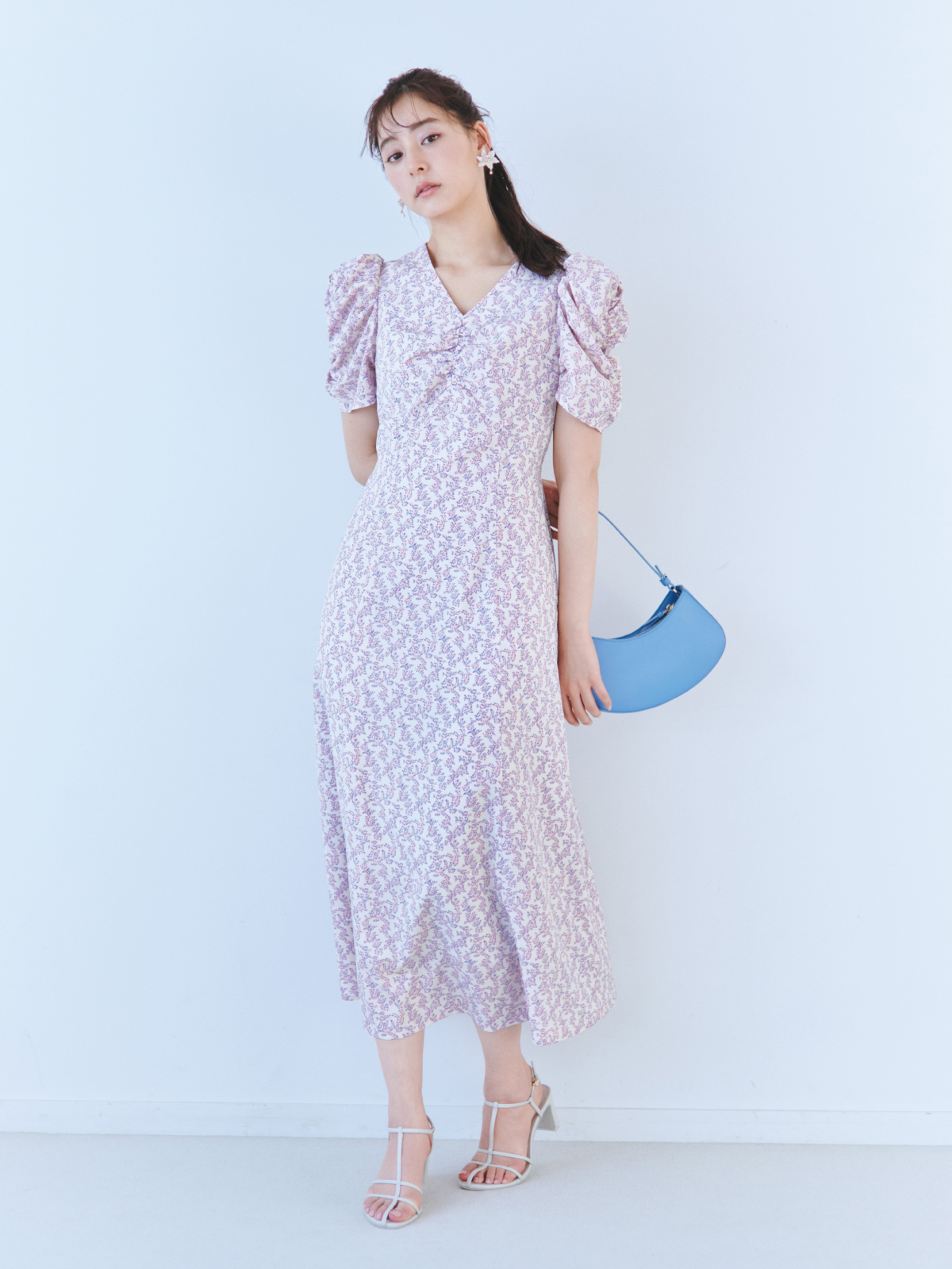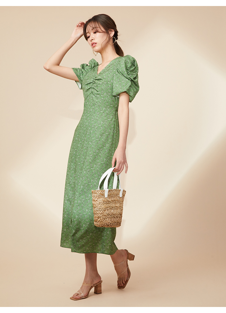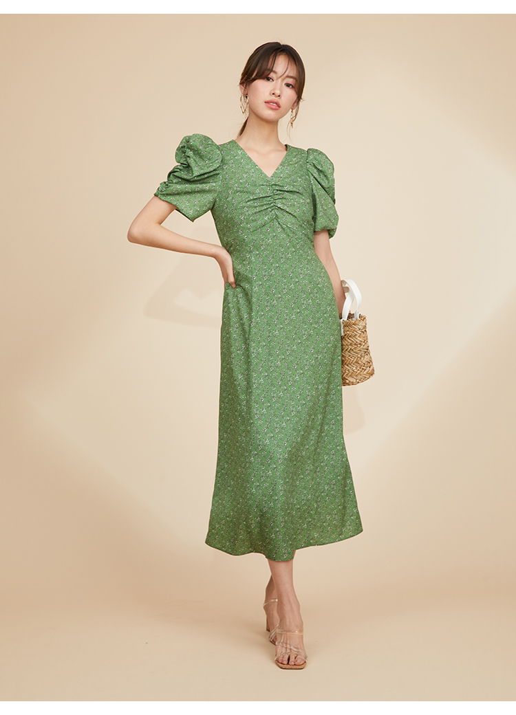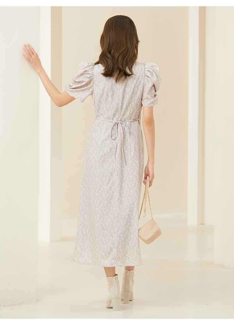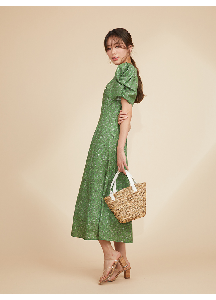 飽きの来ない小花のオリジナルプリントがスタイリングにシーズンムードをもたらすワンピース。胸元と袖に施されたギャザーで女性らしく華やかな表情に。身体のラインが美しく見えるよう、胸下の切り替えと縦パネルで仕上げています。バックウエストには華奢なリボンをあしらい、後ろ姿まで抜かりなし。
