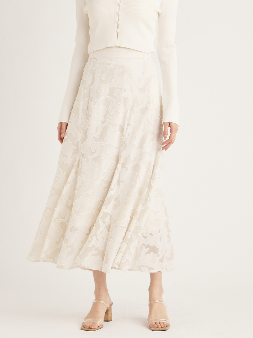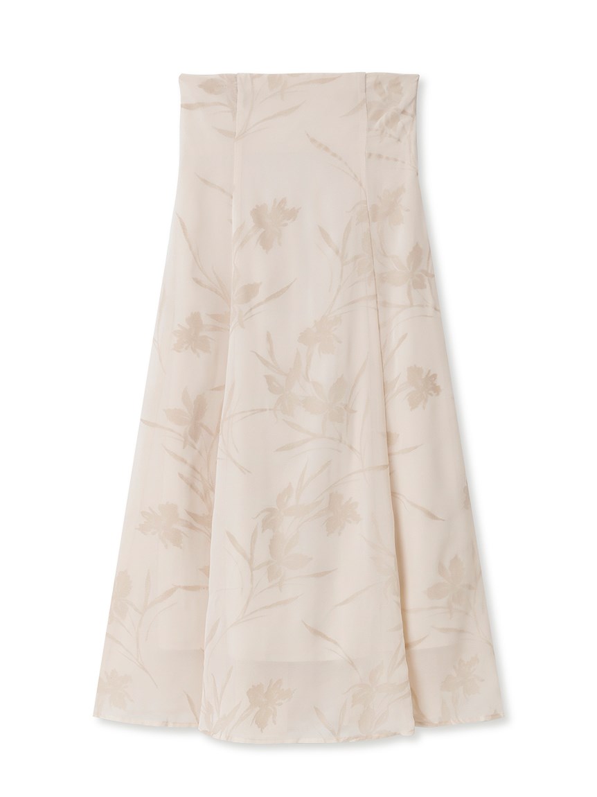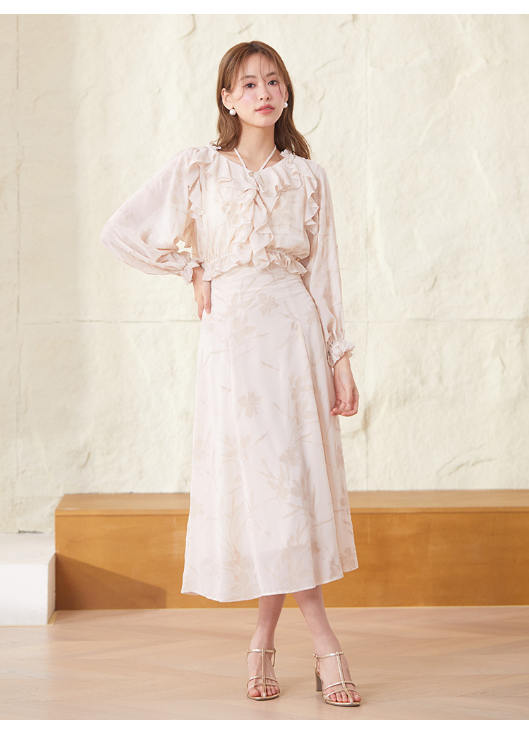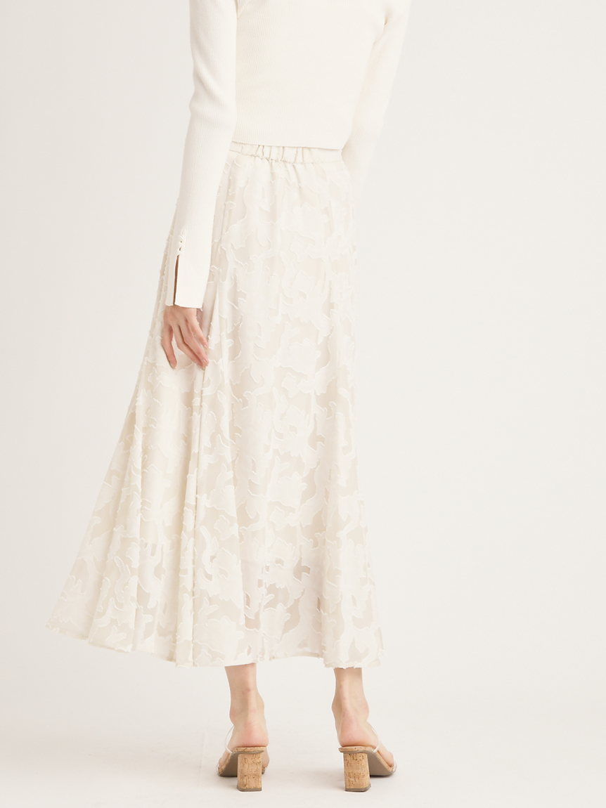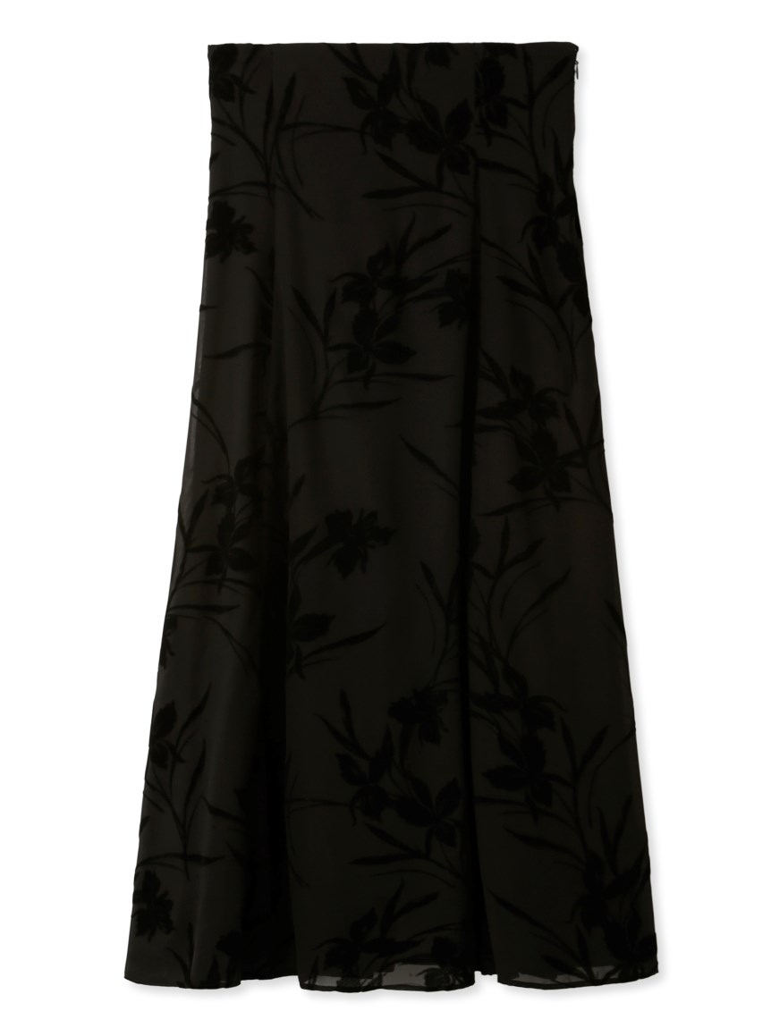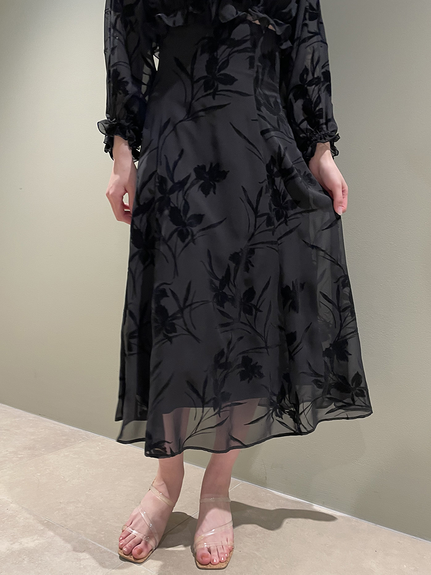 フロッキープリントで施されたフラワー模様が印象的な、フェミニンムード溢れるスカート。ほんのり透け感のある軽やかな素材感とひらりと広がるフレアラインが、シーズンムードを盛り上げています。ボディラインにすっきりと沿うハイウエストデザインで、スタイルアップ効果も◎。同シリーズのブラウス(SWFB231121)を合わせた、ワンピースライクなスタイリングがおすすめです。