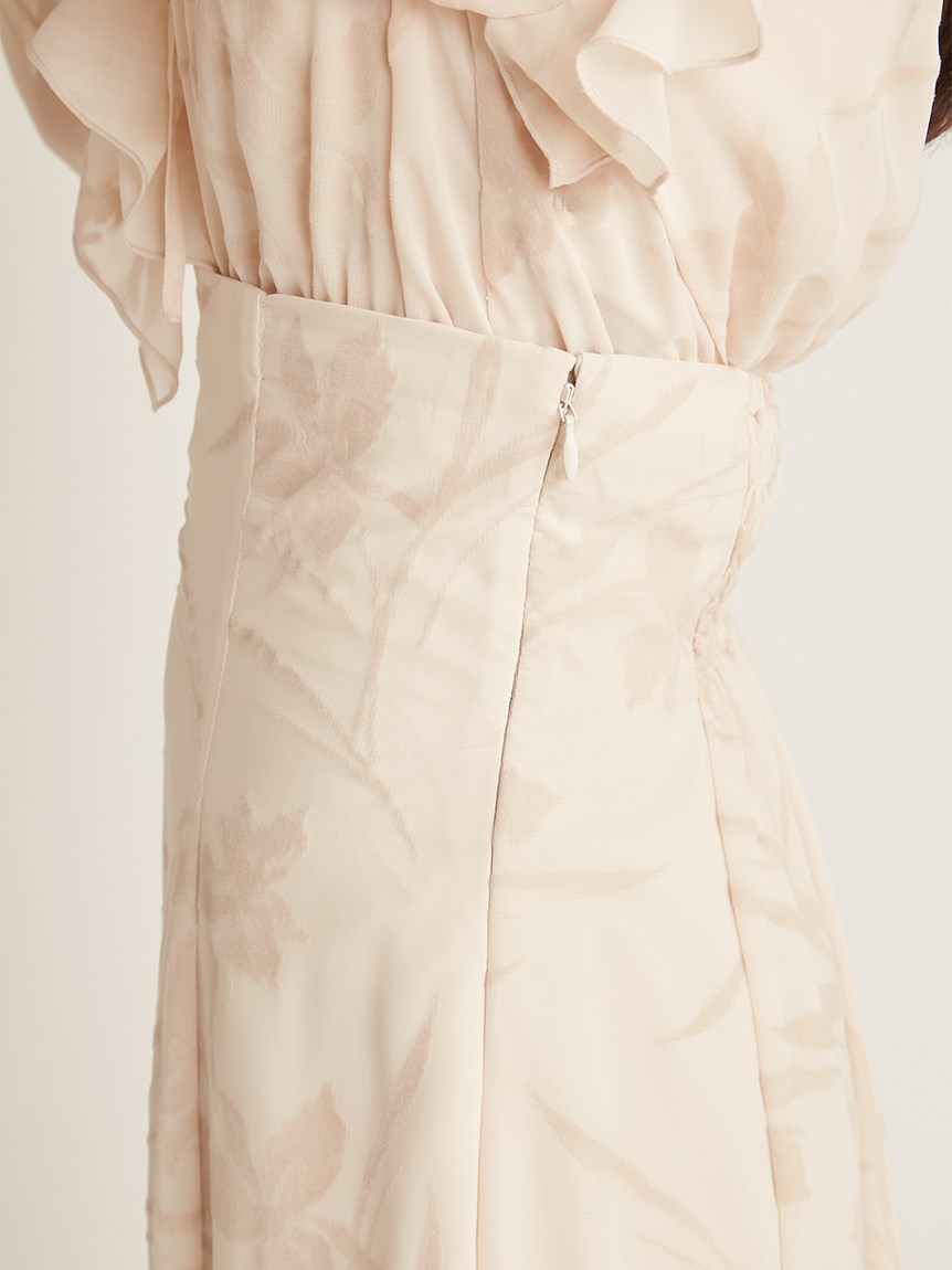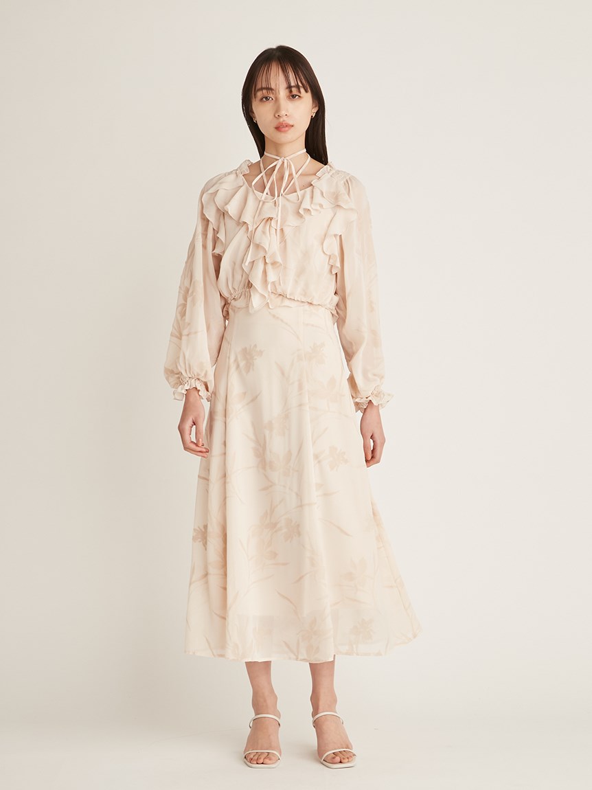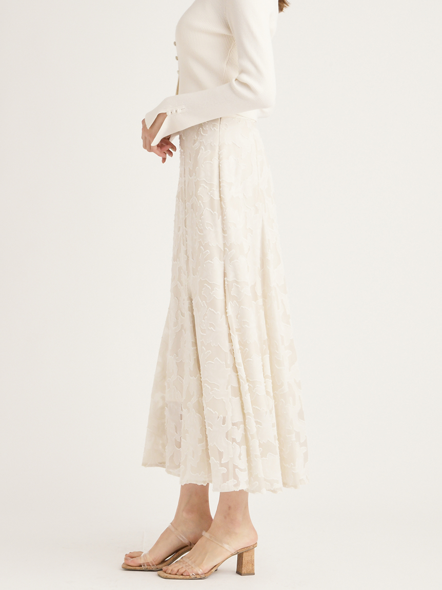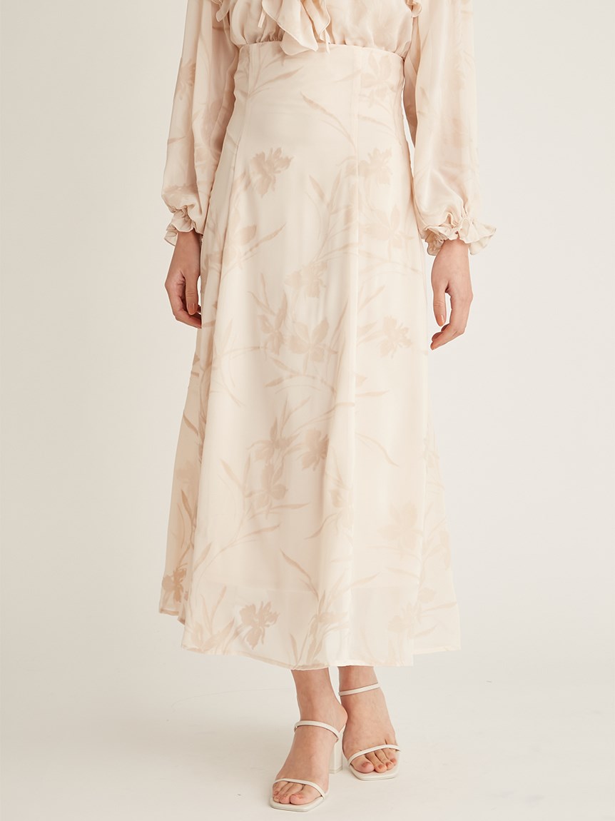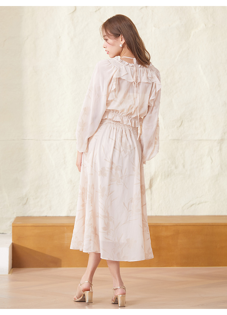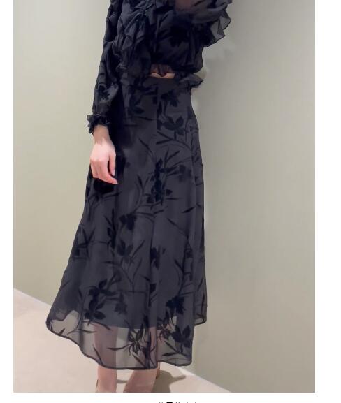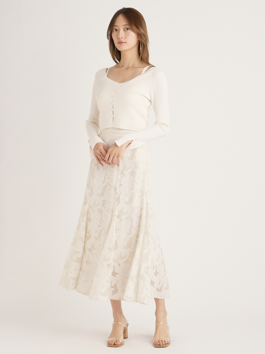 フロッキープリントで施されたフラワー模様が印象的な、フェミニンムード溢れるスカート。ほんのり透け感のある軽やかな素材感とひらりと広がるフレアラインが、シーズンムードを盛り上げています。ボディラインにすっきりと沿うハイウエストデザインで、スタイルアップ効果も◎。同シリーズのブラウス(SWFB231121)を合わせた、ワンピースライクなスタイリングがおすすめです。