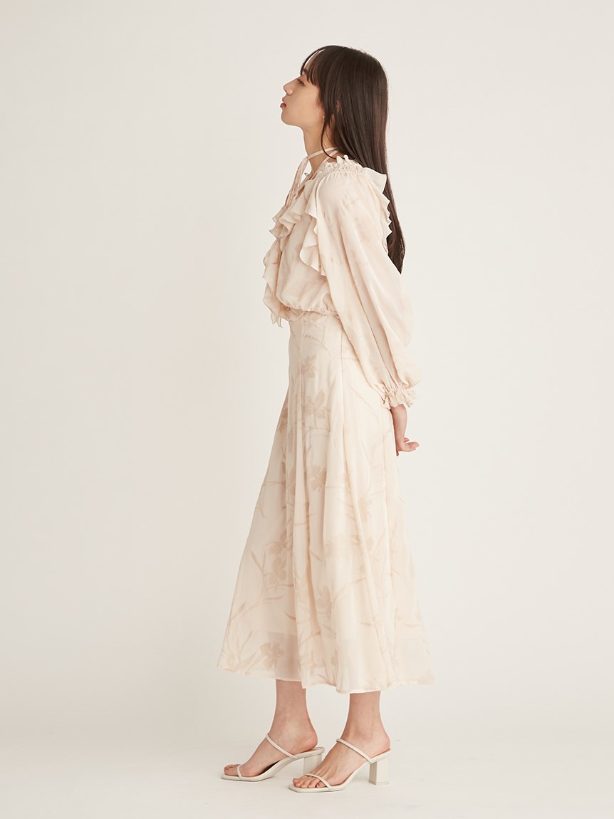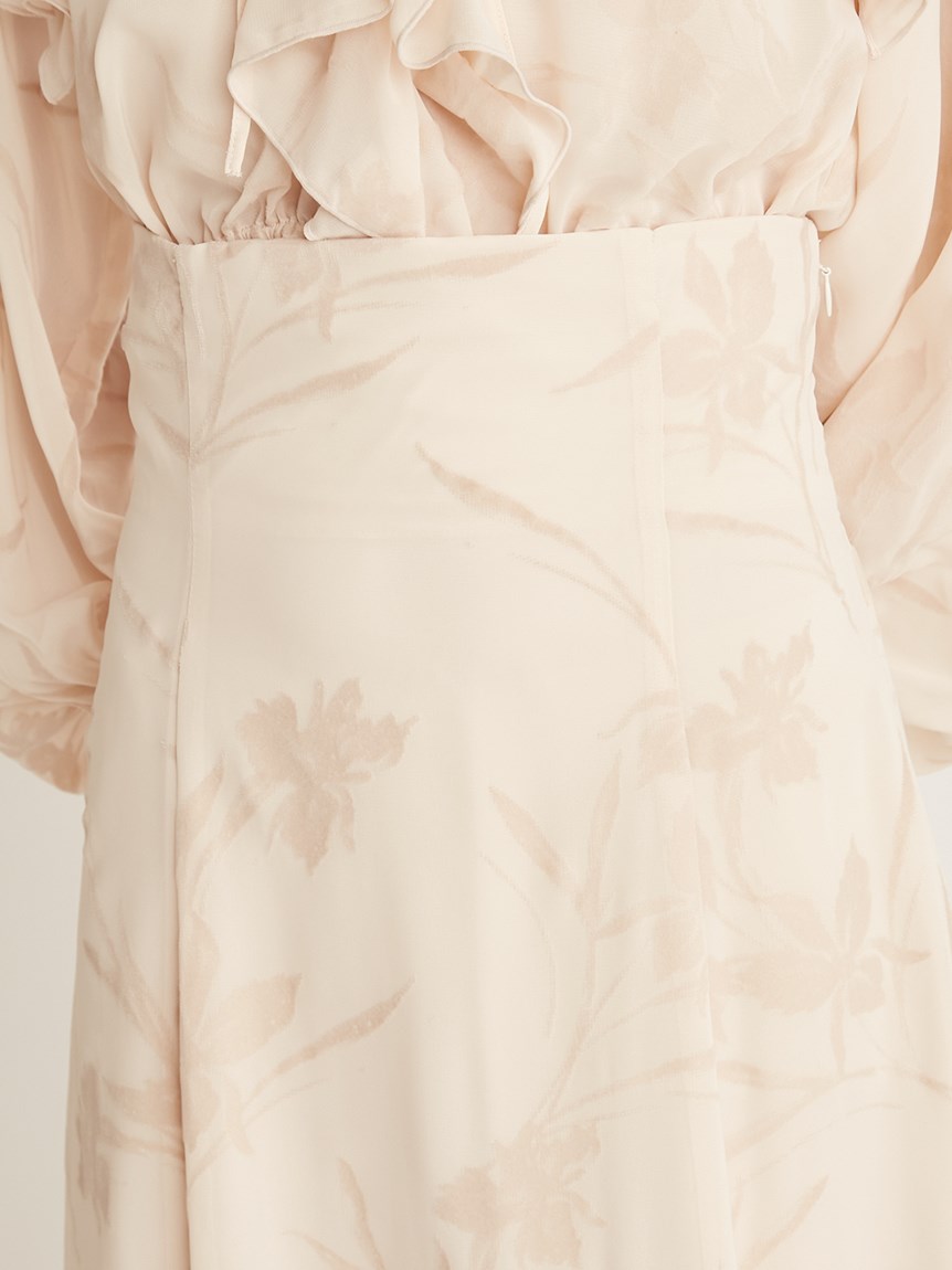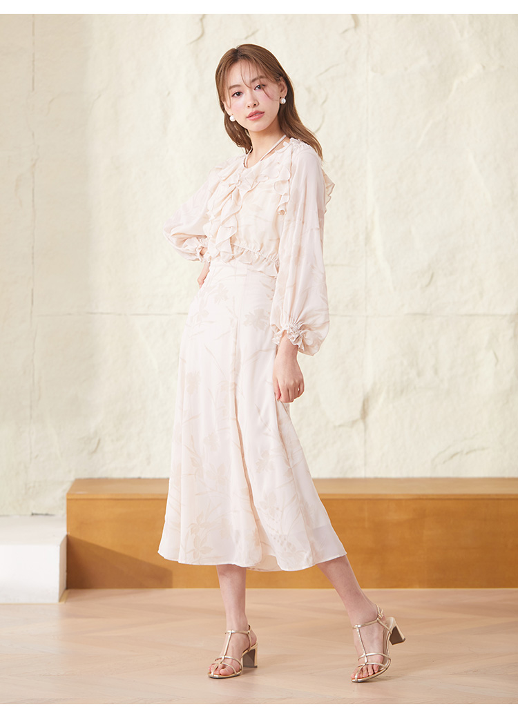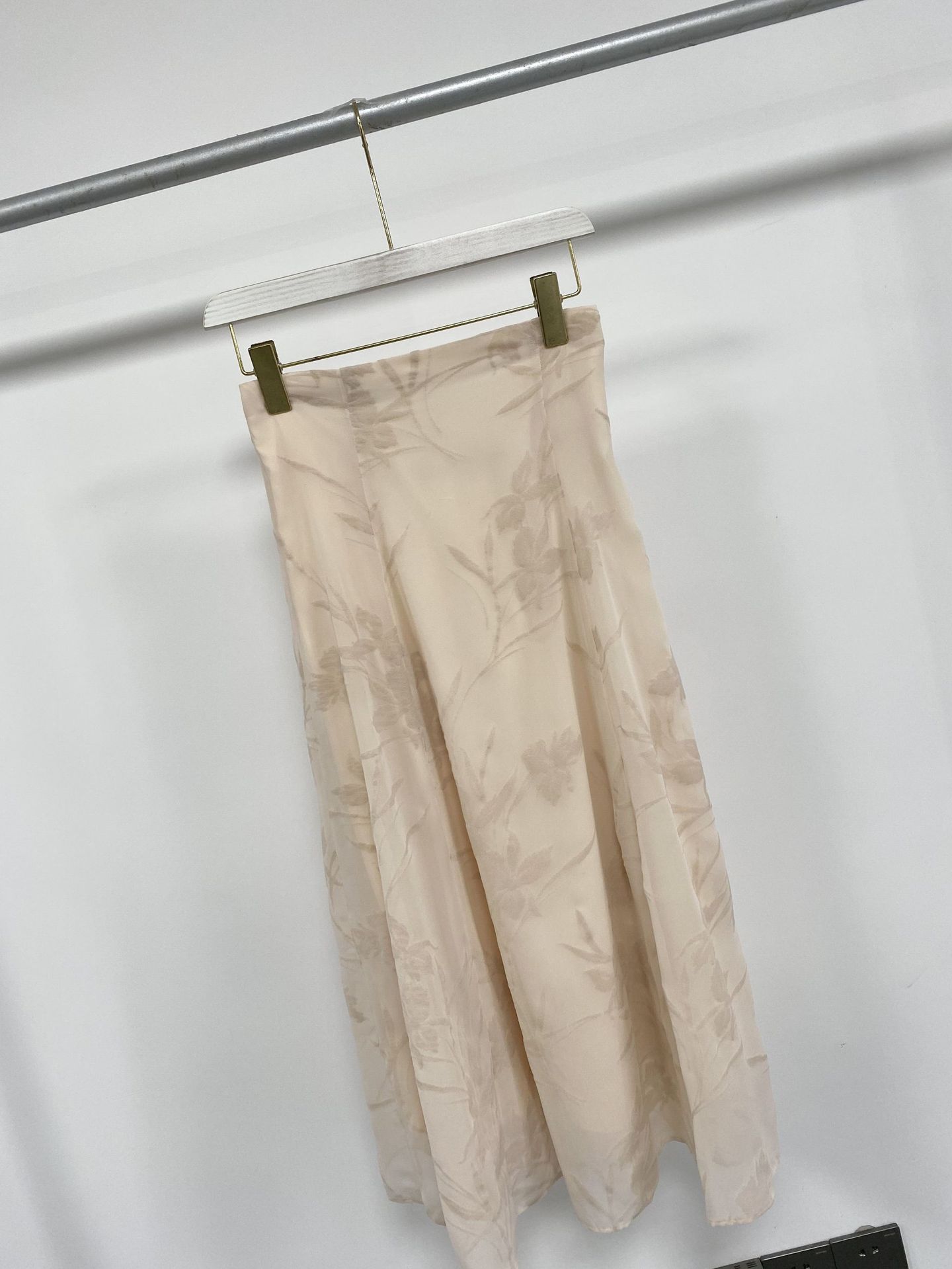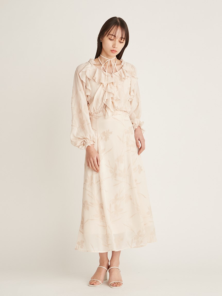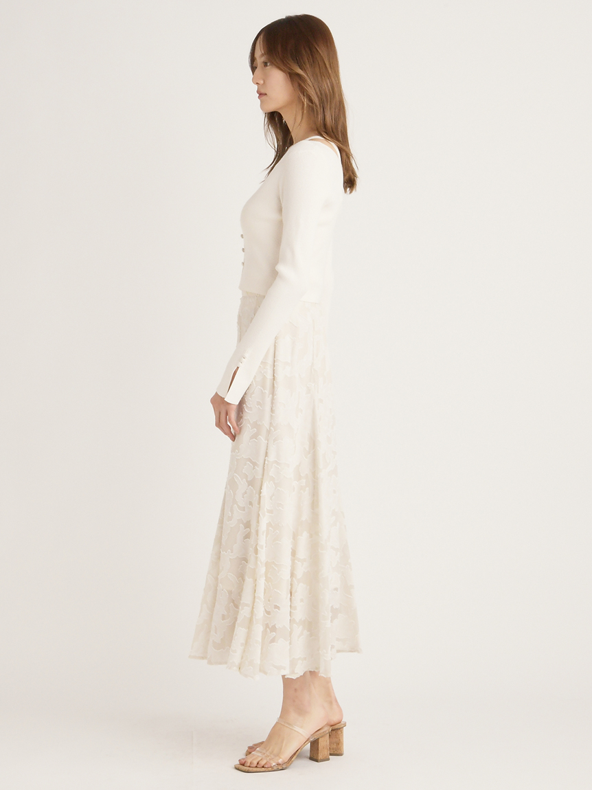 フロッキープリントで施されたフラワー模様が印象的な、フェミニンムード溢れるスカート。ほんのり透け感のある軽やかな素材感とひらりと広がるフレアラインが、シーズンムードを盛り上げています。ボディラインにすっきりと沿うハイウエストデザインで、スタイルアップ効果も◎。同シリーズのブラウス(SWFB231121)を合わせた、ワンピースライクなスタイリングがおすすめです。