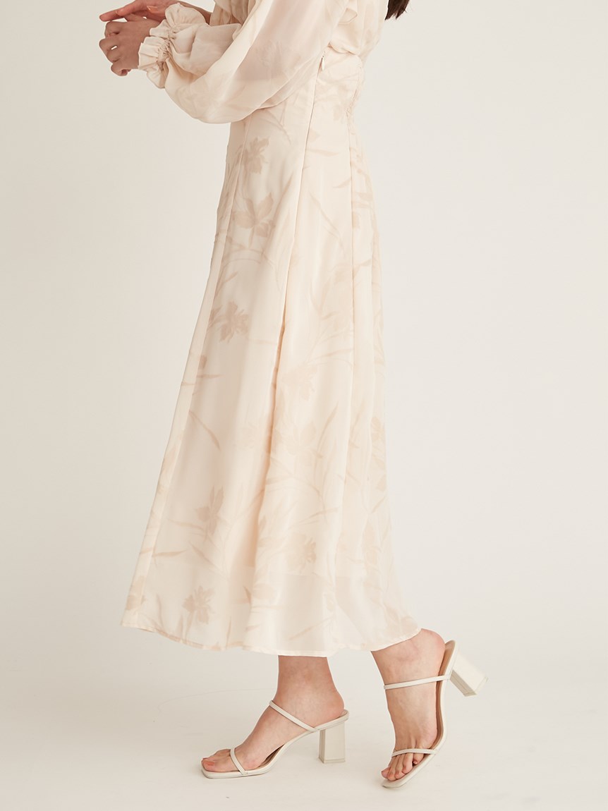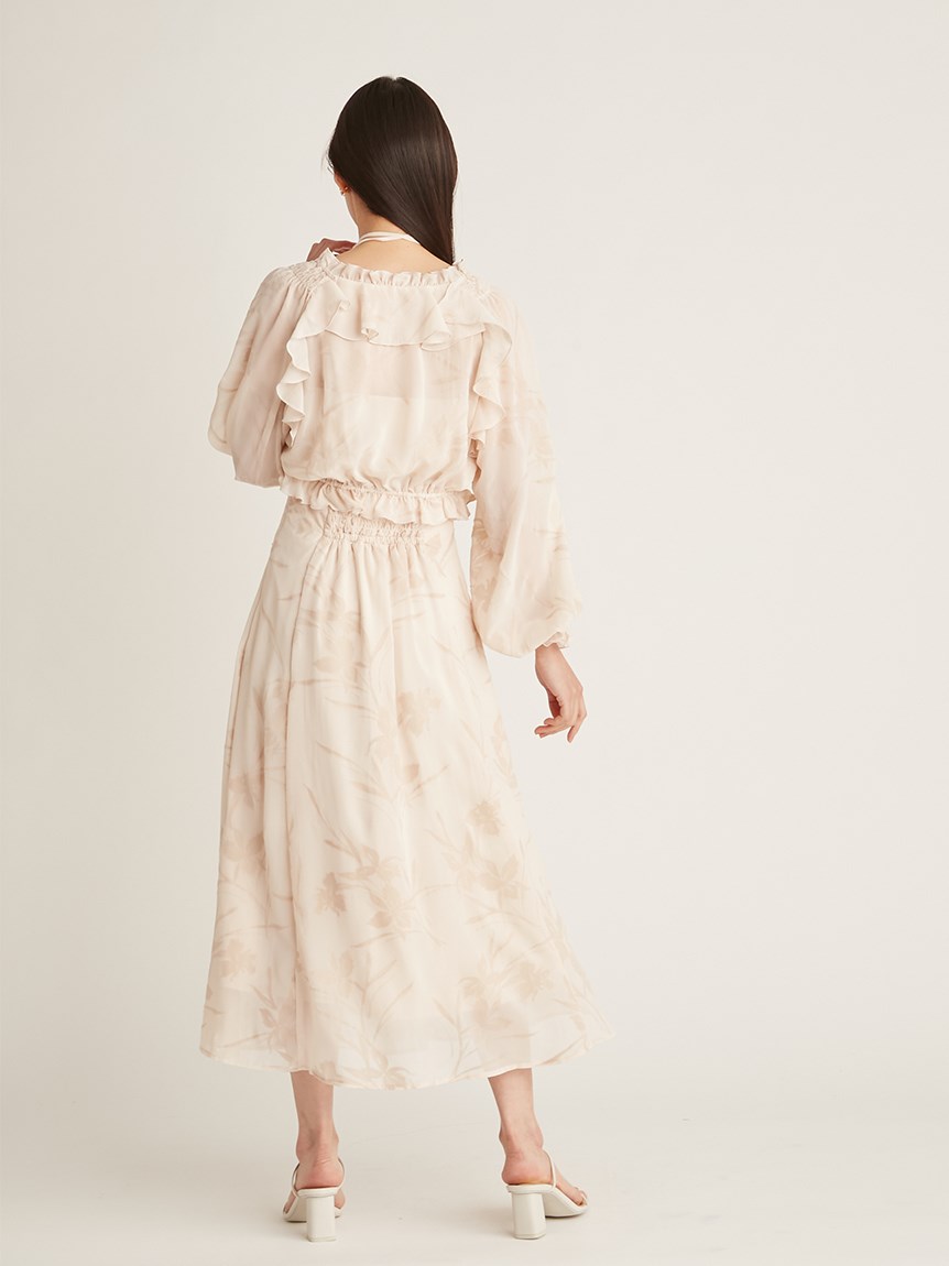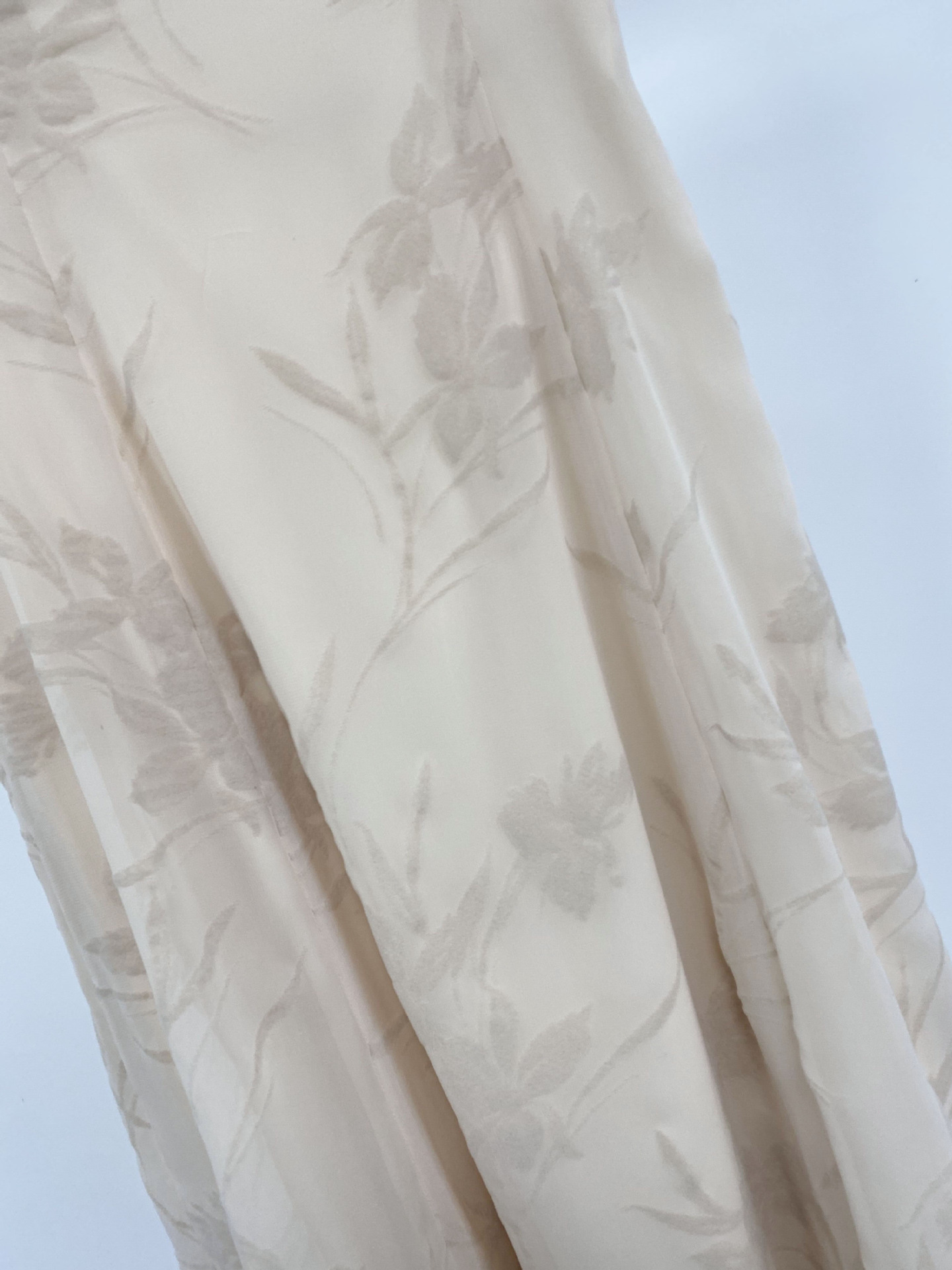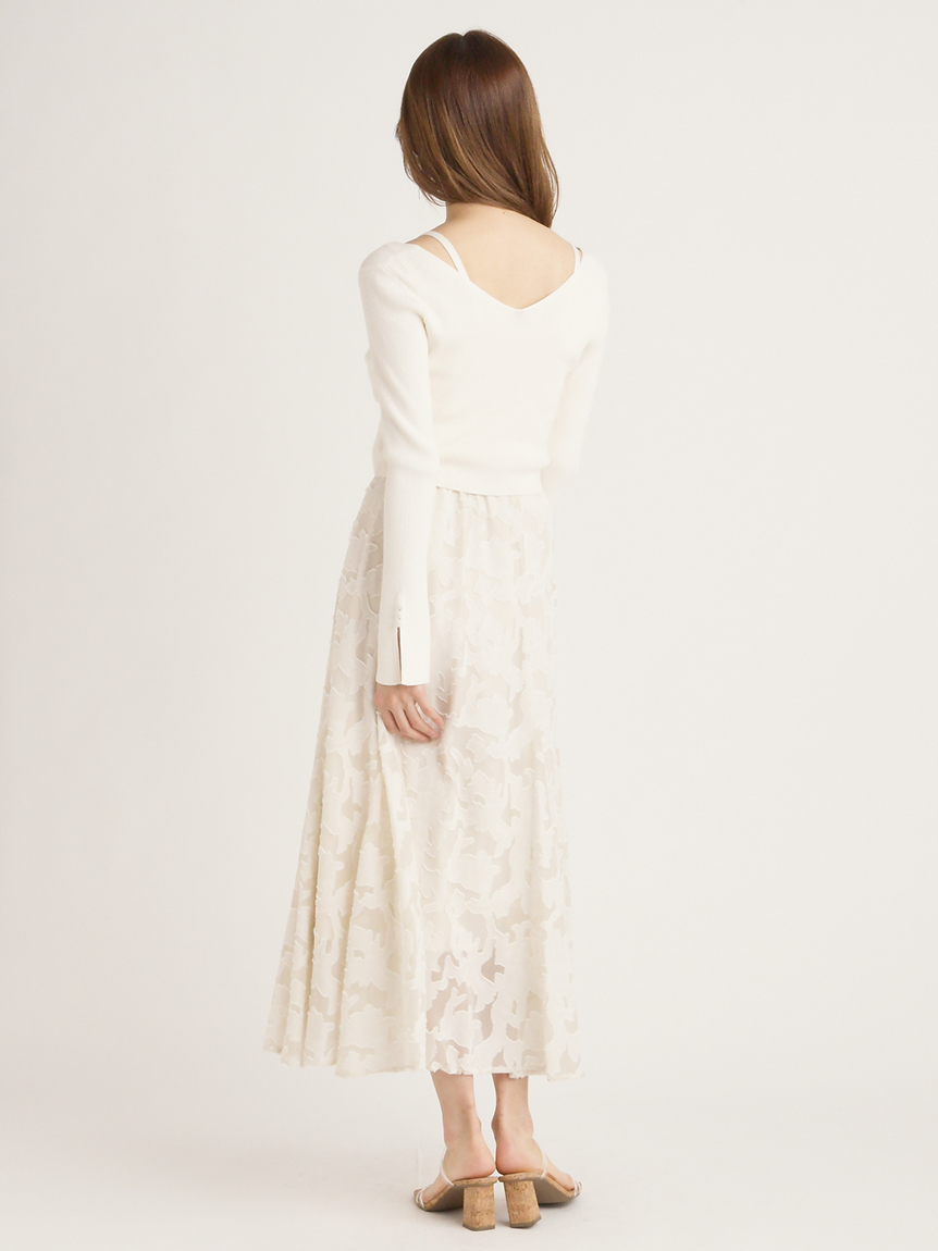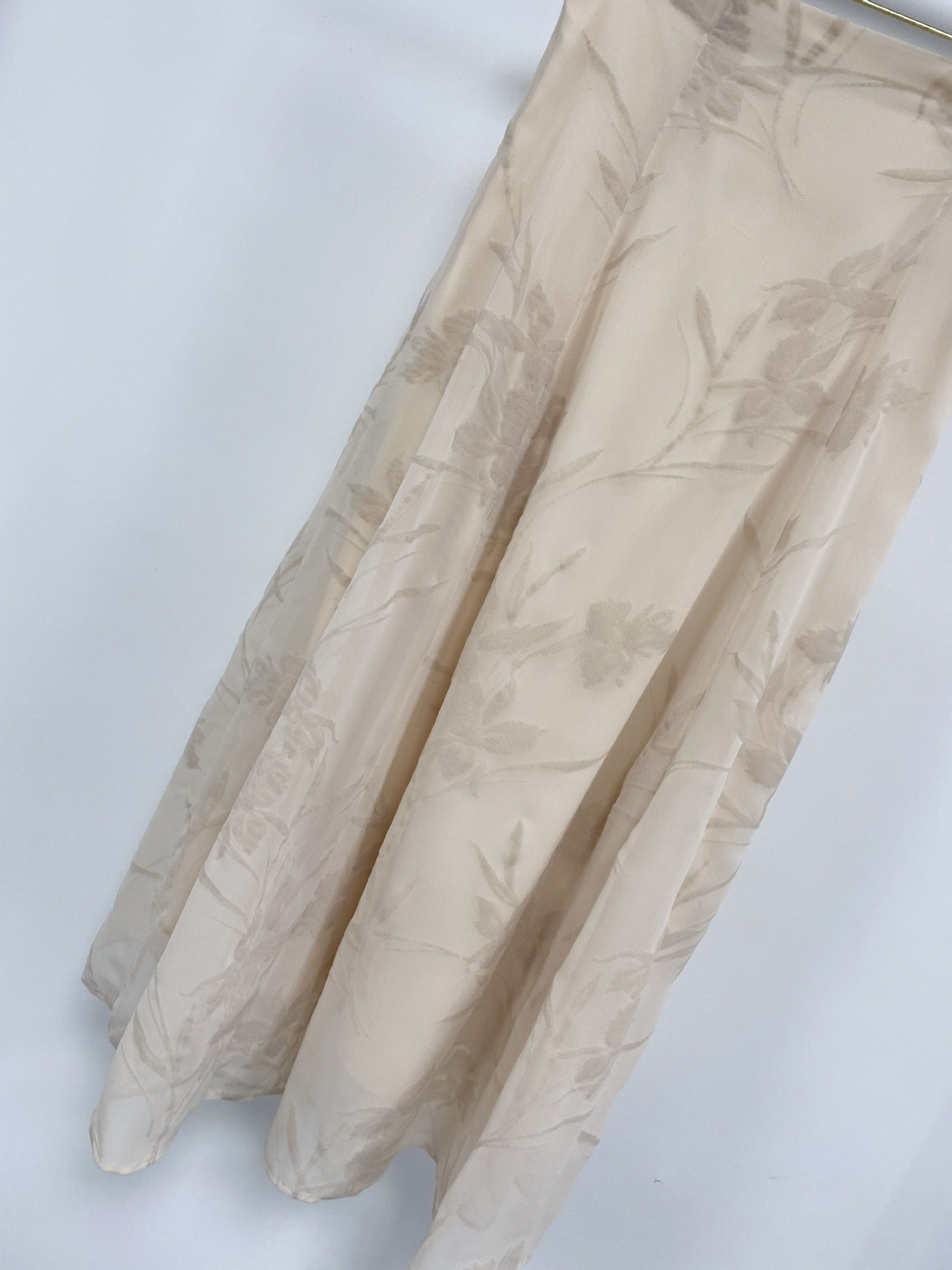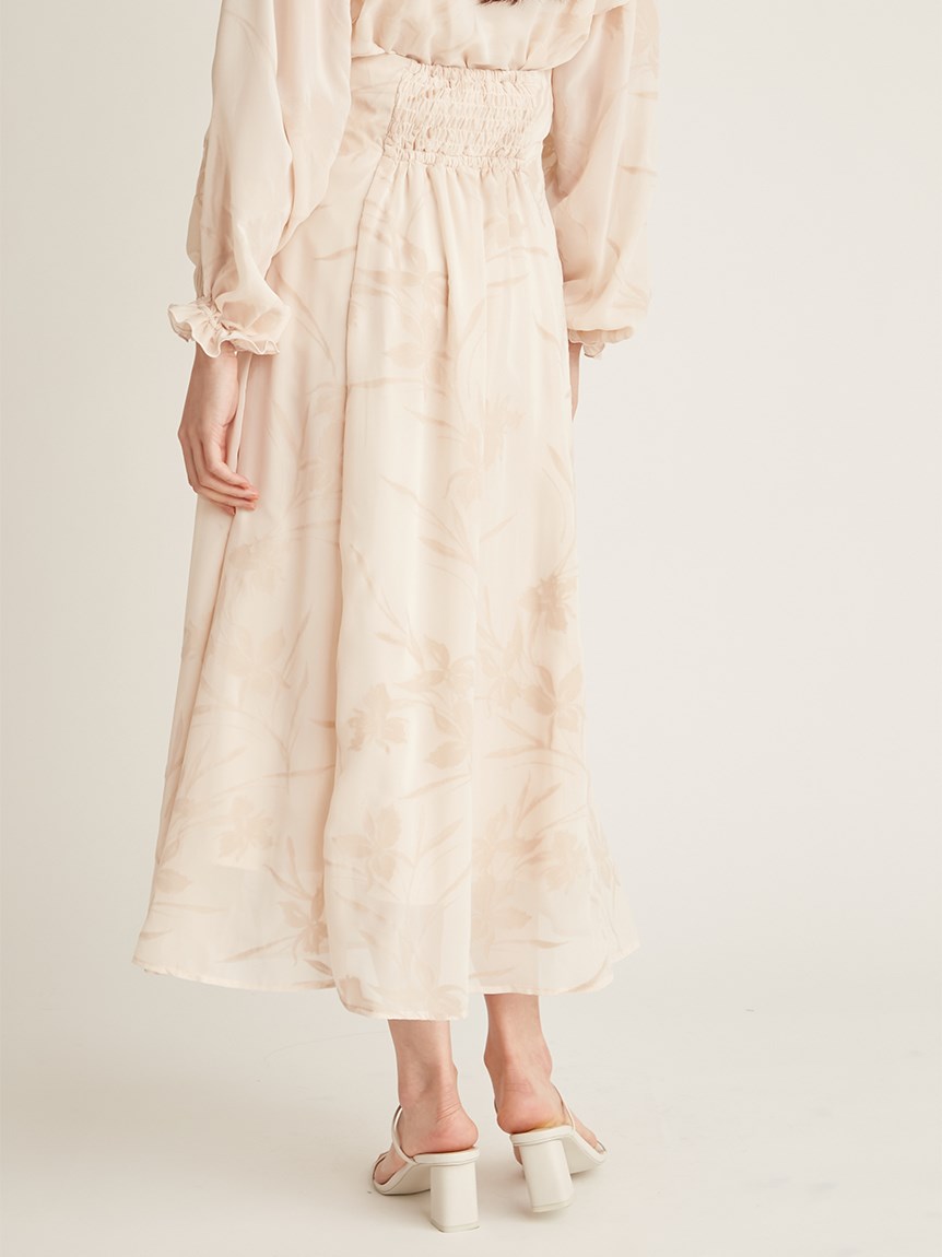 フロッキープリントで施されたフラワー模様が印象的な、フェミニンムード溢れるスカート。ほんのり透け感のある軽やかな素材感とひらりと広がるフレアラインが、シーズンムードを盛り上げています。ボディラインにすっきりと沿うハイウエストデザインで、スタイルアップ効果も◎。同シリーズのブラウス(SWFB231121)を合わせた、ワンピースライクなスタイリングがおすすめです。