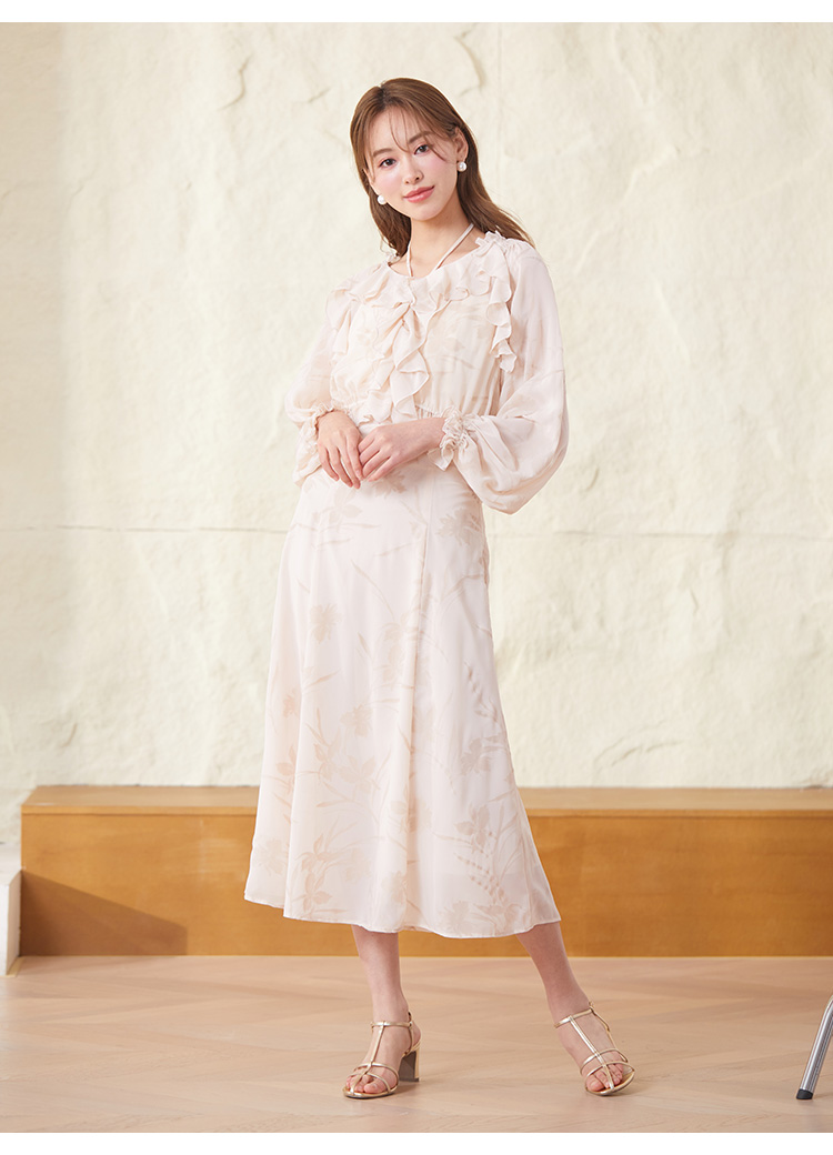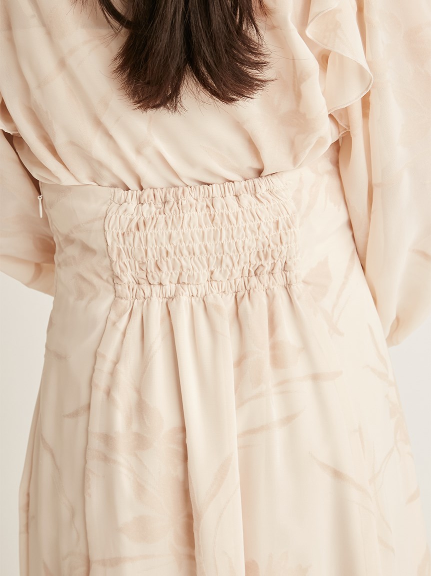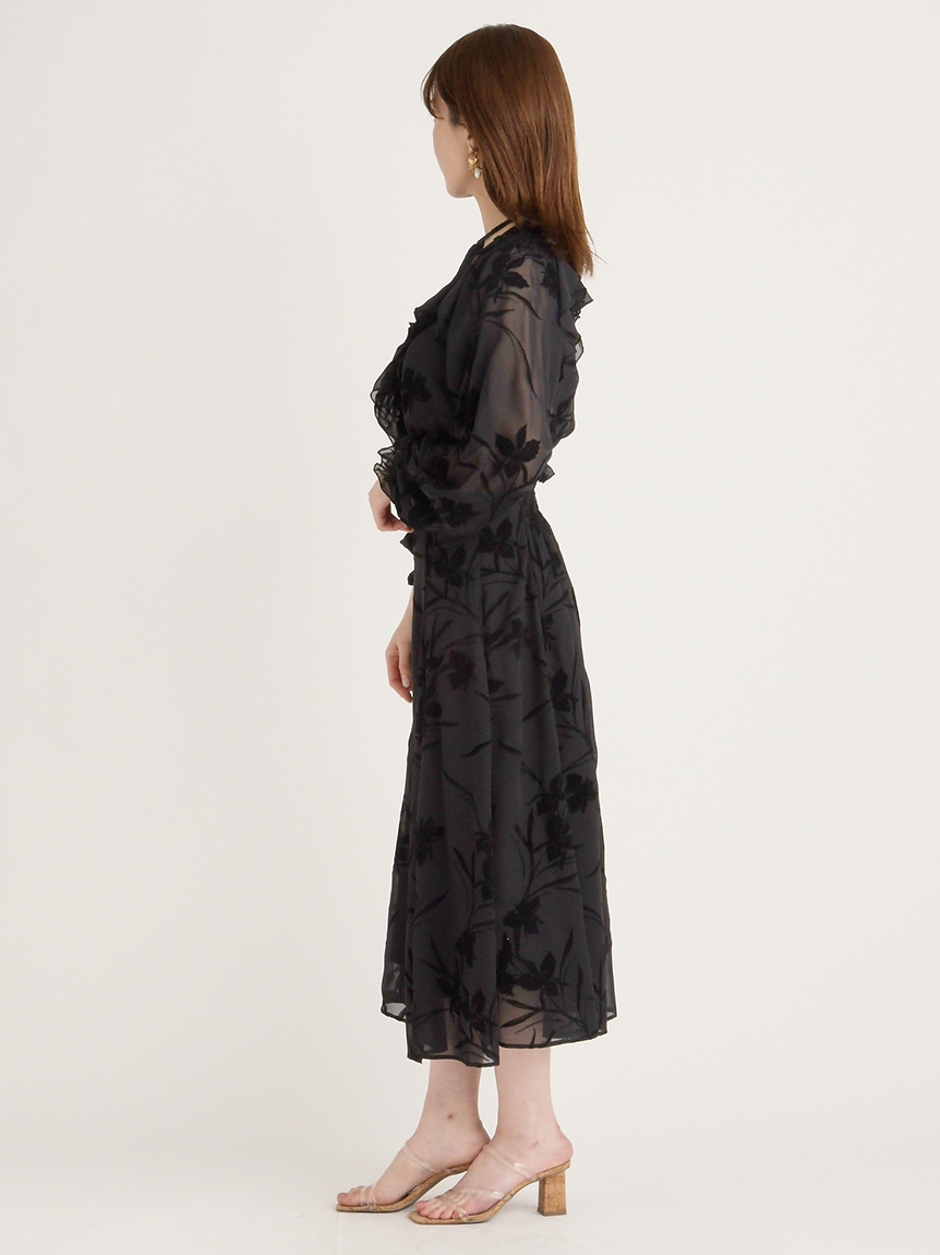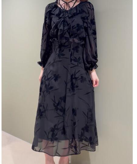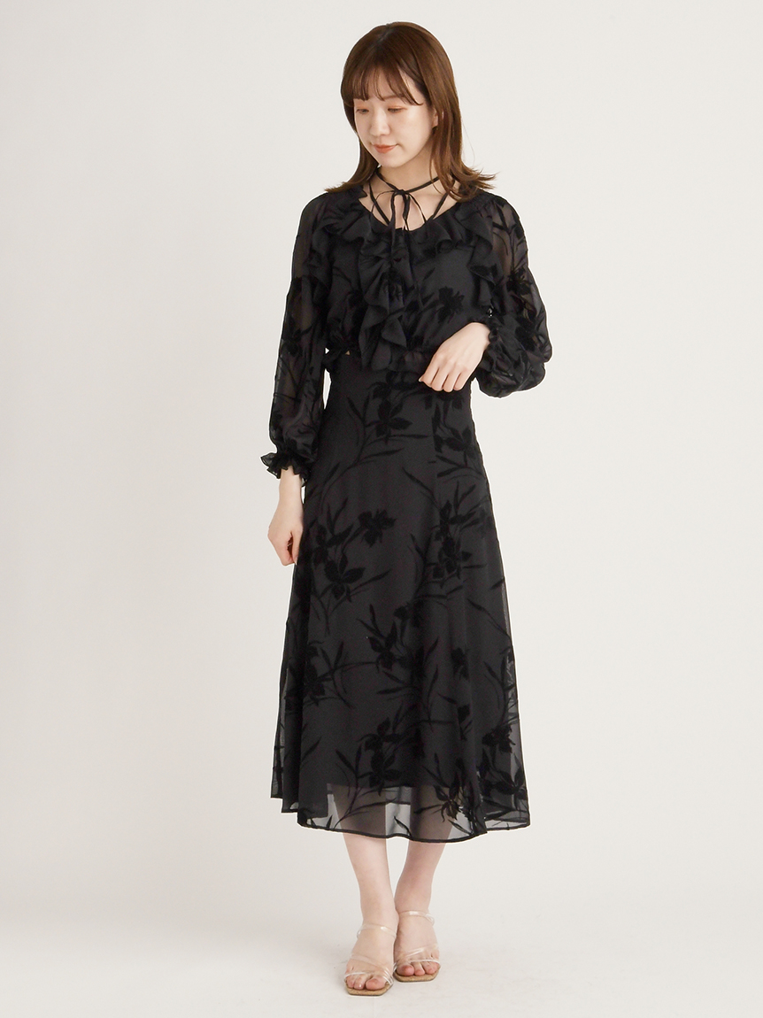シアーで軽やかな生地にフロッキープリントを施しました。淡い色合いが女性らしいアイボリーとピンクベージュ、シックな印象を与えるブラックの3色をご用意。