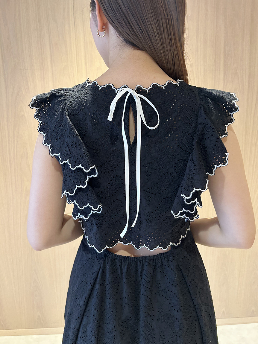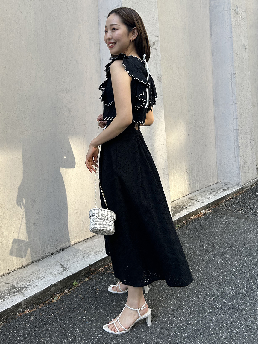 季節感漂うカットワークレースワンピースがWEB限定で登場!サイドを飾る大きなフリルが周囲の目を引くポイントに。バックスタイルは今季らしく、程よい肌見せの叶うデザインに仕上げました。スタイルが良く見えるようトップス部分をクロップド丈にし、スタイルアップを叶えました。