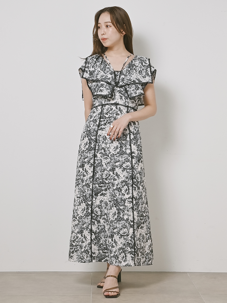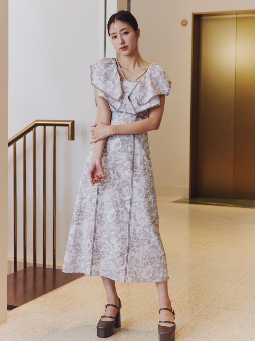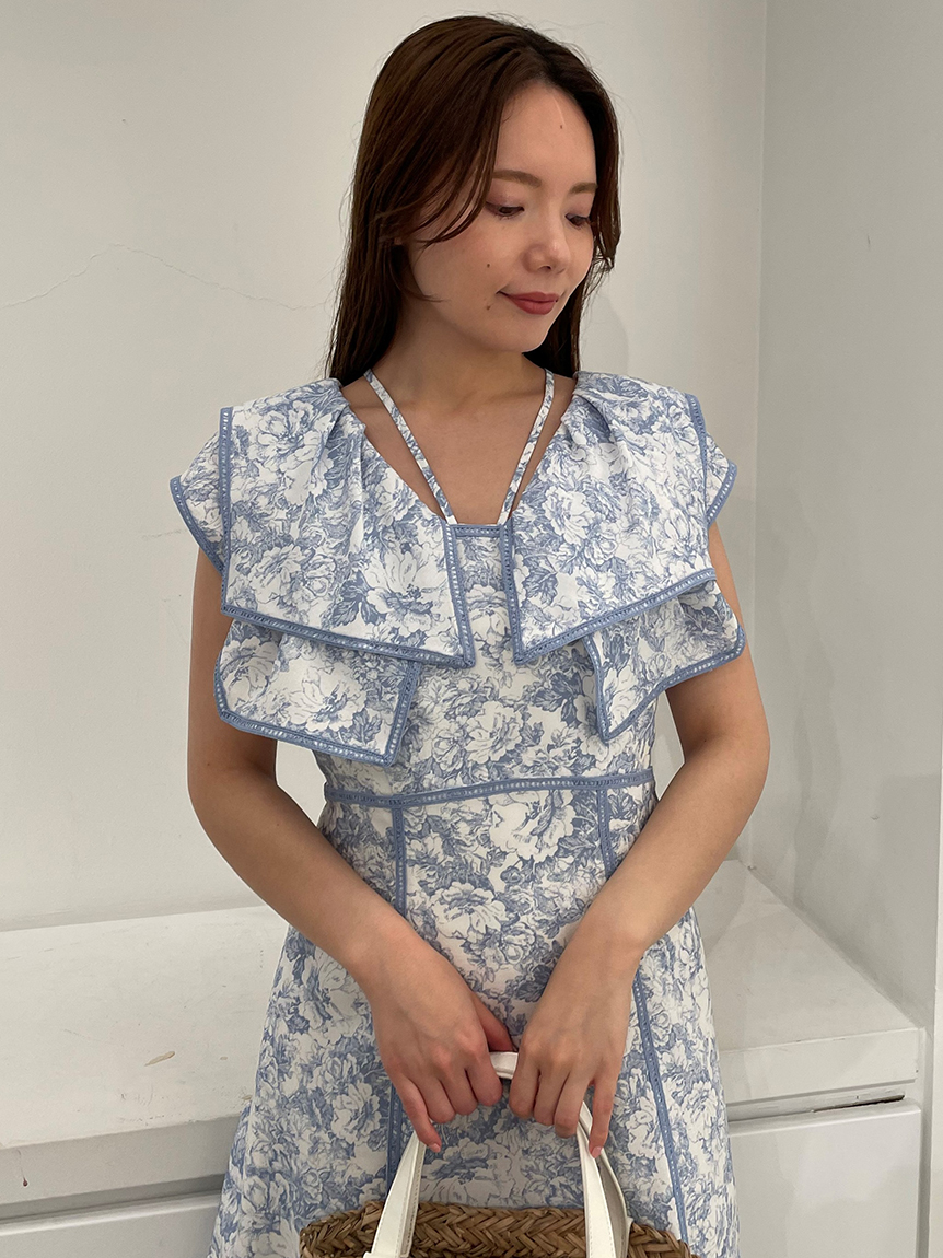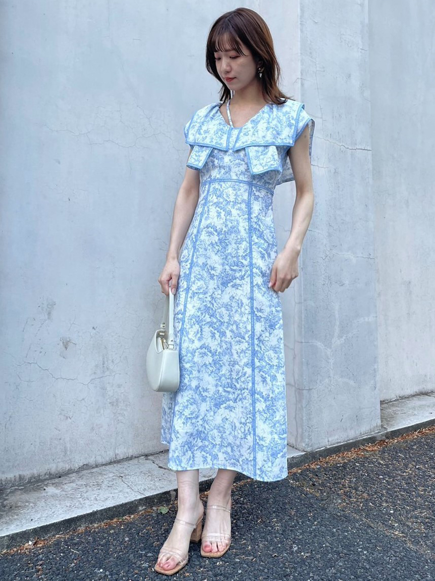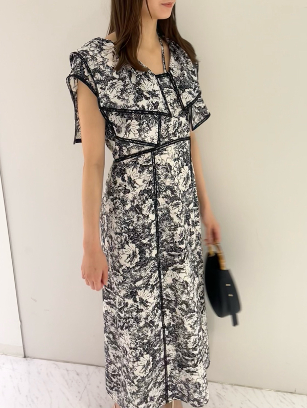人気のラッフルカラーワンピースがアップグレードして登場。フリルのバランスは今季らしく、更にレースのパイピングや大胆な花柄で華やかに仕上げました。袖は横から腕が見える幅を少し狭くしたことで、気になるパーツをカバー。ハイウエストの切り替えから裾に向かって緩やかに広がるAラインシルエットで、スタイルアップ効果は抜群です。