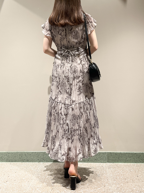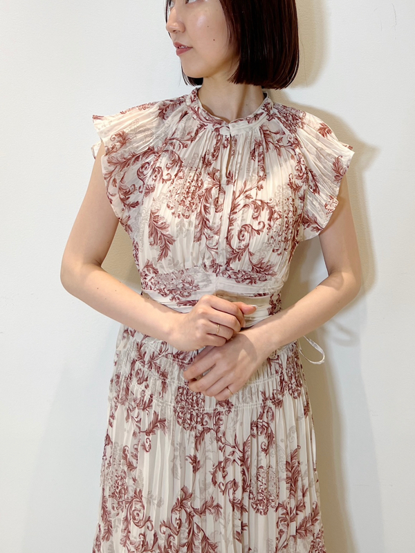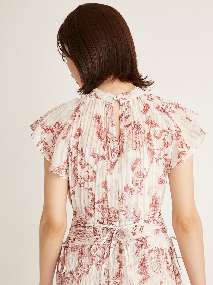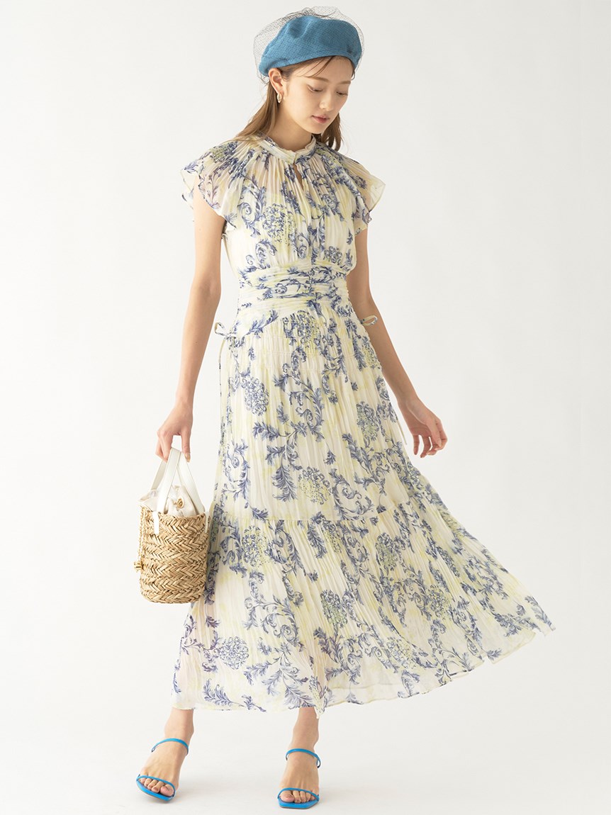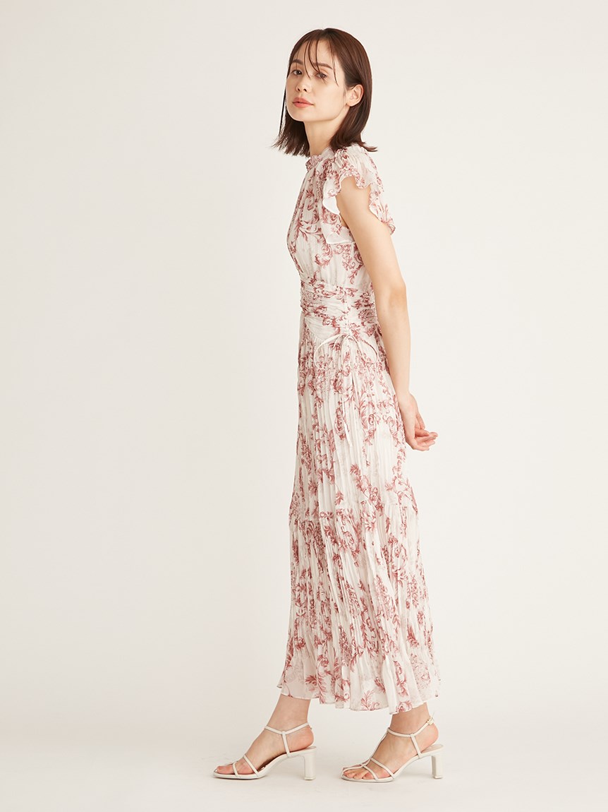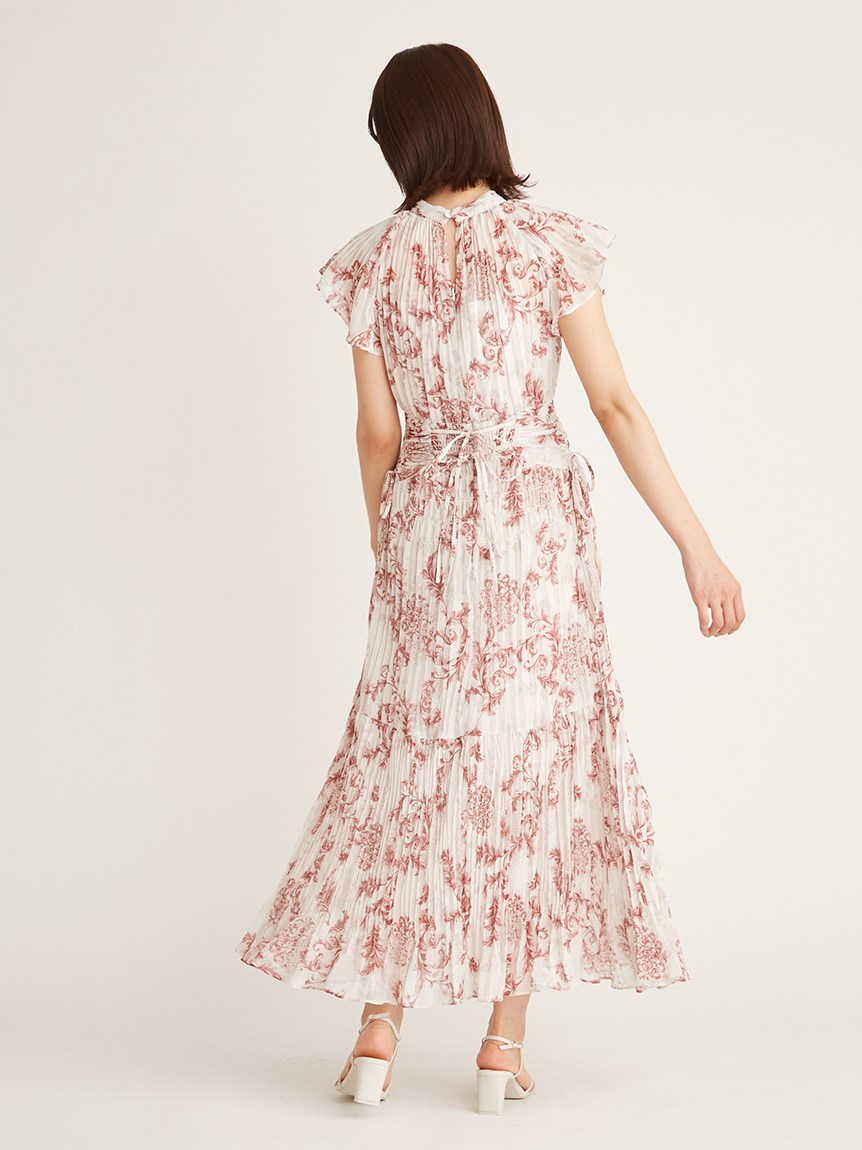 オリジナルのオーナメントプリントを浮かべた、春ムード薫るワンピース。全体にプリーツをふんだんに施すことで華やかさが高まり、主役級の存在感を放つ1着です。ウエスト部分にコルセットのような切り替えを入れ、スタイルアップ効果の高いメリハリシルエットに。バックウエストのレースアップで絞り方を調節でき、シルエットの変化も楽しめます。