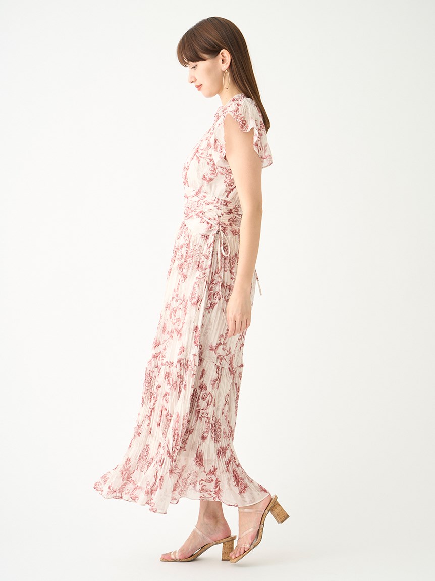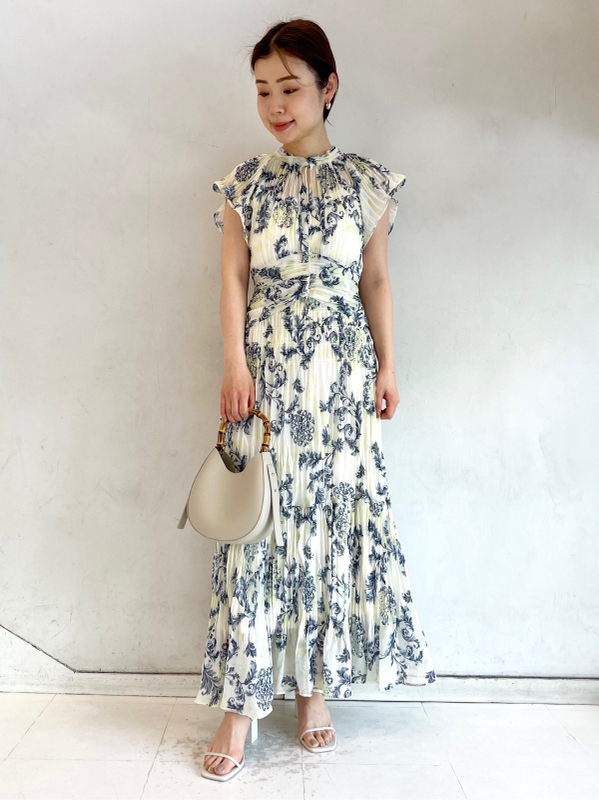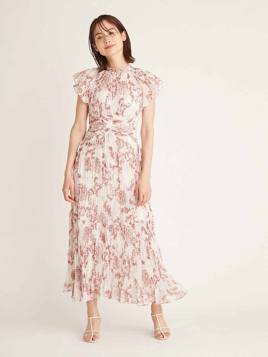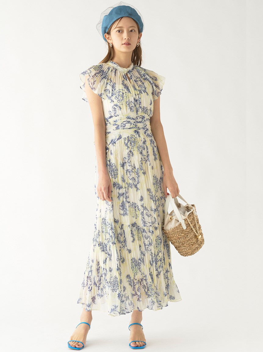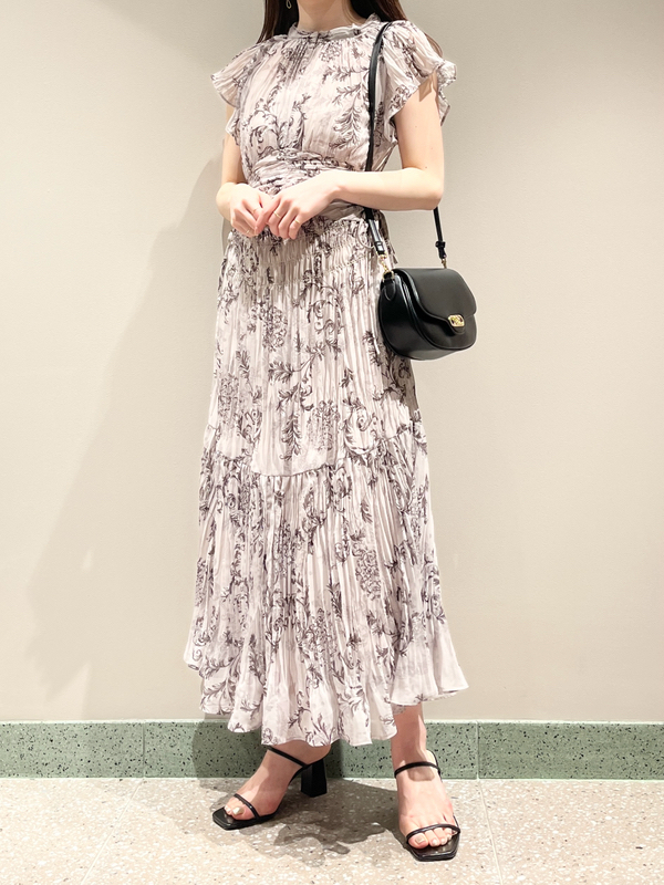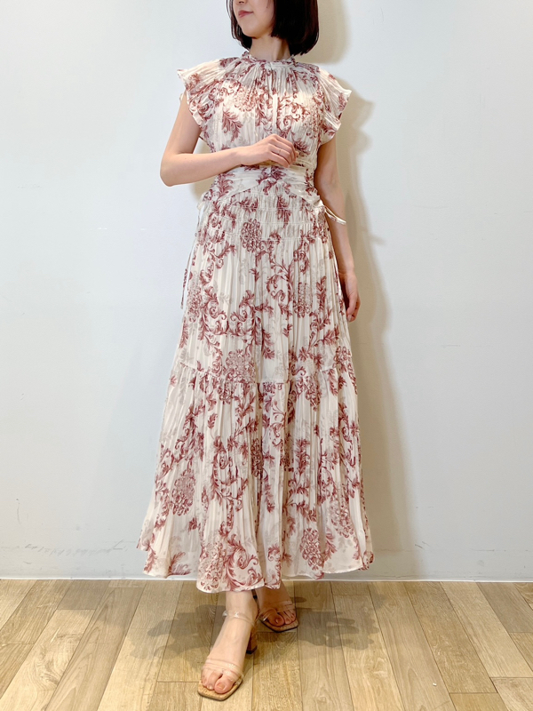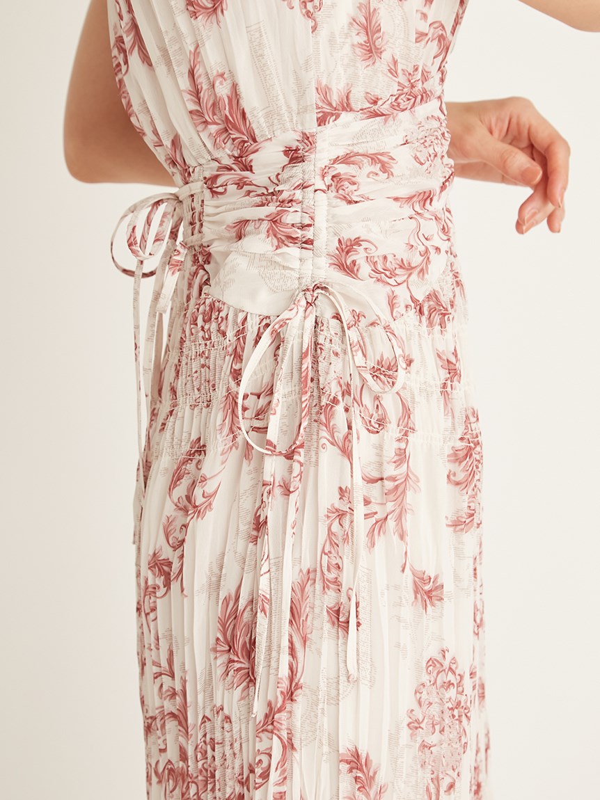 オリジナルのオーナメントプリントを浮かべた、春ムード薫るワンピース。全体にプリーツをふんだんに施すことで華やかさが高まり、主役級の存在感を放つ1着です。ウエスト部分にコルセットのような切り替えを入れ、スタイルアップ効果の高いメリハリシルエットに。バックウエストのレースアップで絞り方を調節でき、シルエットの変化も楽しめます。