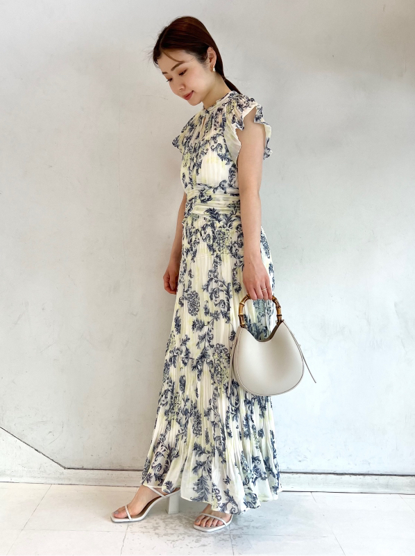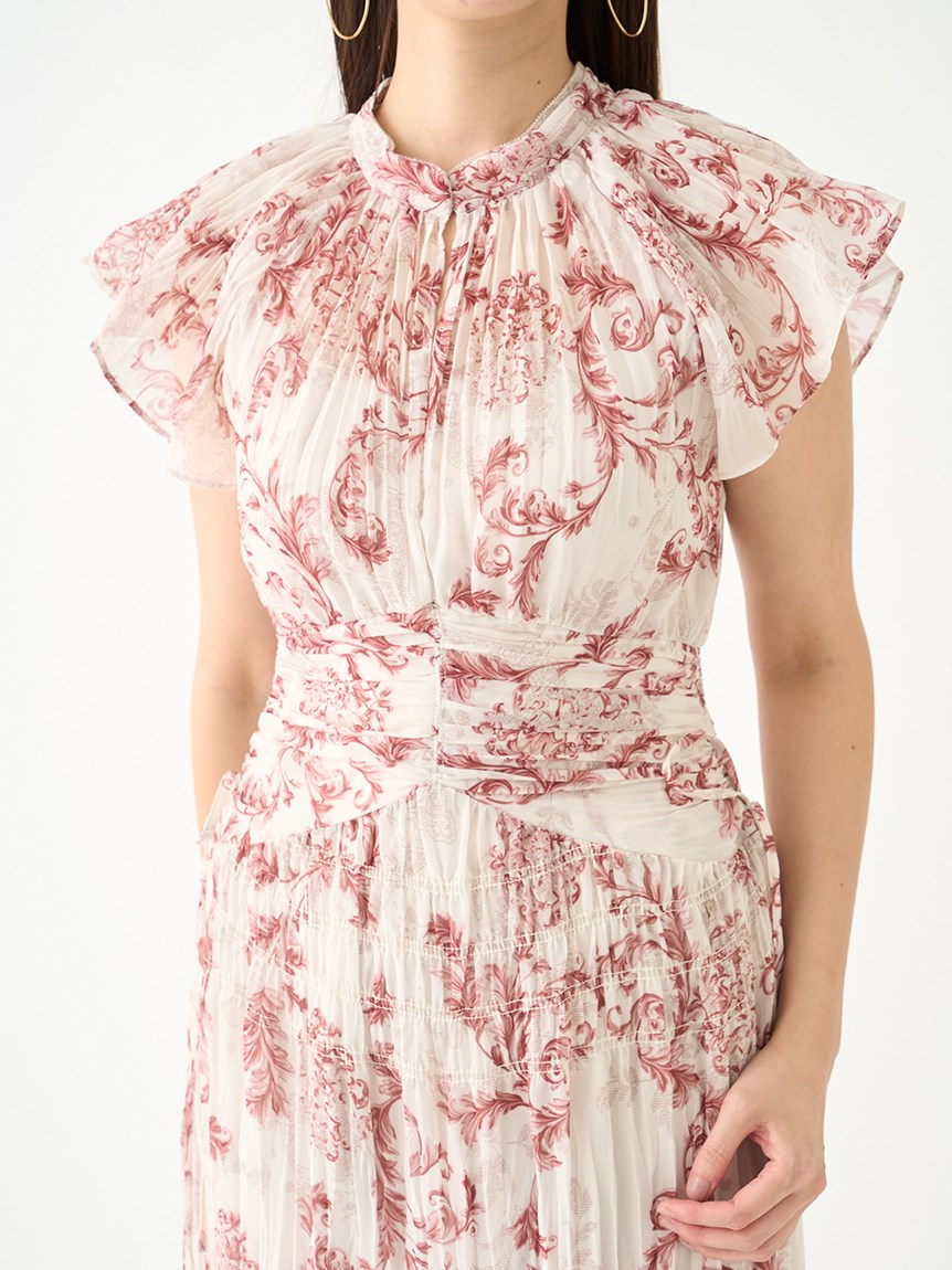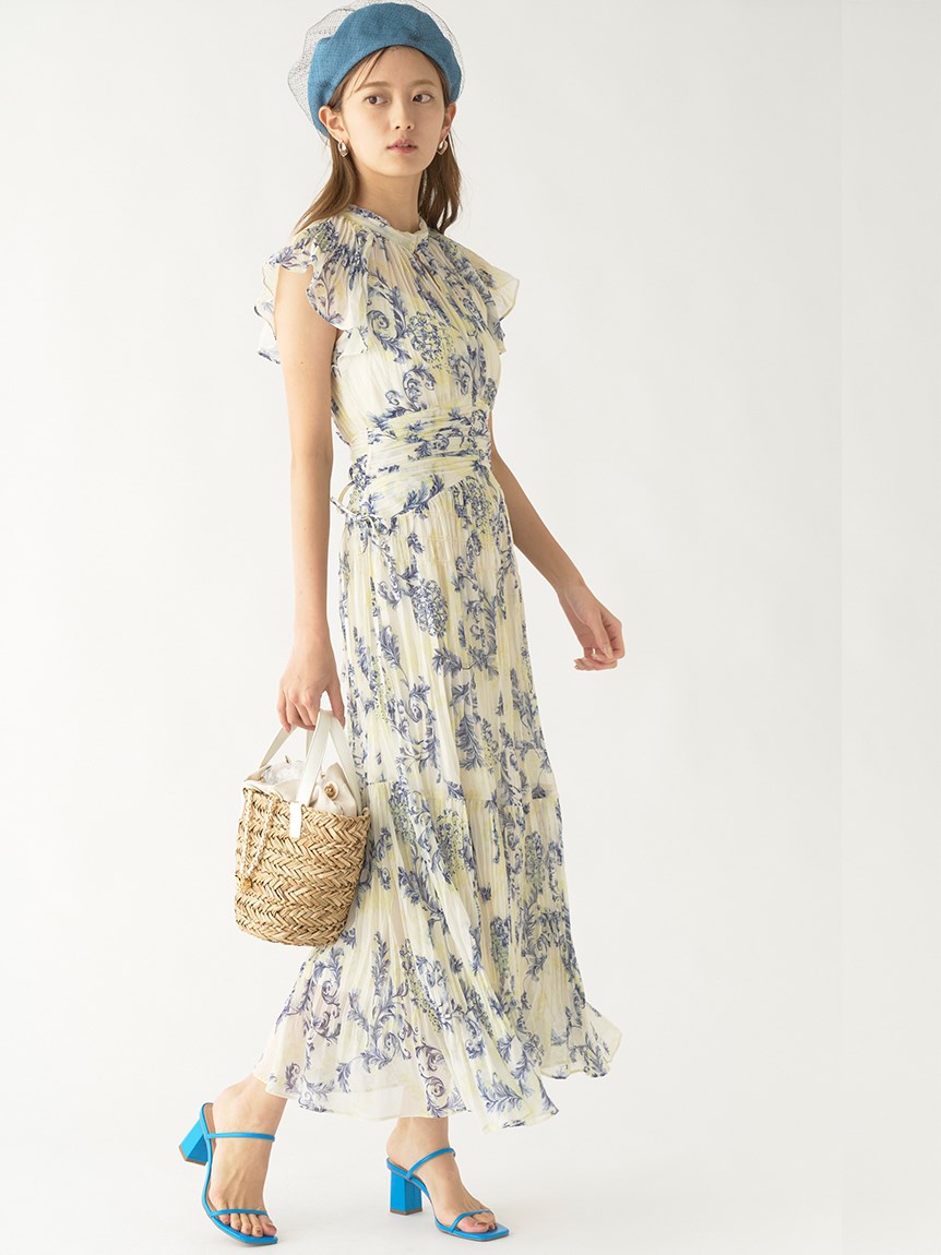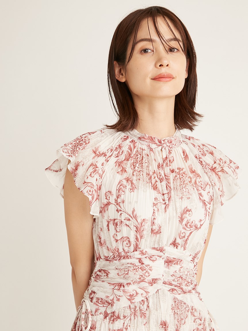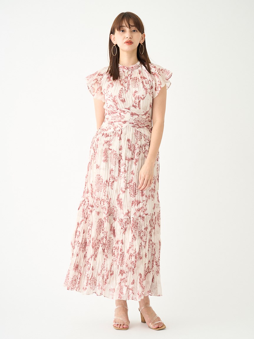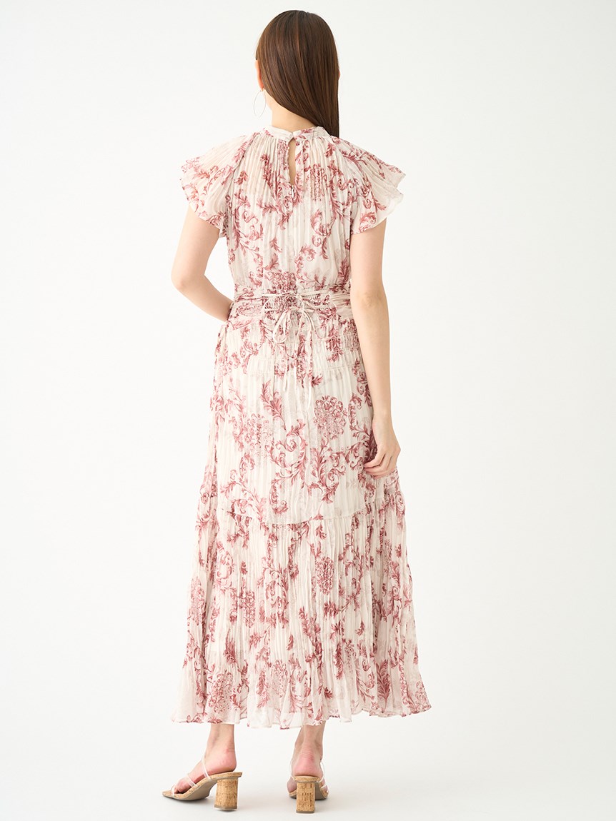 オリジナルのオーナメントプリントを浮かべた、春ムード薫るワンピース。全体にプリーツをふんだんに施すことで華やかさが高まり、主役級の存在感を放つ1着です。ウエスト部分にコルセットのような切り替えを入れ、スタイルアップ効果の高いメリハリシルエットに。バックウエストのレースアップで絞り方を調節でき、シルエットの変化も楽しめます。