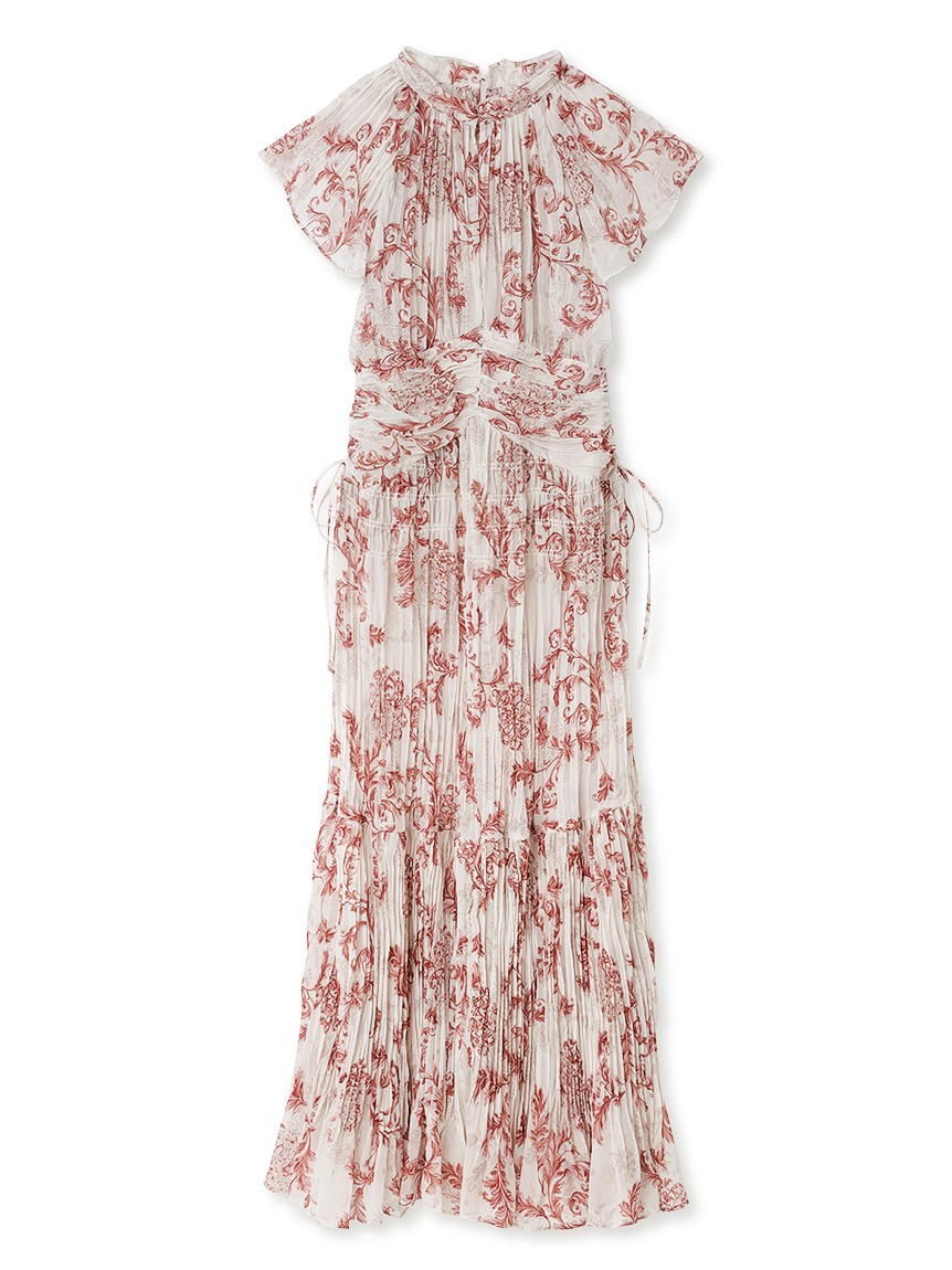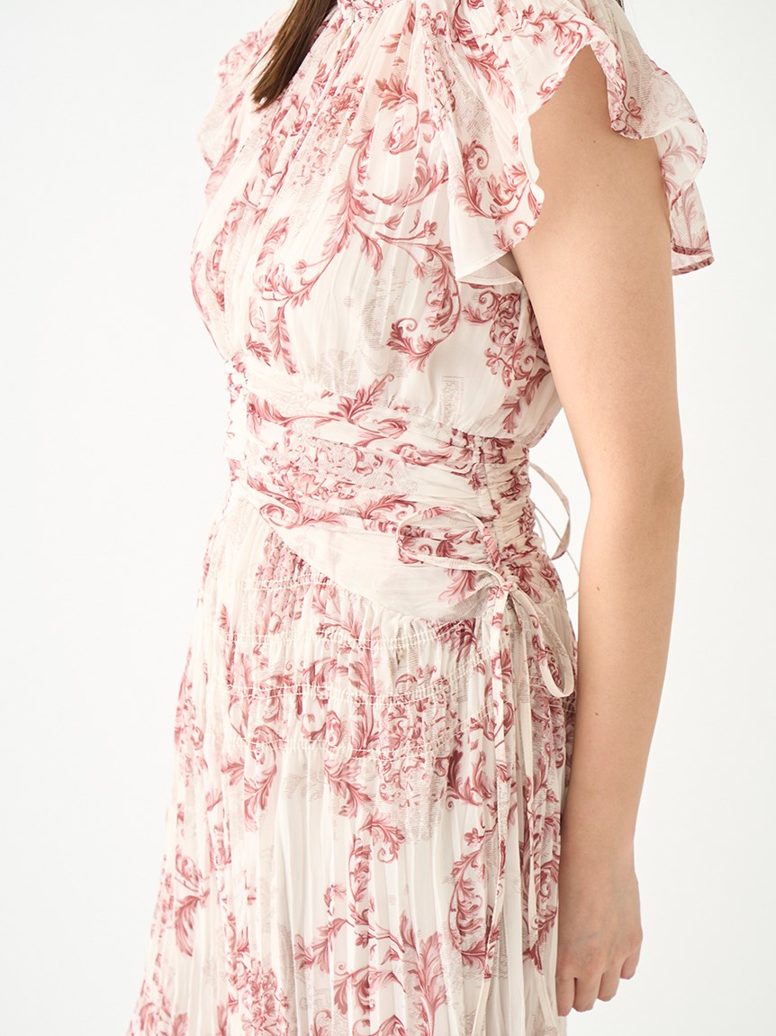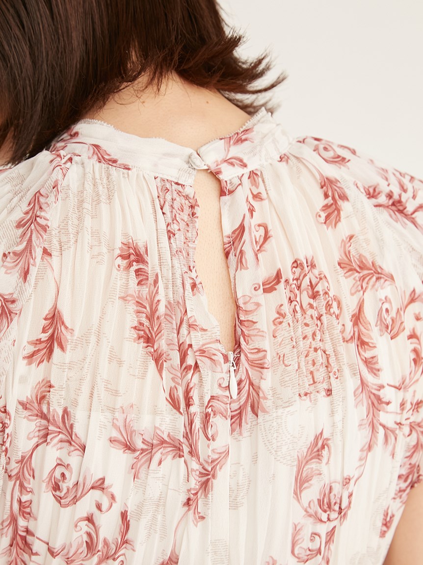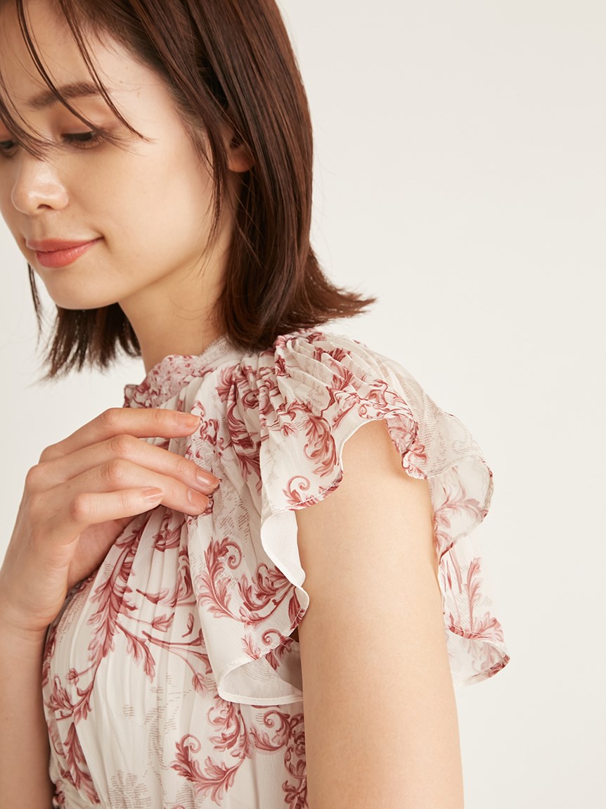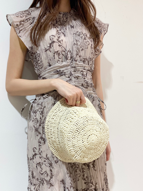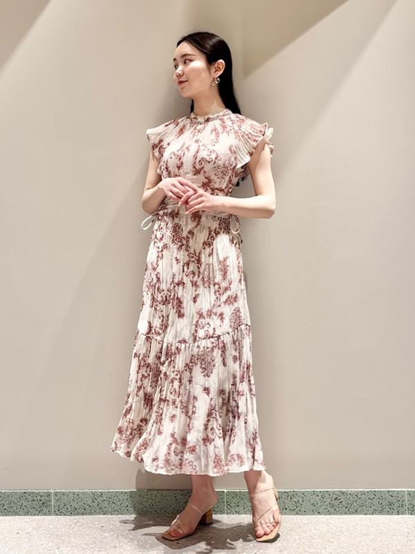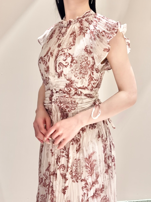 オリジナルのオーナメントプリントを浮かべた、春ムード薫るワンピース。全体にプリーツをふんだんに施すことで華やかさが高まり、主役級の存在感を放つ1着です。ウエスト部分にコルセットのような切り替えを入れ、スタイルアップ効果の高いメリハリシルエットに。バックウエストのレースアップで絞り方を調節でき、シルエットの変化も楽しめます。