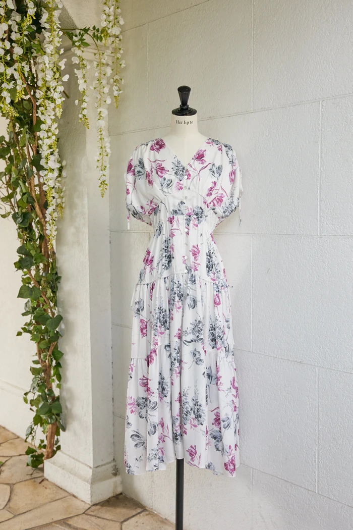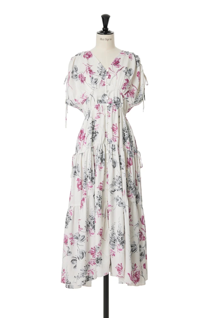 昨年ご好評いただいたHer lip toオリジナルのフローラルプリントを絶妙な配色で表現したドラマティックなロングドレスから、エレガントな新色が登場。