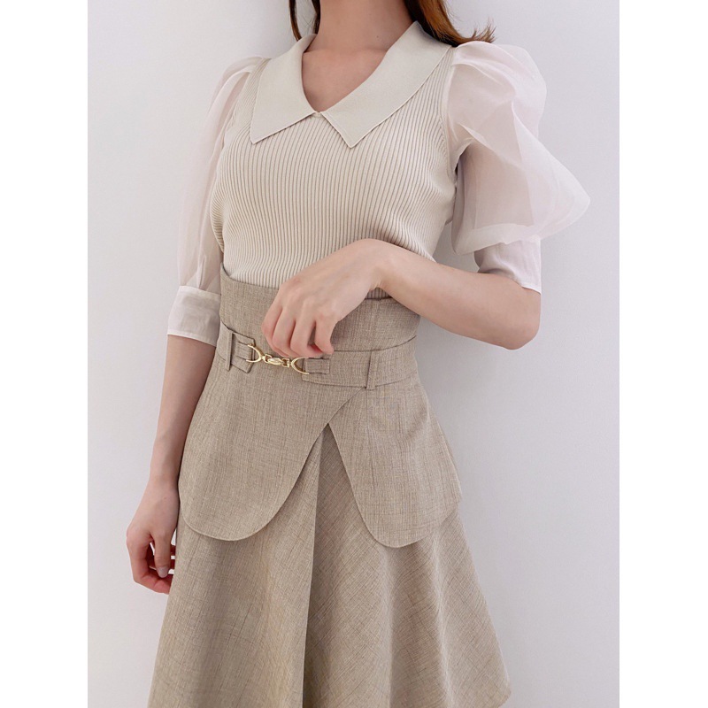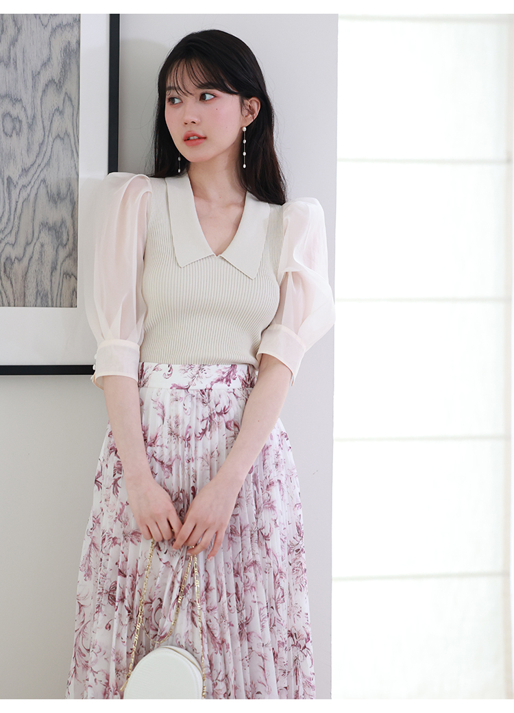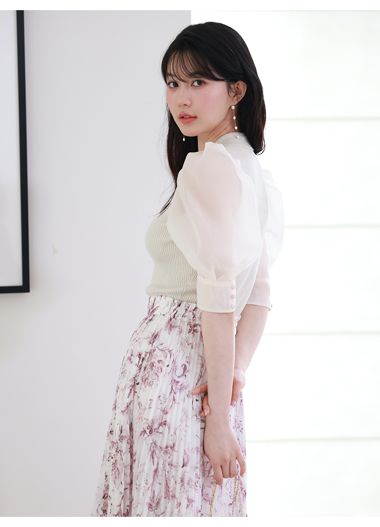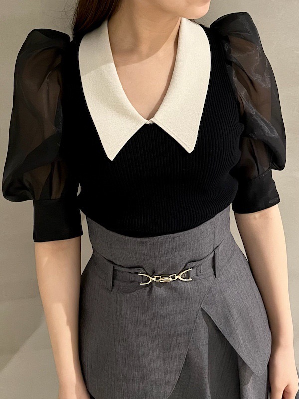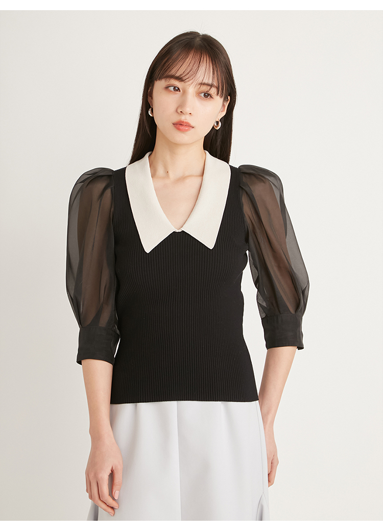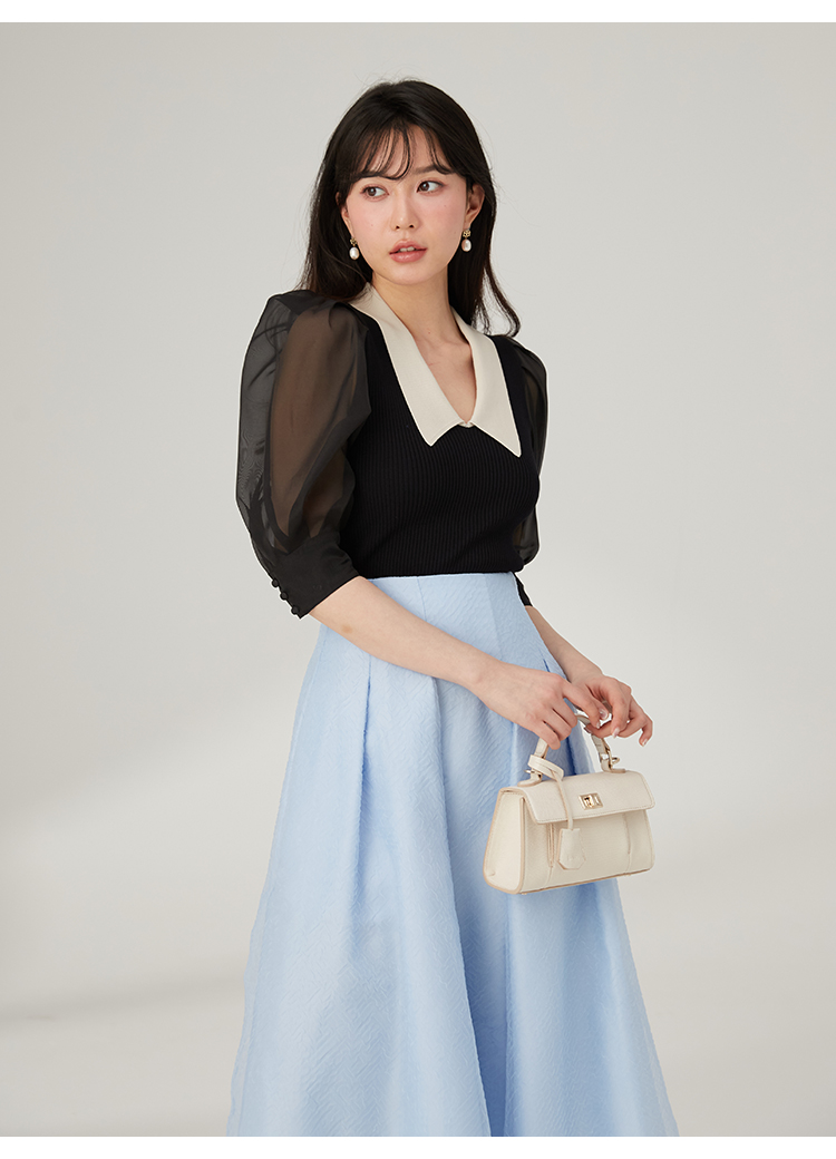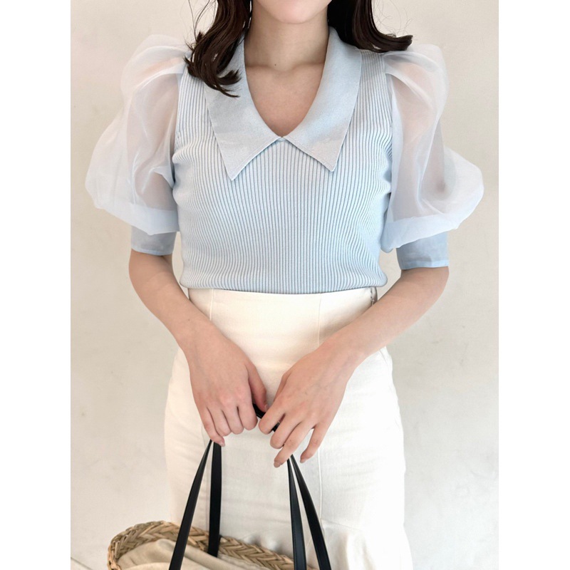 エコレーヨンを用いたサステナブルなニットとシアー素材を組み合わせました。優しい色合いのアイボリー、バイカラーでモード感のあるブラック、春夏らしい爽やかなサックスの3色をご用意。