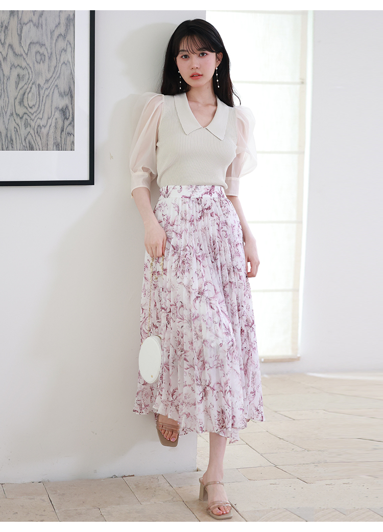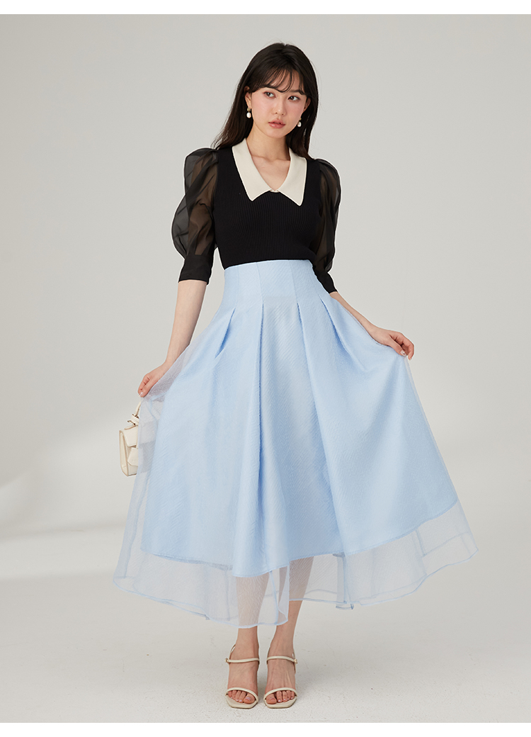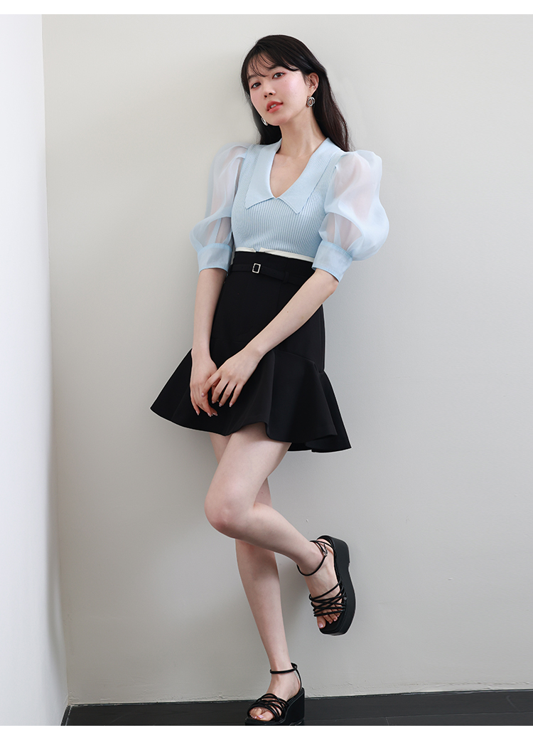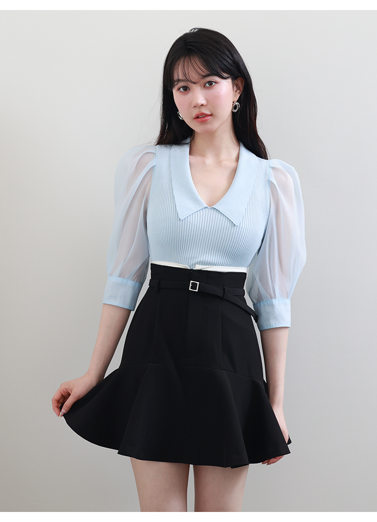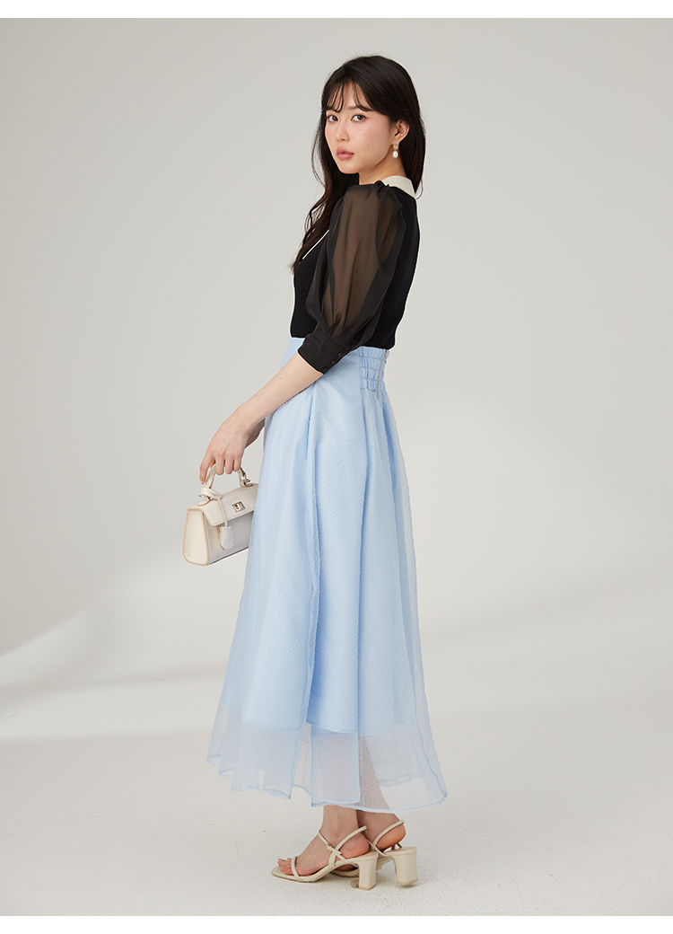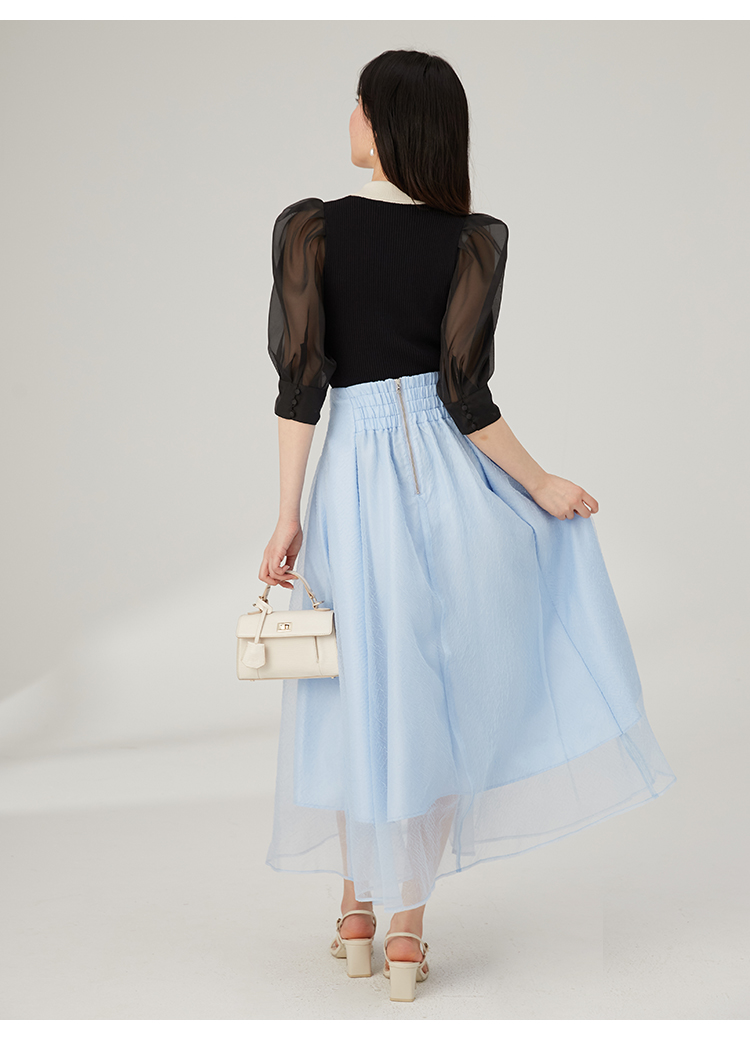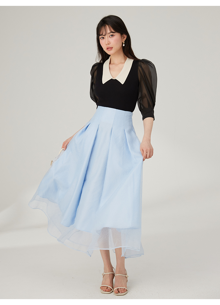 エコレーヨンを用いたサステナブルなニットとシアー素材を組み合わせました。優しい色合いのアイボリー、バイカラーでモード感のあるブラック、春夏らしい爽やかなサックスの3色をご用意。