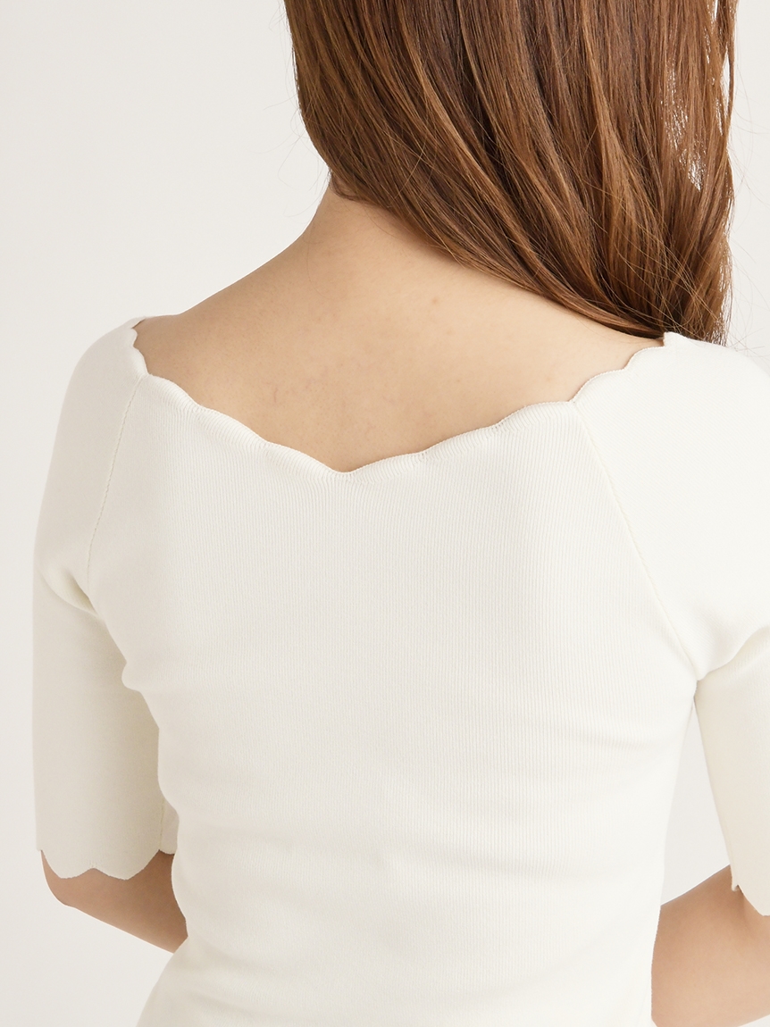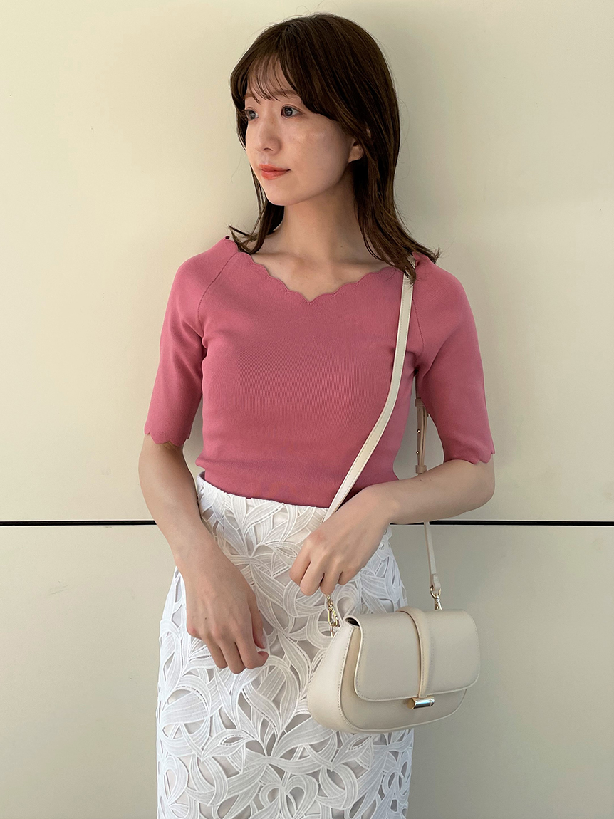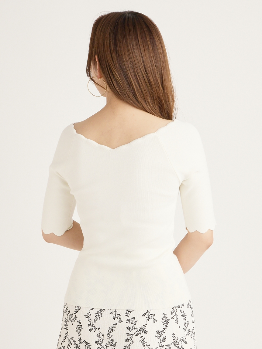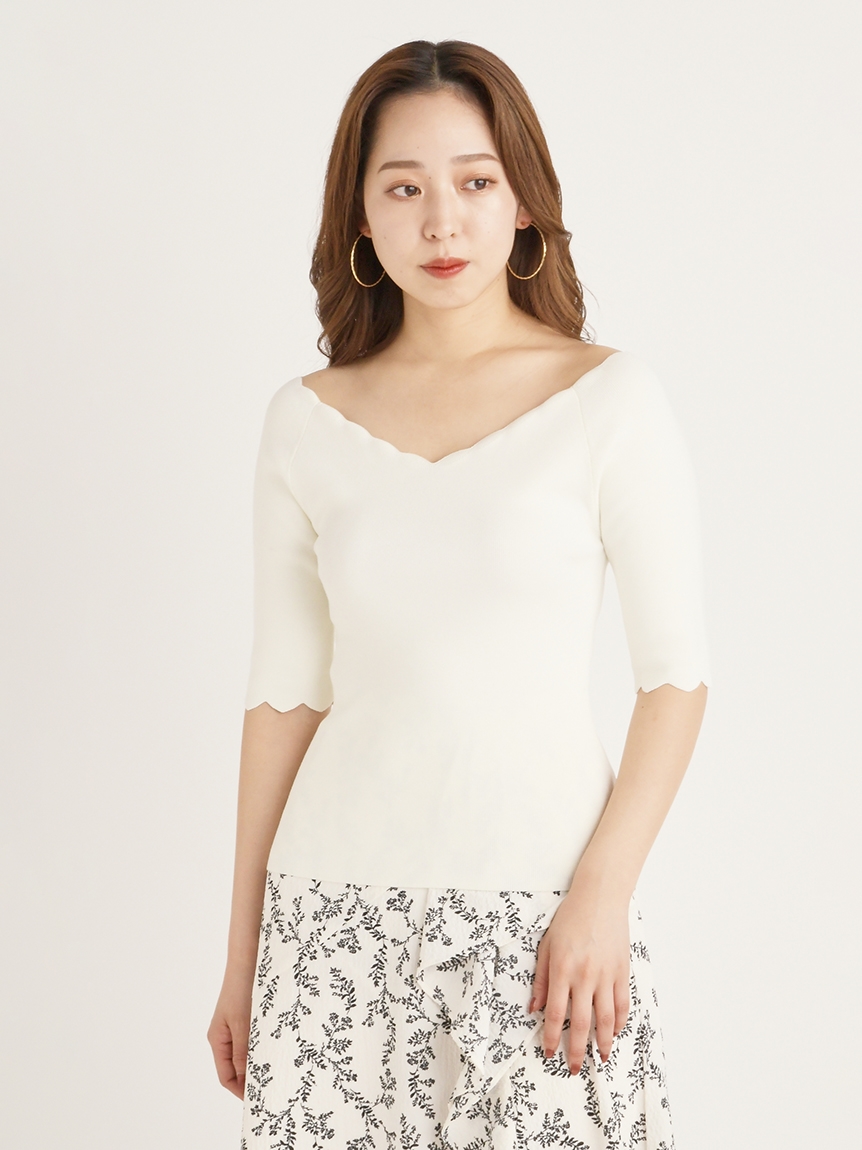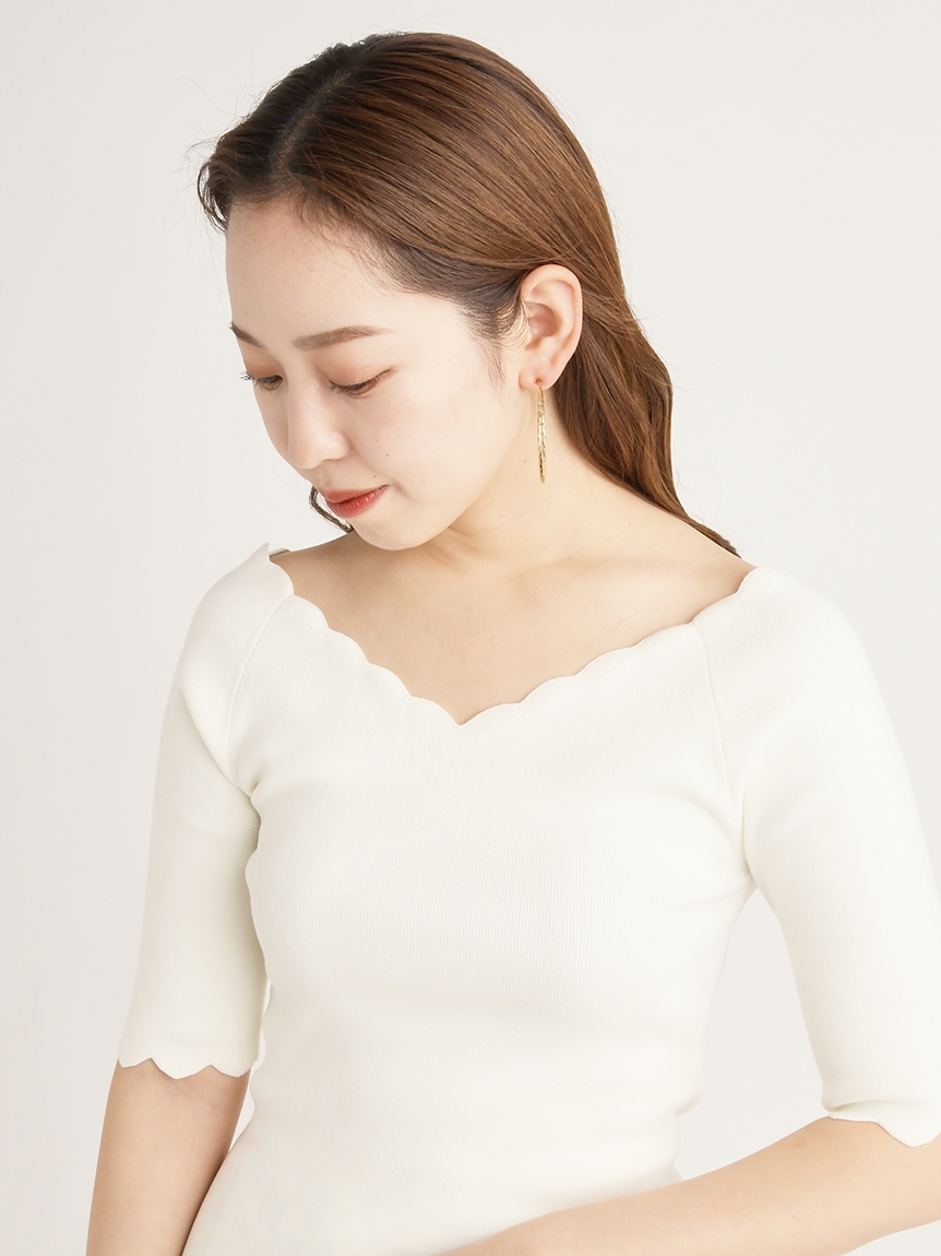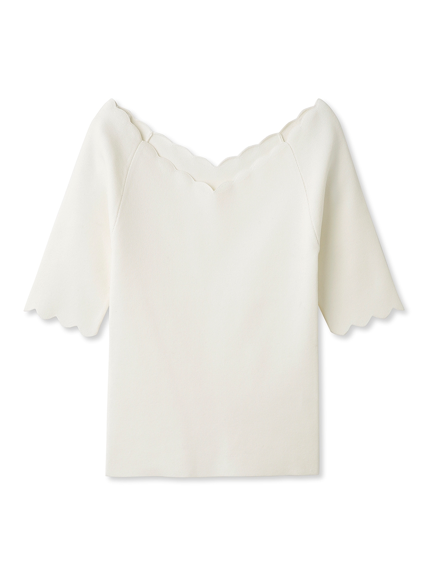 スカラップカットした襟ぐり&袖口が特徴的な、シンプルながらも女性らしさを感じさせるニットトップス。広めに開いたネックラインでヘルシーに肌見せでき、トレンド感をプラスしました。ボディラインを美しく見せるタイトシルエットも◎。スカートからパンツまで幅広いボトムと合わせやすく、着まわし力も抜群です。
