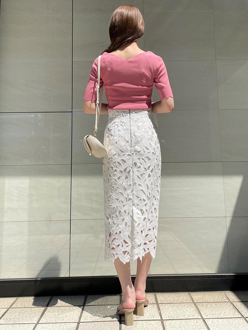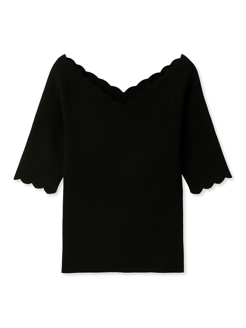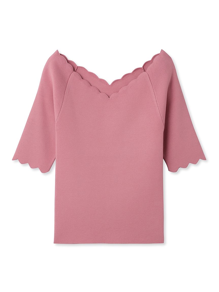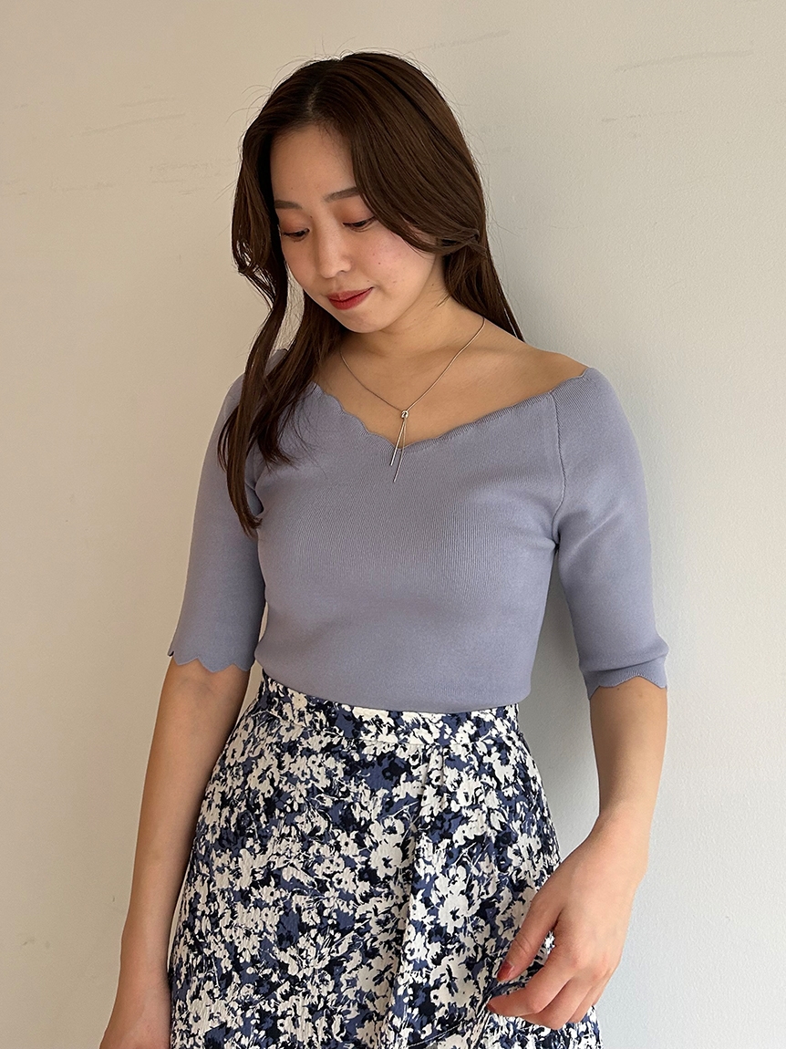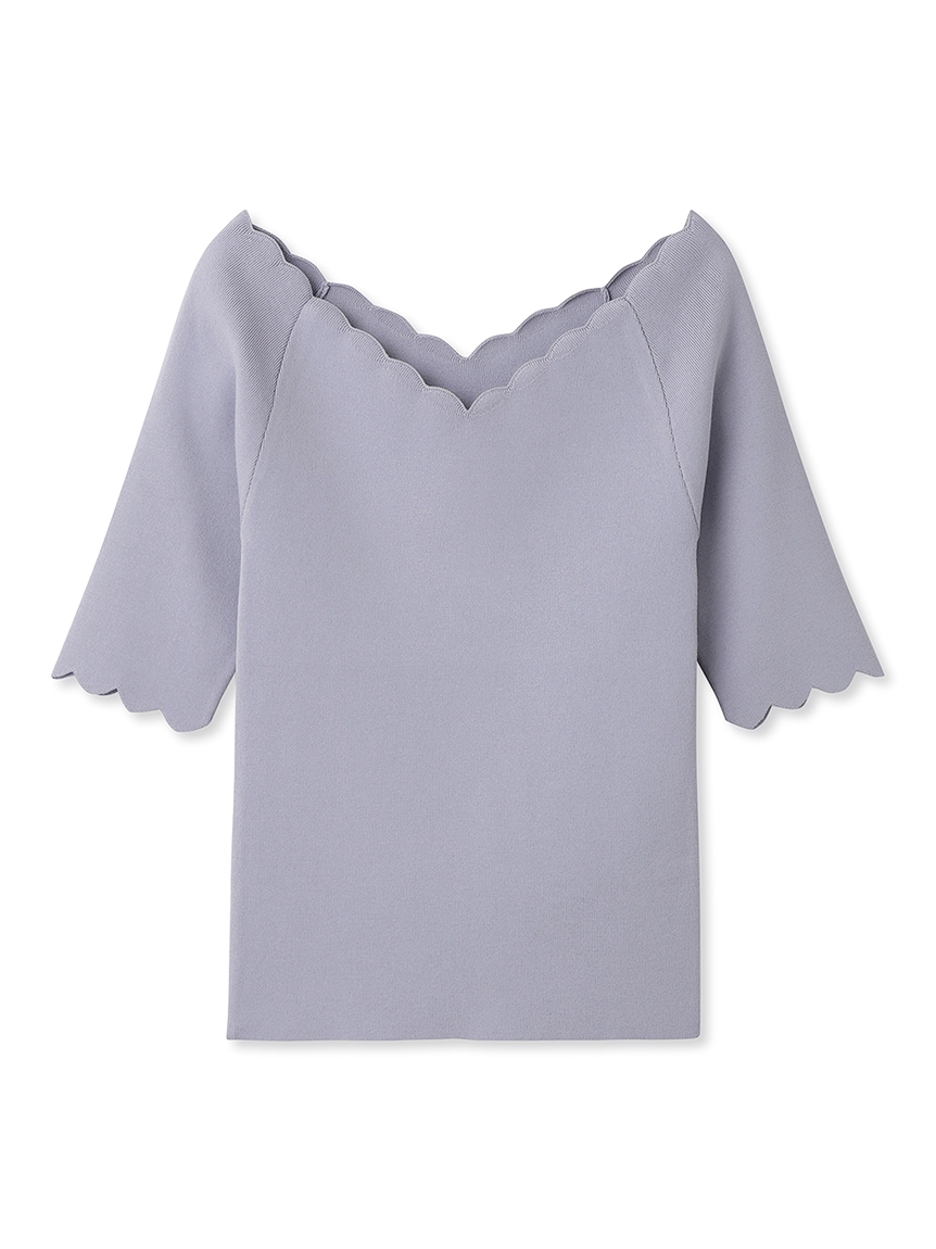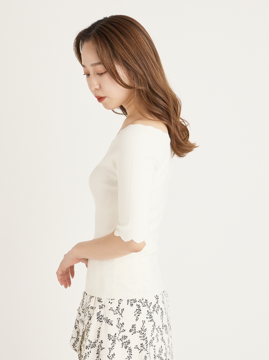 スカラップカットした襟ぐり&袖口が特徴的な、シンプルながらも女性らしさを感じさせるニットトップス。広めに開いたネックラインでヘルシーに肌見せでき、トレンド感をプラスしました。ボディラインを美しく見せるタイトシルエットも◎。スカートからパンツまで幅広いボトムと合わせやすく、着まわし力も抜群です。