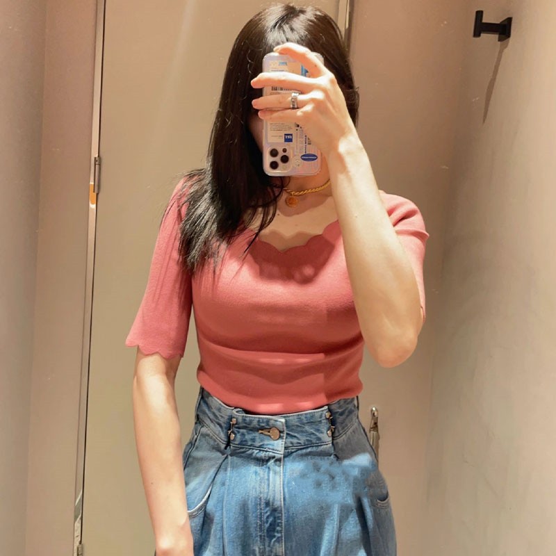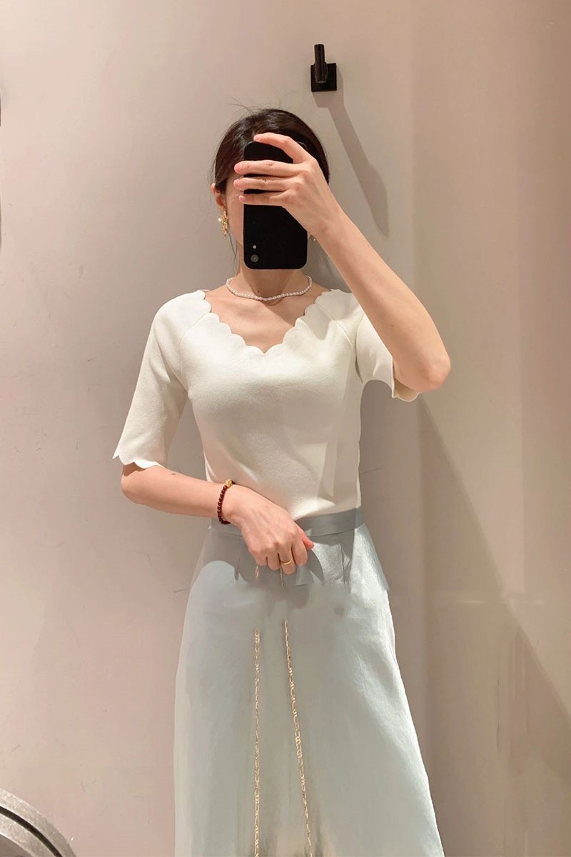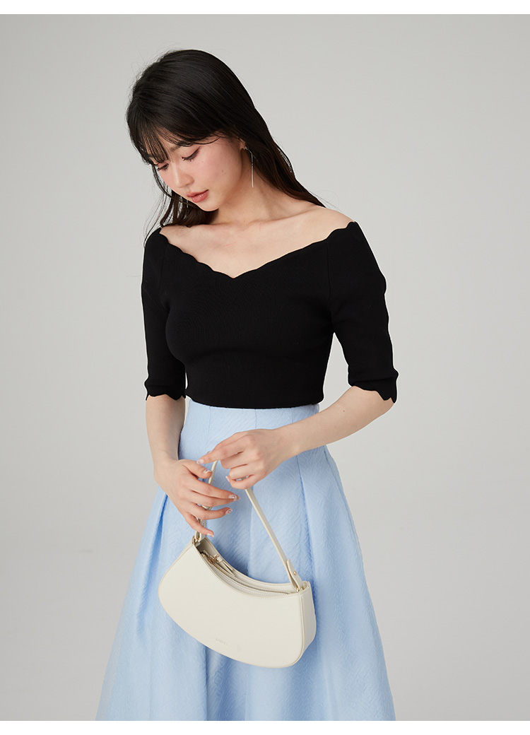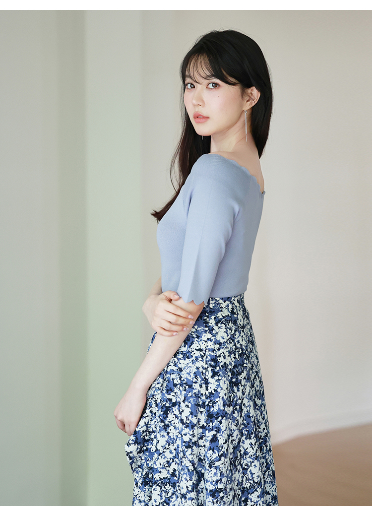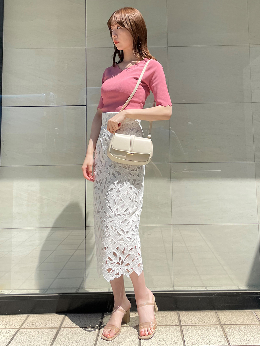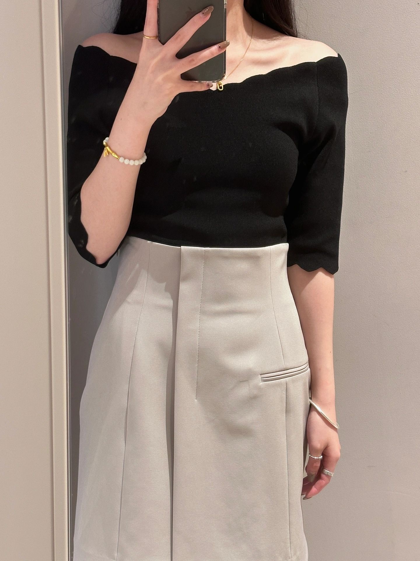 スカラップカットした襟ぐり&袖口が特徴的な、シンプルながらも女性らしさを感じさせるニットトップス。広めに開いたネックラインでヘルシーに肌見せでき、トレンド感をプラスしました。ボディラインを美しく見せるタイトシルエットも◎。スカートからパンツまで幅広いボトムと合わせやすく、着まわし力も抜群です。