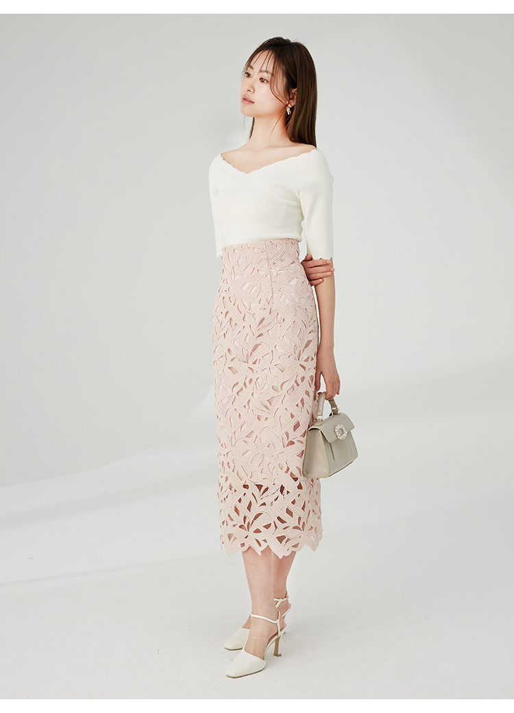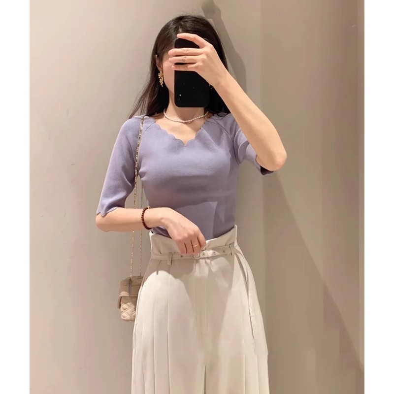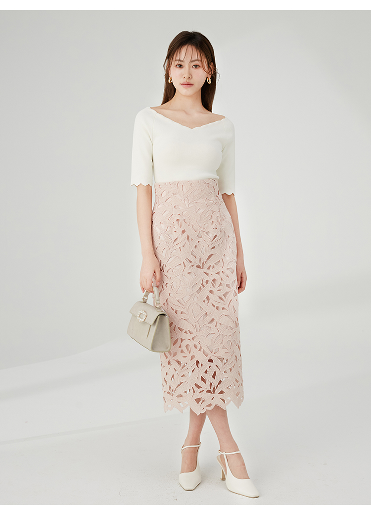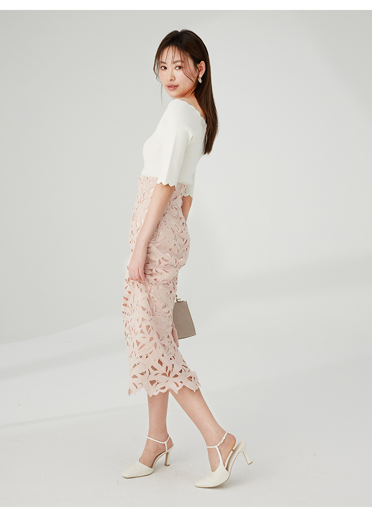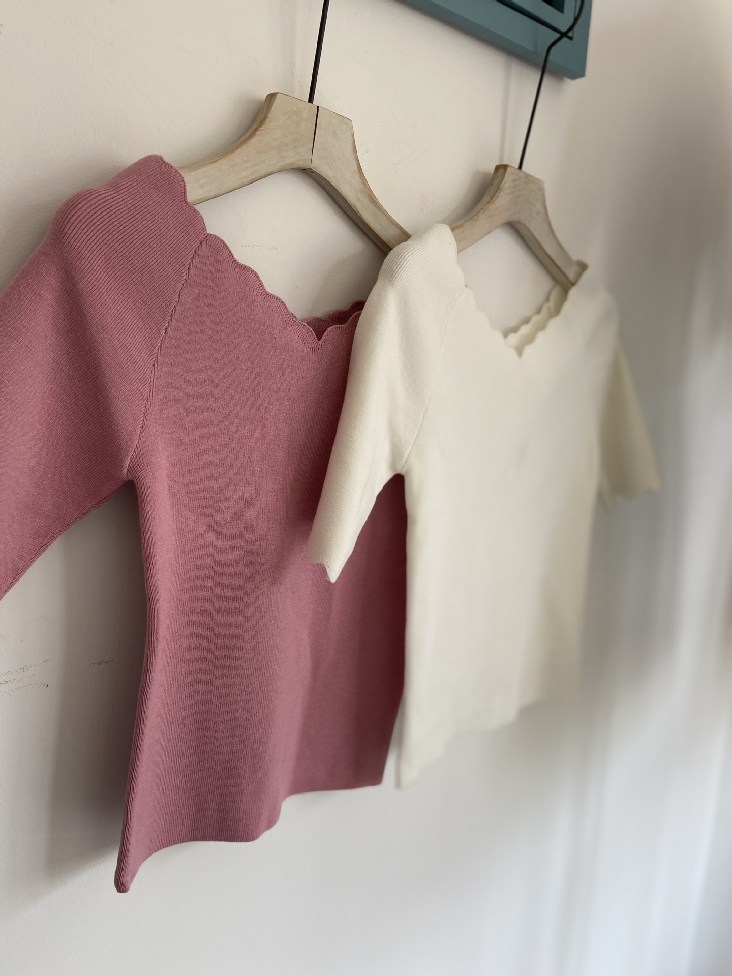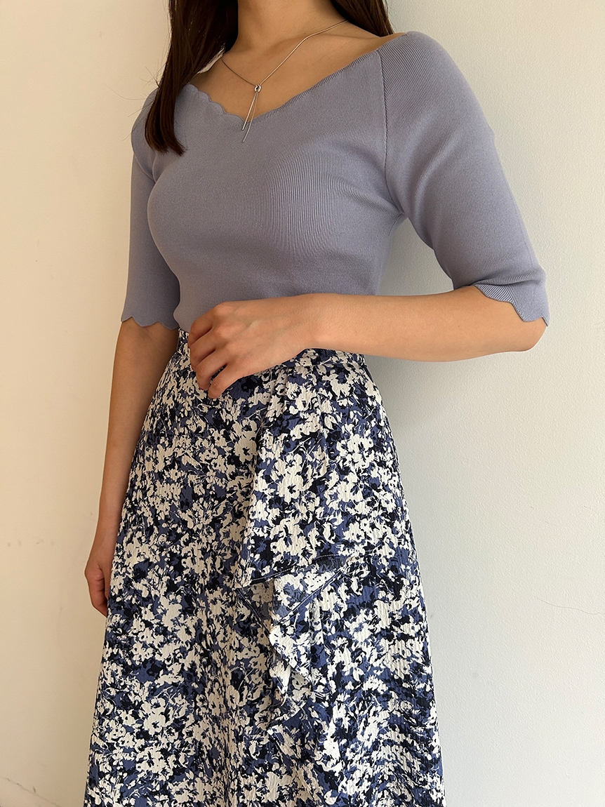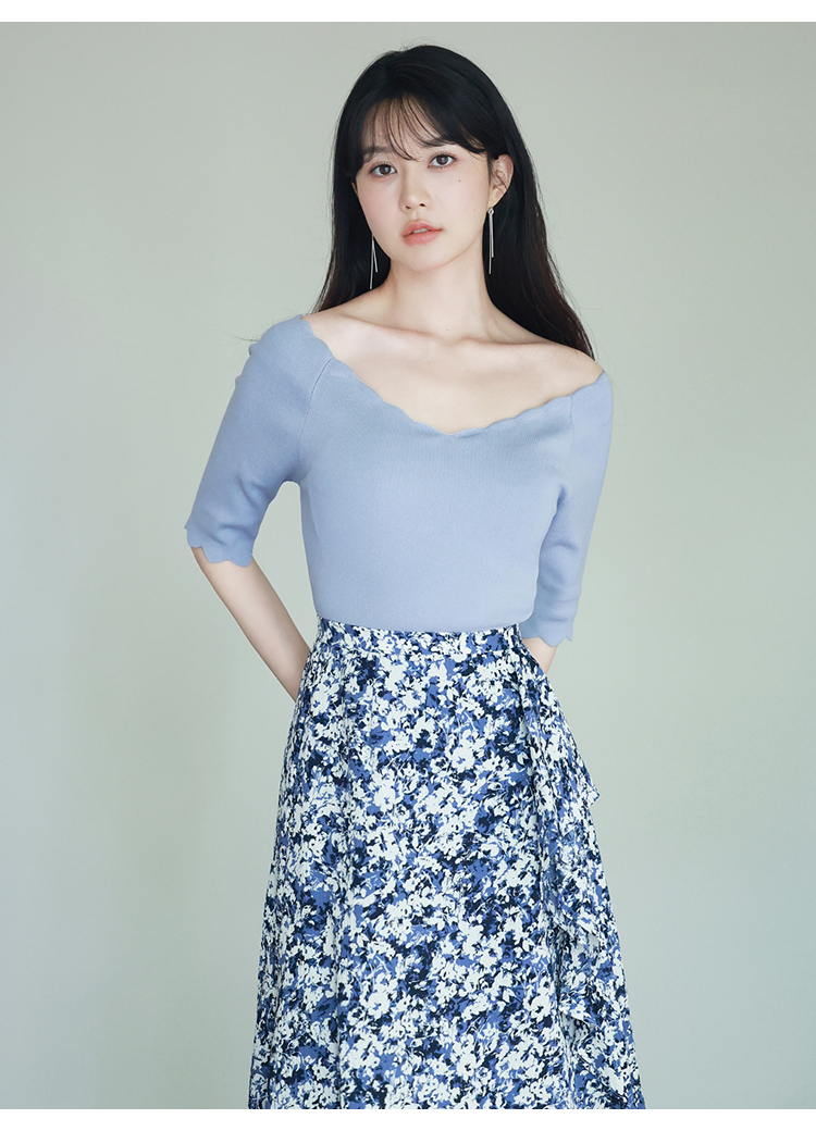 スカラップカットした襟ぐり&袖口が特徴的な、シンプルながらも女性らしさを感じさせるニットトップス。広めに開いたネックラインでヘルシーに肌見せでき、トレンド感をプラスしました。ボディラインを美しく見せるタイトシルエットも◎。スカートからパンツまで幅広いボトムと合わせやすく、着まわし力も抜群です。