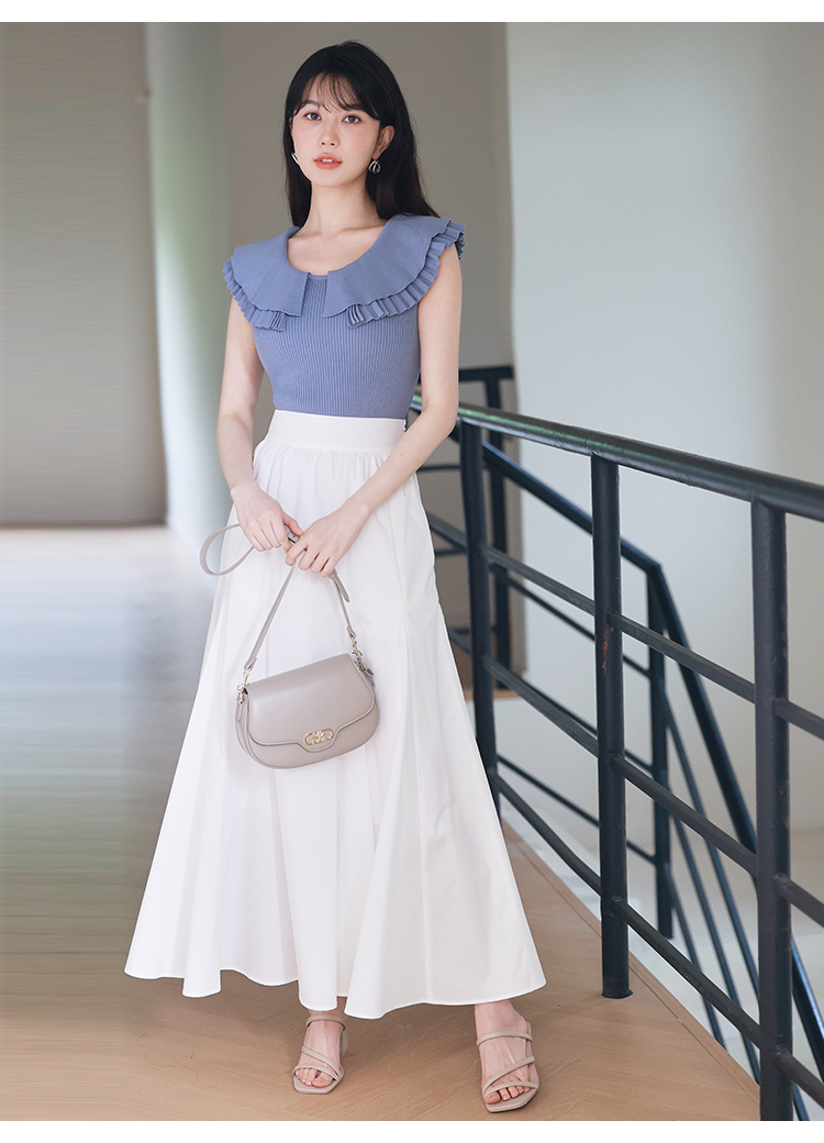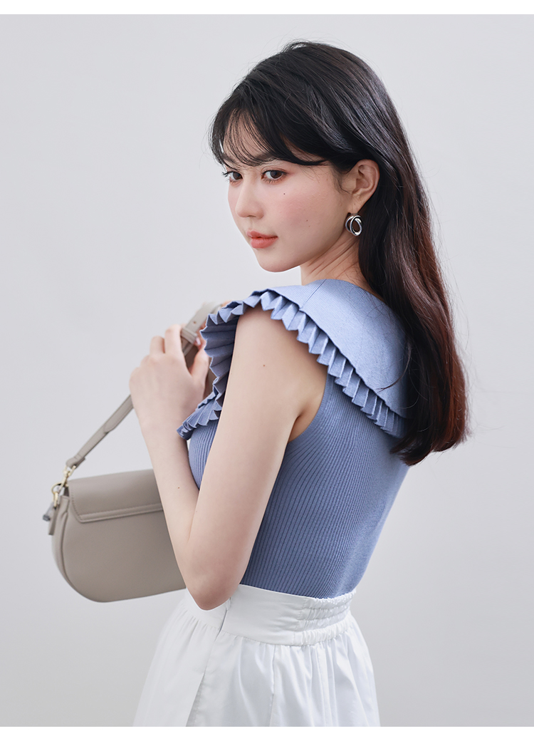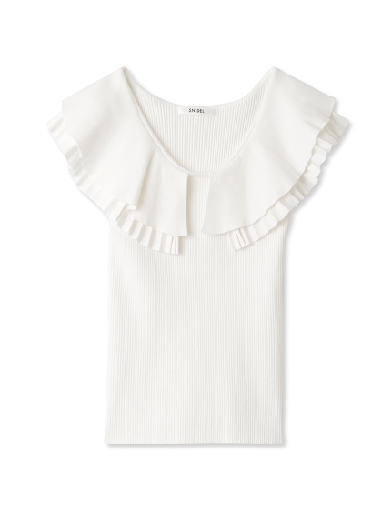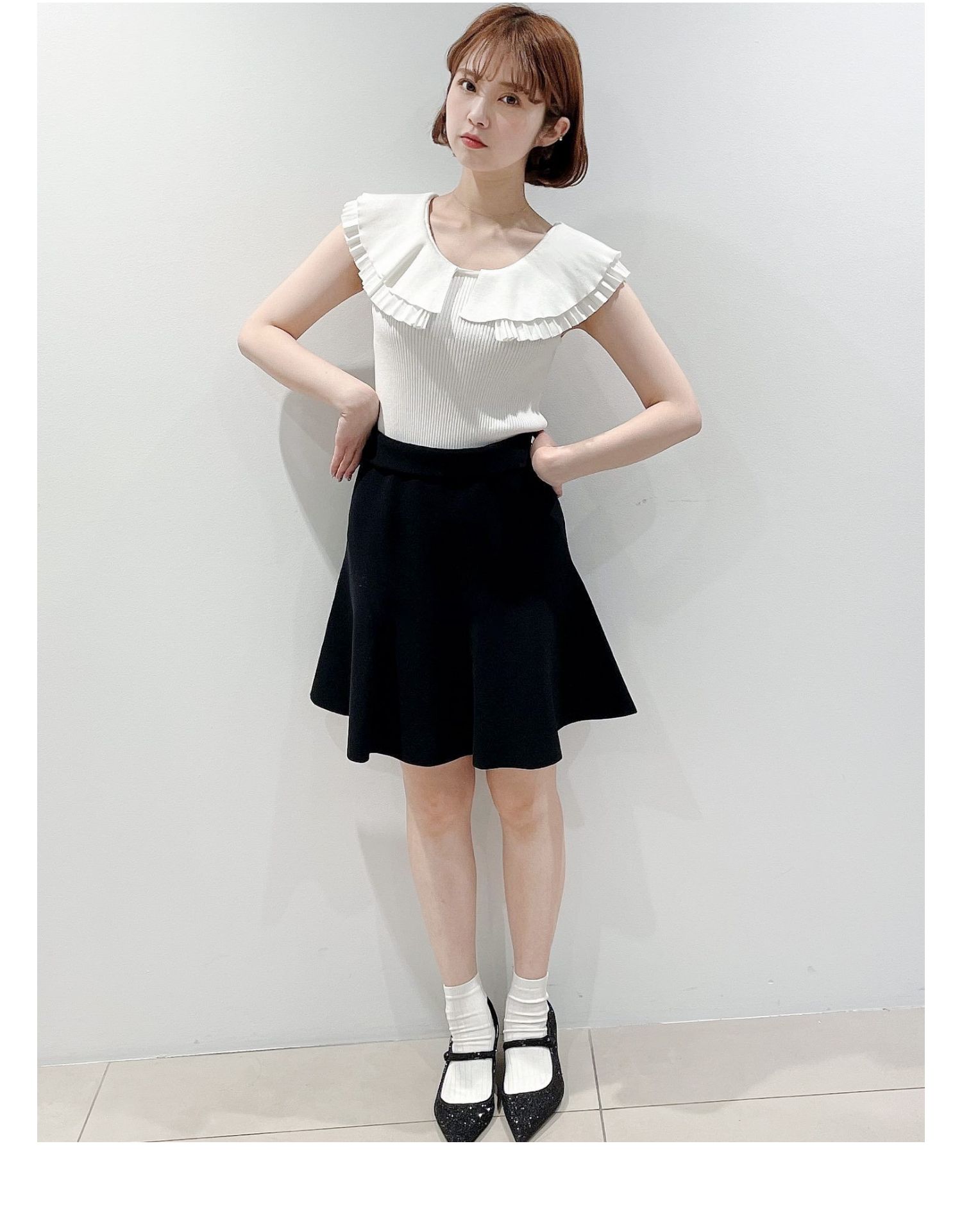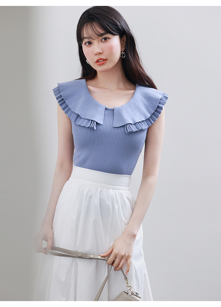 ニットプリーツをレイヤードした襟が印象的な、華やかな雰囲気のニットトップス。身頃部分をシンプルかつタイトに仕上げることでこだわりの襟が引き立ち、より女性らしい印象に仕立てました。ボリュームスカートから細身のパンツまで合わせるボトムを選ばないので、幅広いスタイリングに重宝します。