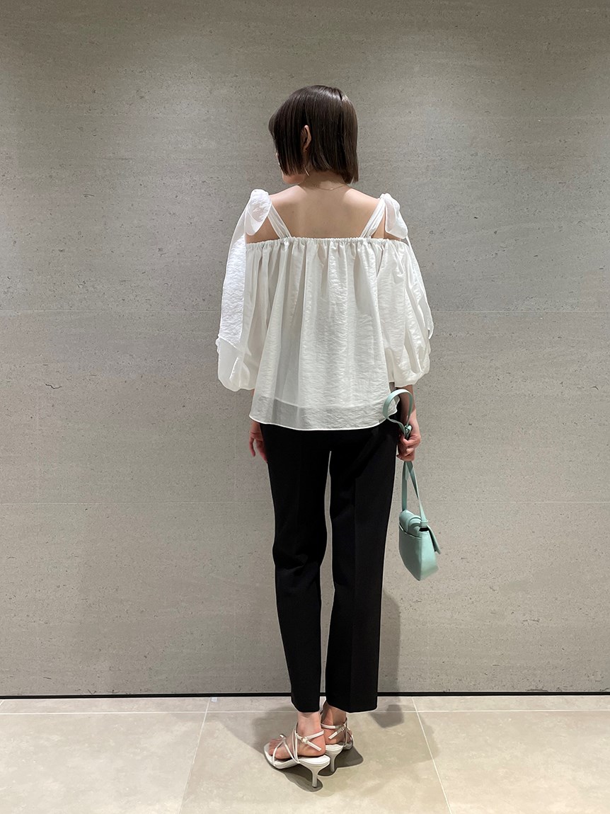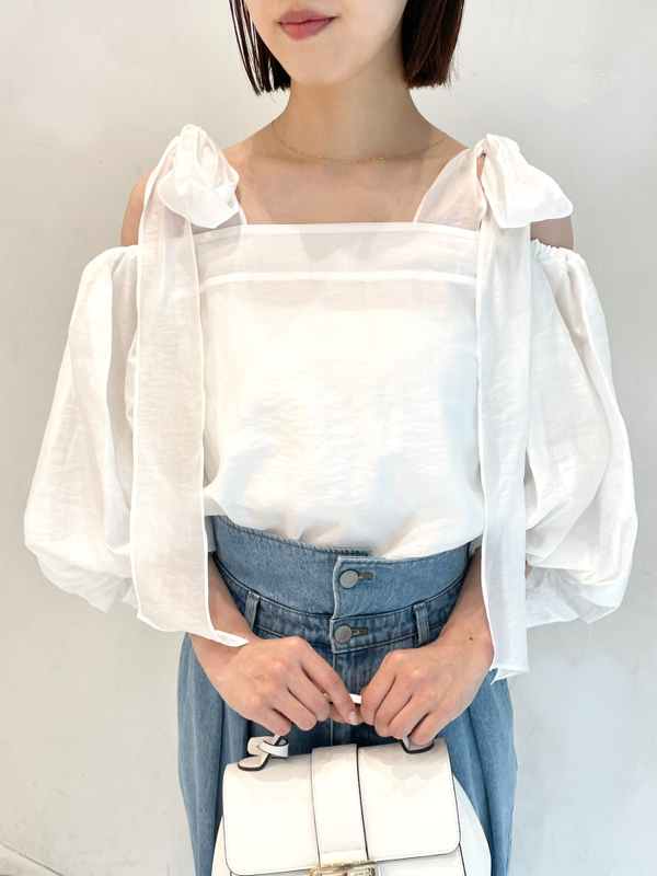 ヘルシーな肌見せで女性らしさを引き立てるオフショルデザインのブラウス。肩に大きめのリボンをあしらうことでとことんフェミニンに仕上げました。ふんわりと丸みを持たせたボリュームスリーブで華奢見えを演出。レディライクなスカートにはもちろん、敢えてカジュアルなデニムなどと合わせたMIXスタイルもおすすめです。