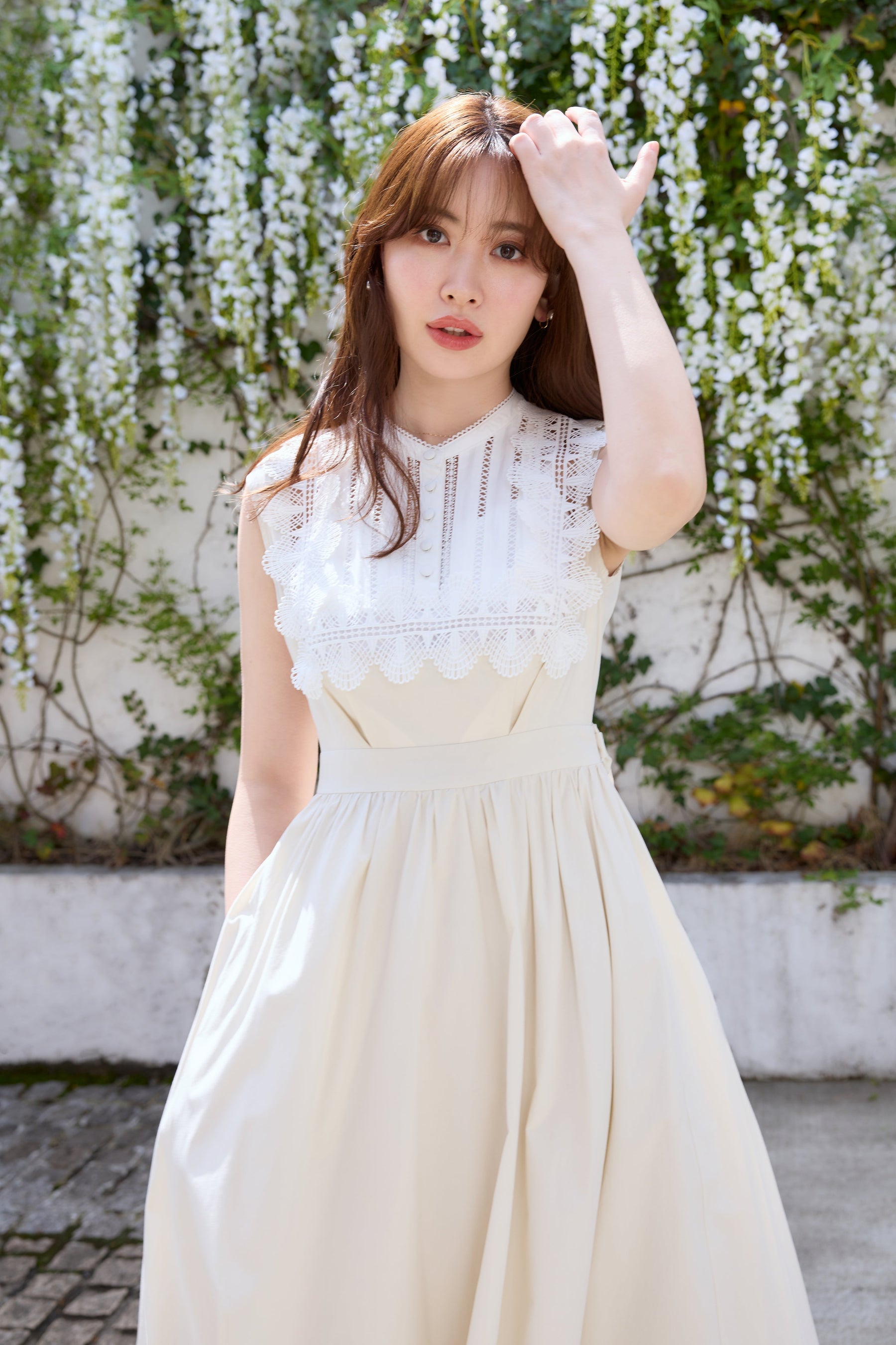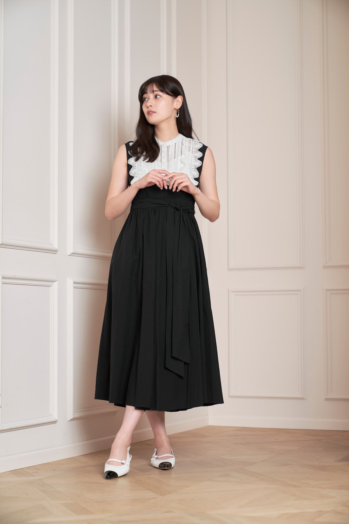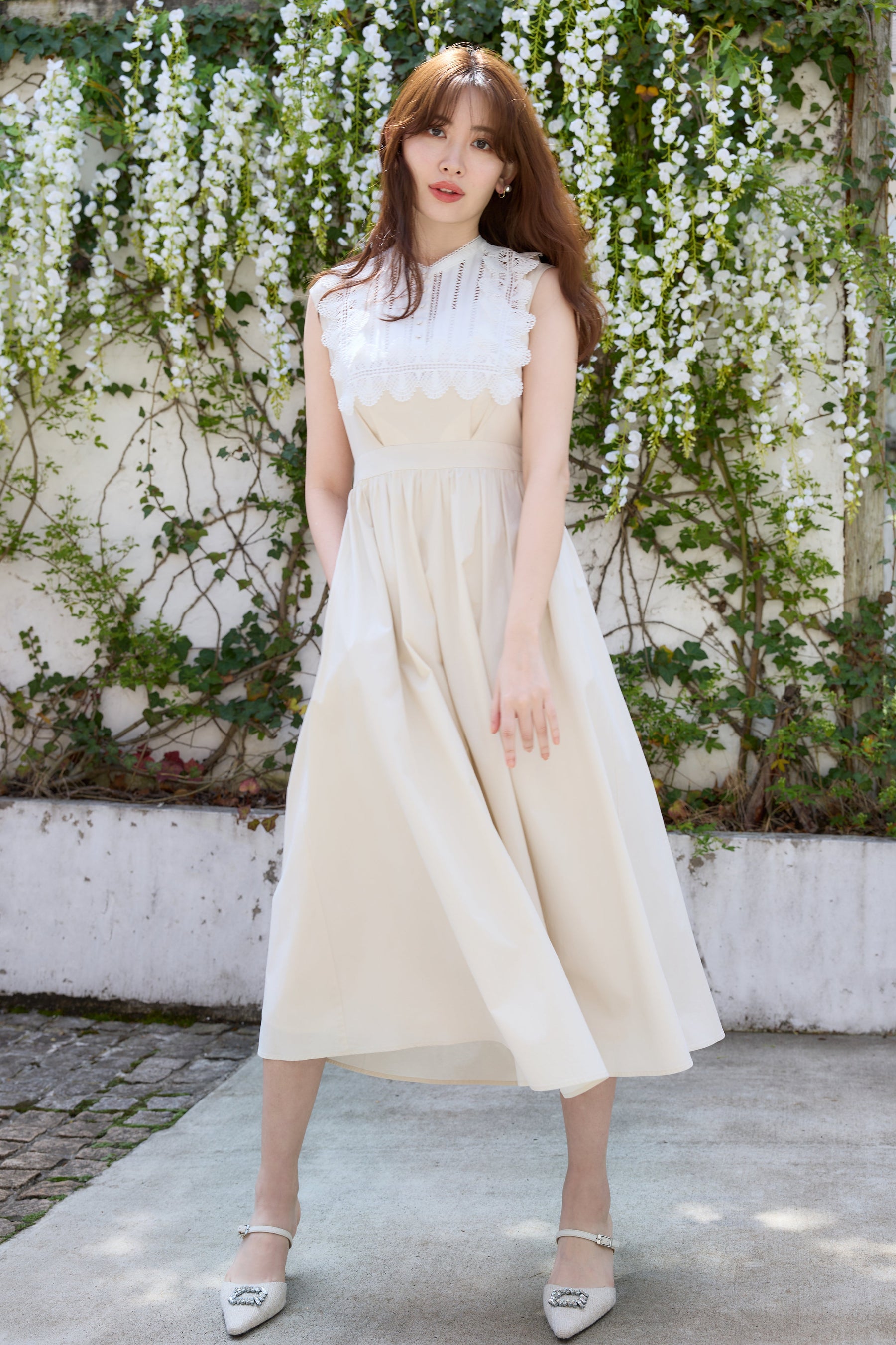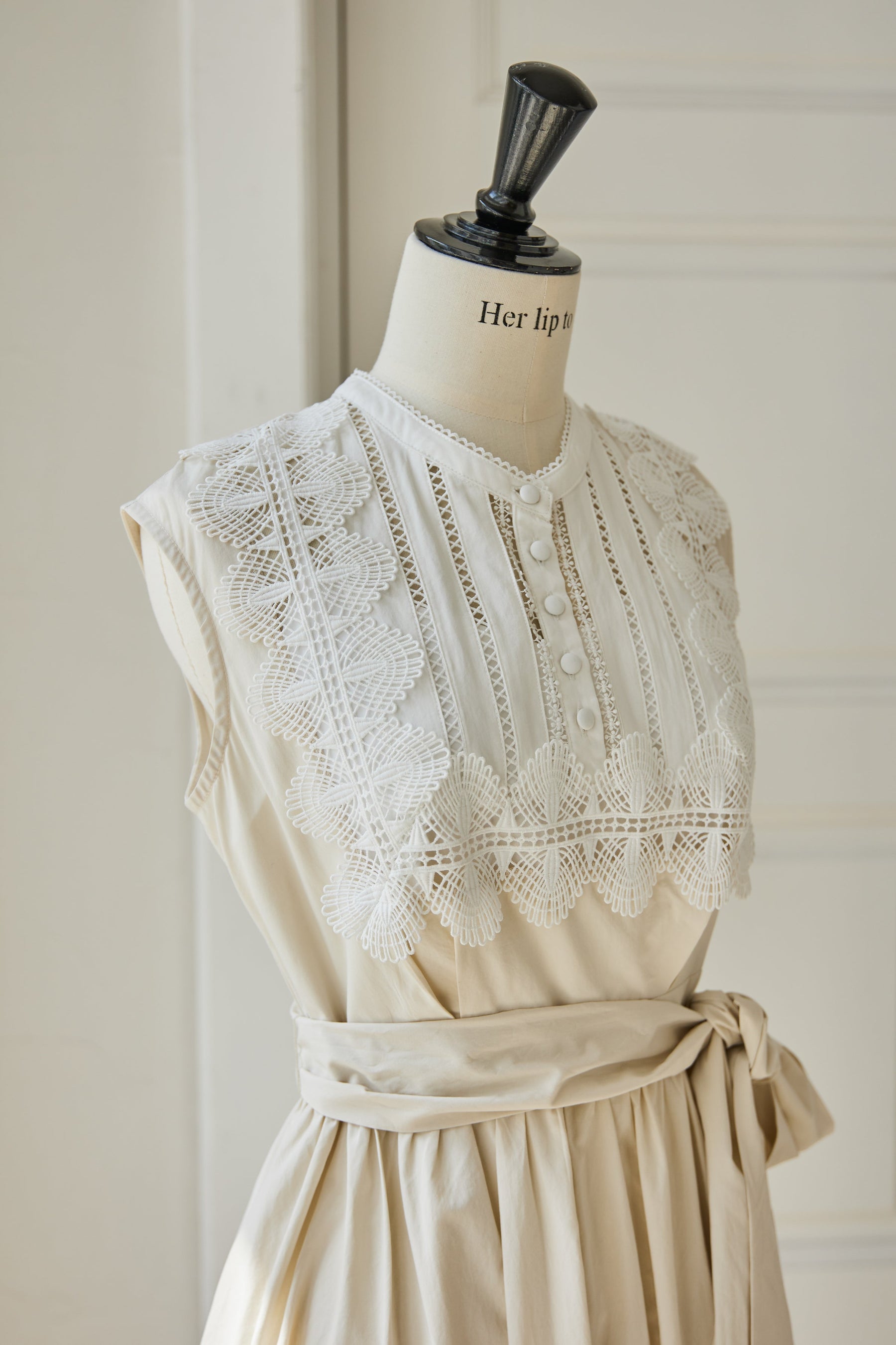 三種類のレースを施したレースのディティールが目を惹くデザインポイントのドレス。