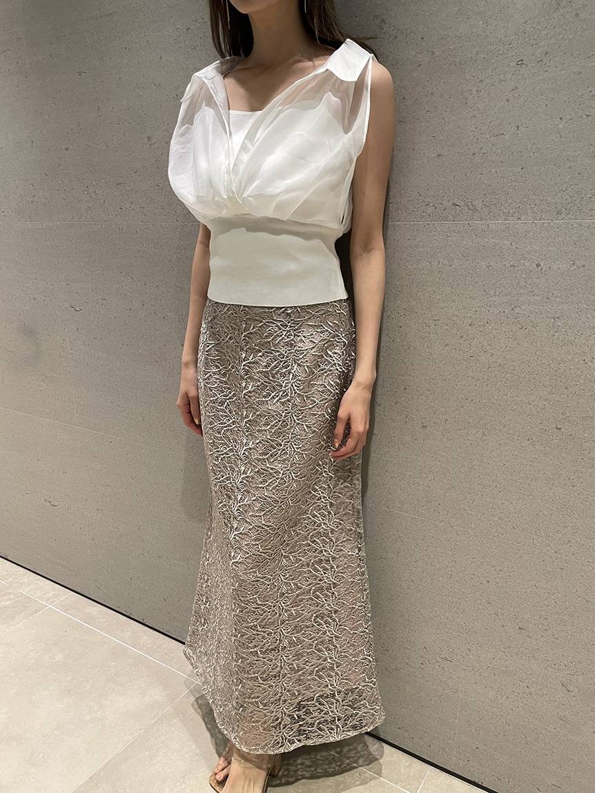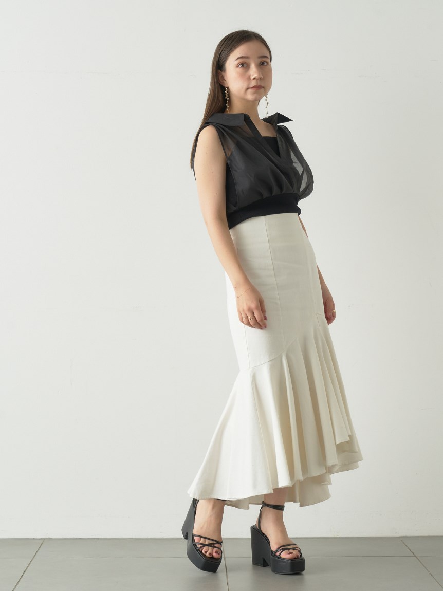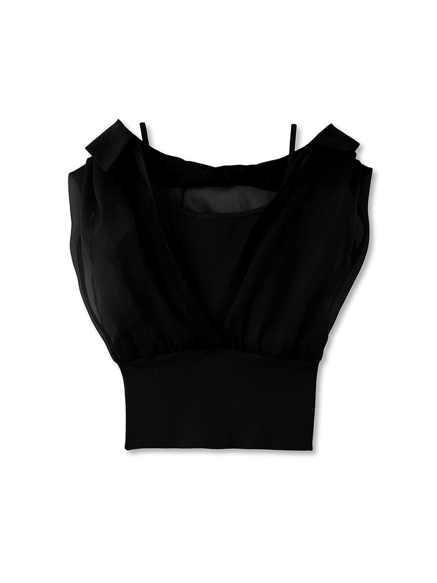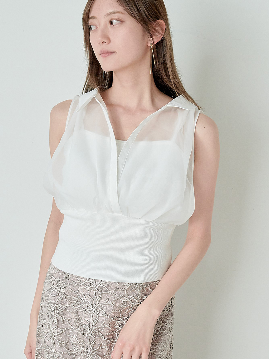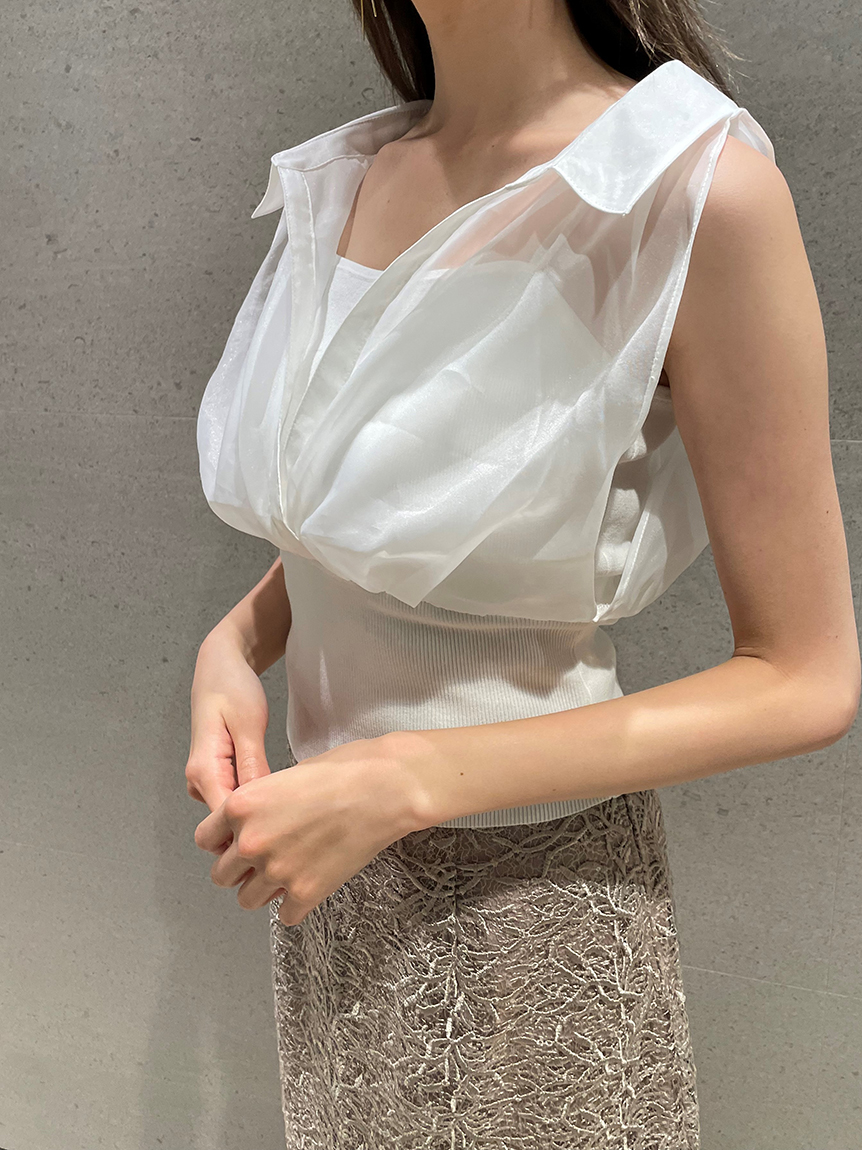 ライトな風合いのニット素材とシアーな布帛を組み合わせました。ホワイト、ブラック、バーガンディの着まわしやすいカラー展開でお届けします。