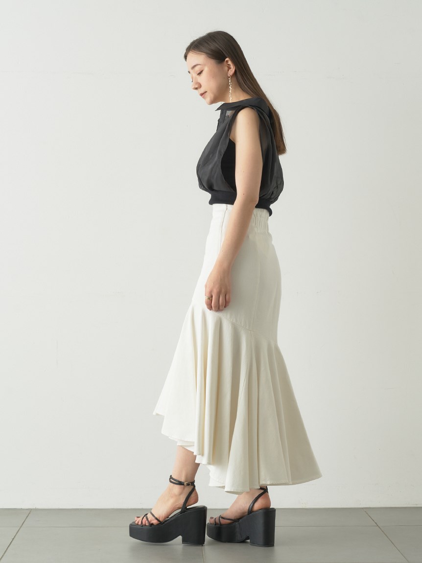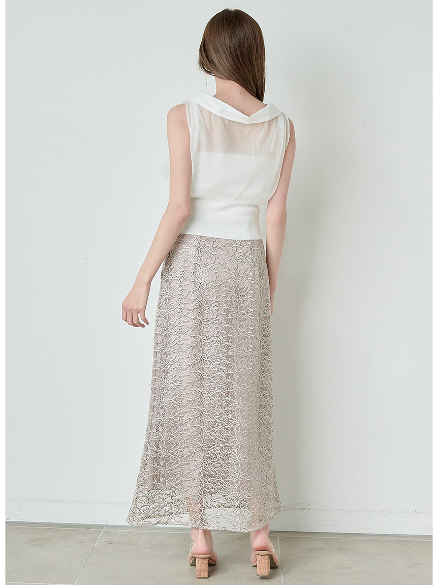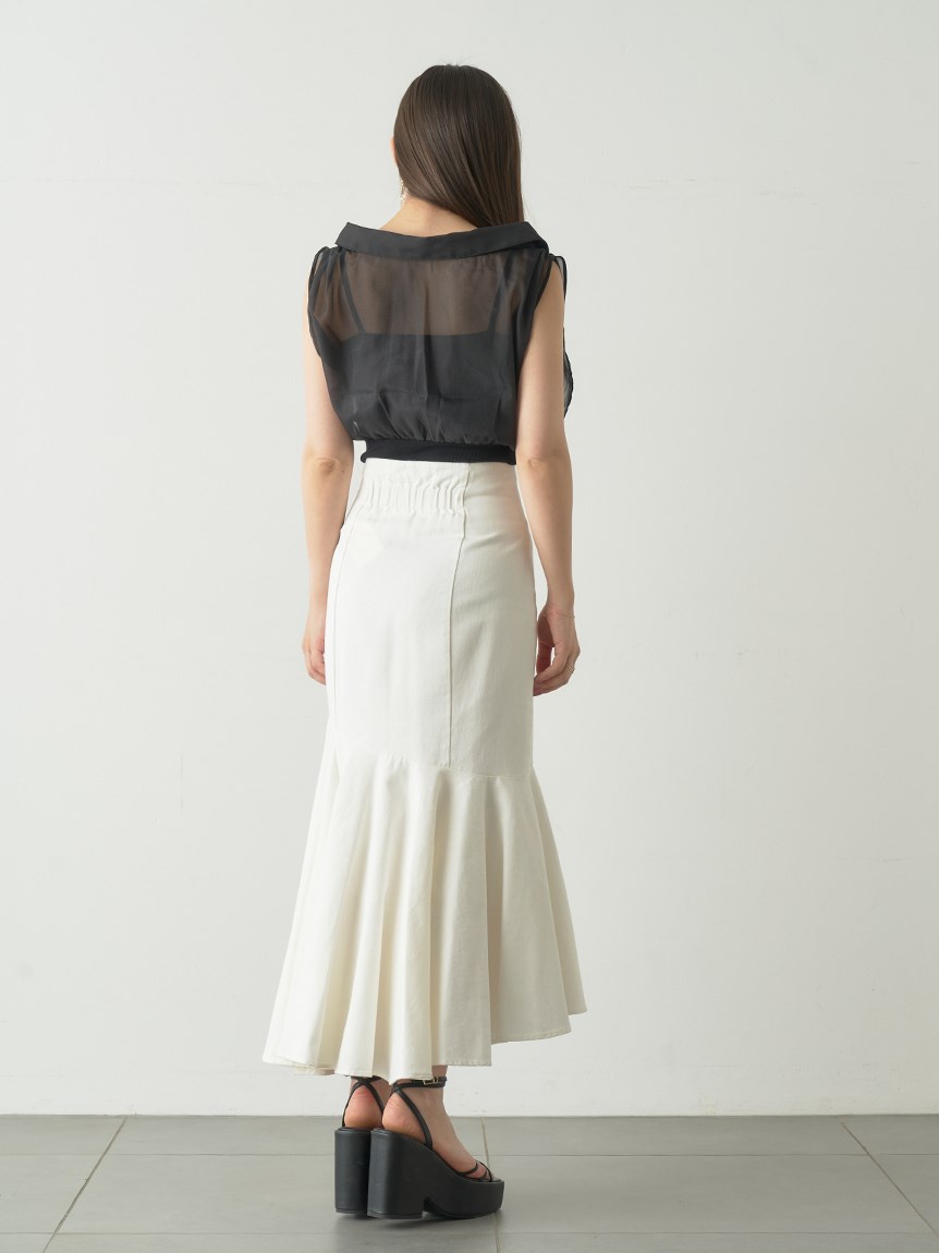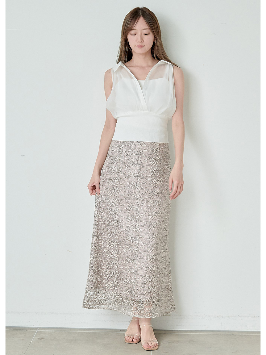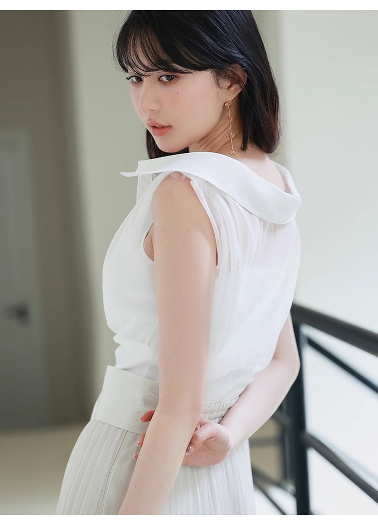 ライトな風合いのニット素材とシアーな布帛を組み合わせました。ホワイト、ブラック、バーガンディの着まわしやすいカラー展開でお届けします。