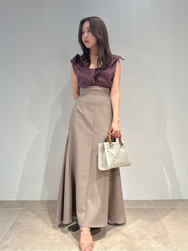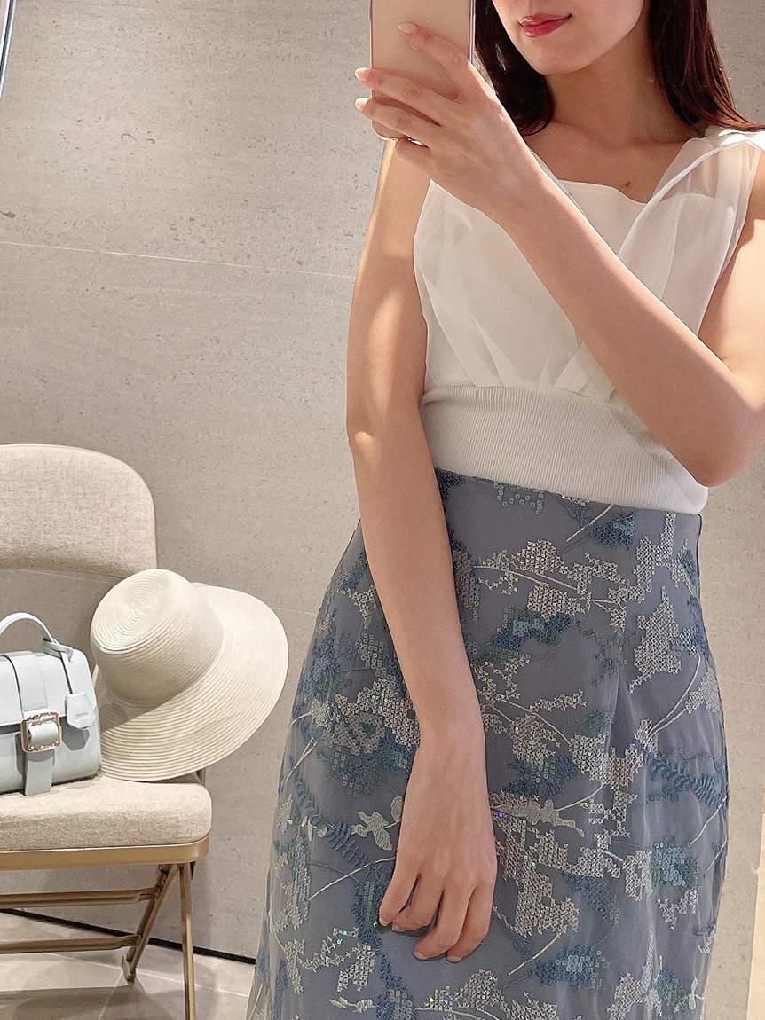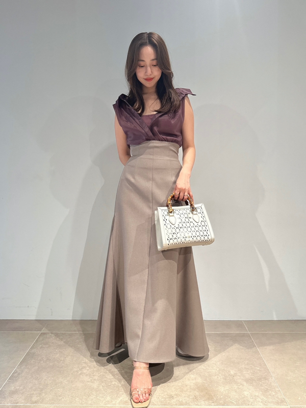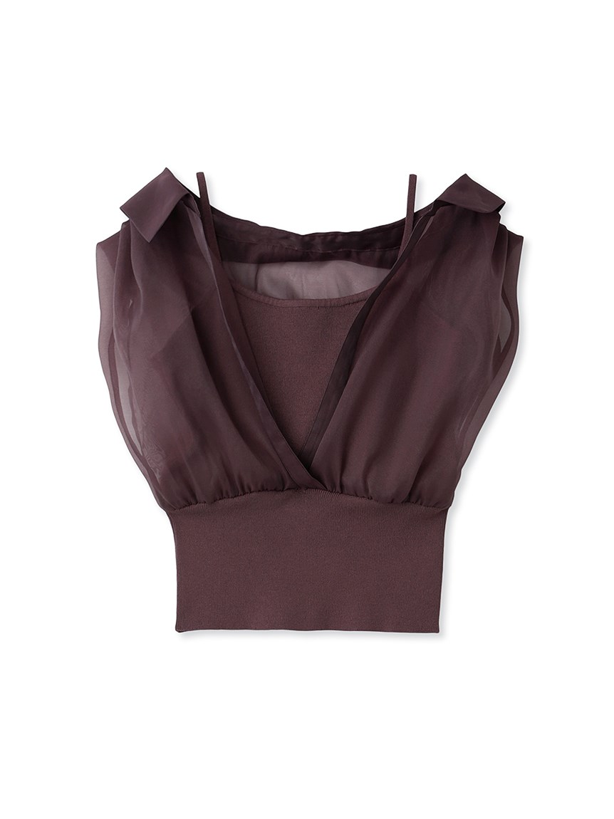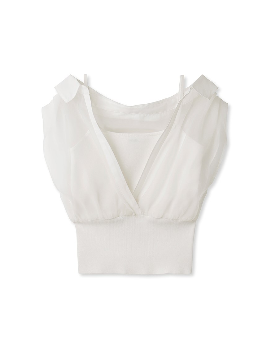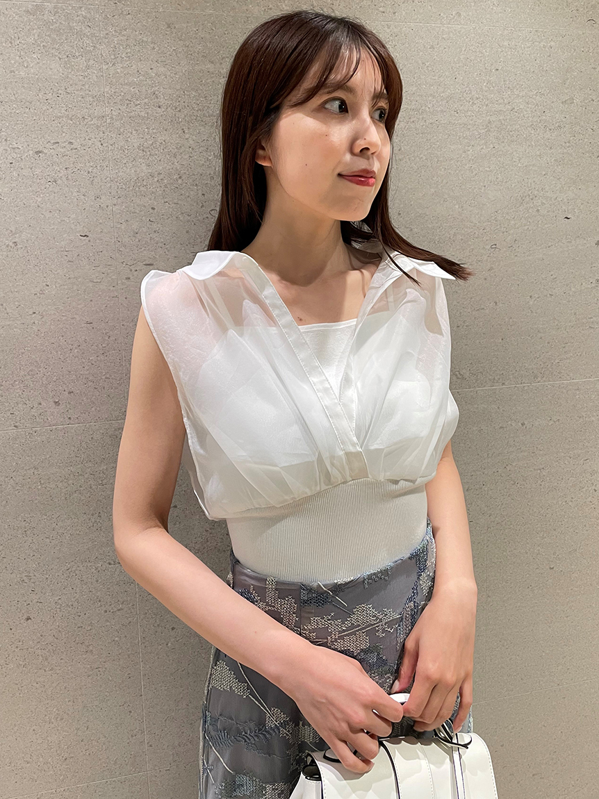 ニットキャミと布帛シャツをレイヤードしているかのような、ドッキングデザインのトップス。ふんわりと程よくたるませたシャツの抜け感が女性らしい1枚。裾をキュッと絞ったコンパクトなシルエットで、合わせるボトムスを選ばないのも魅力です。