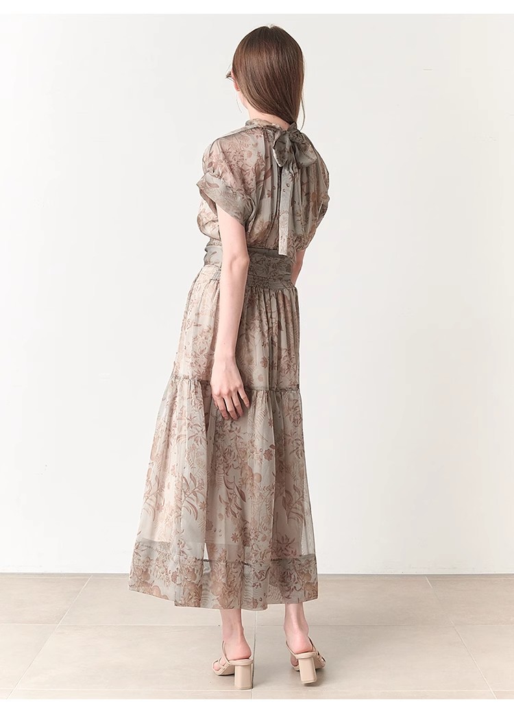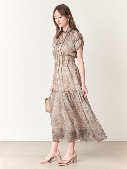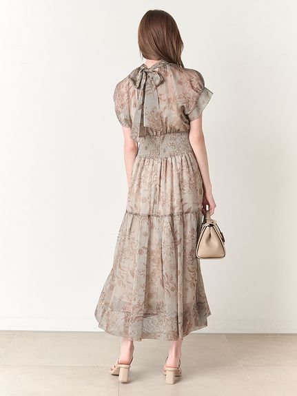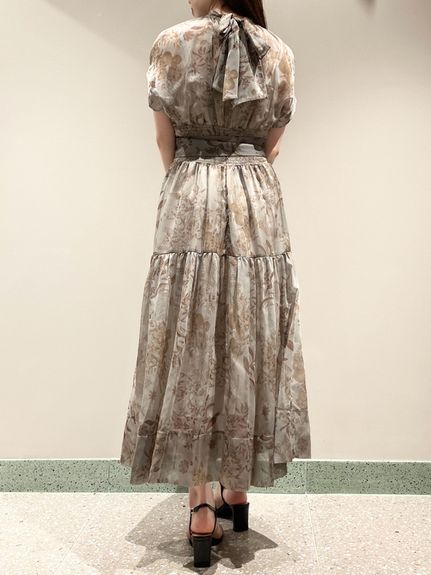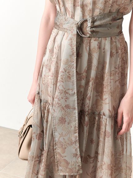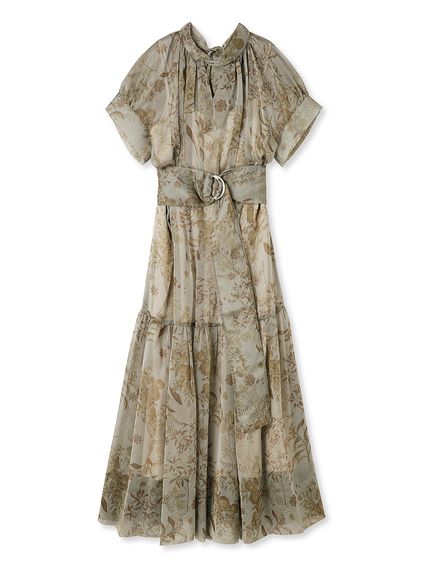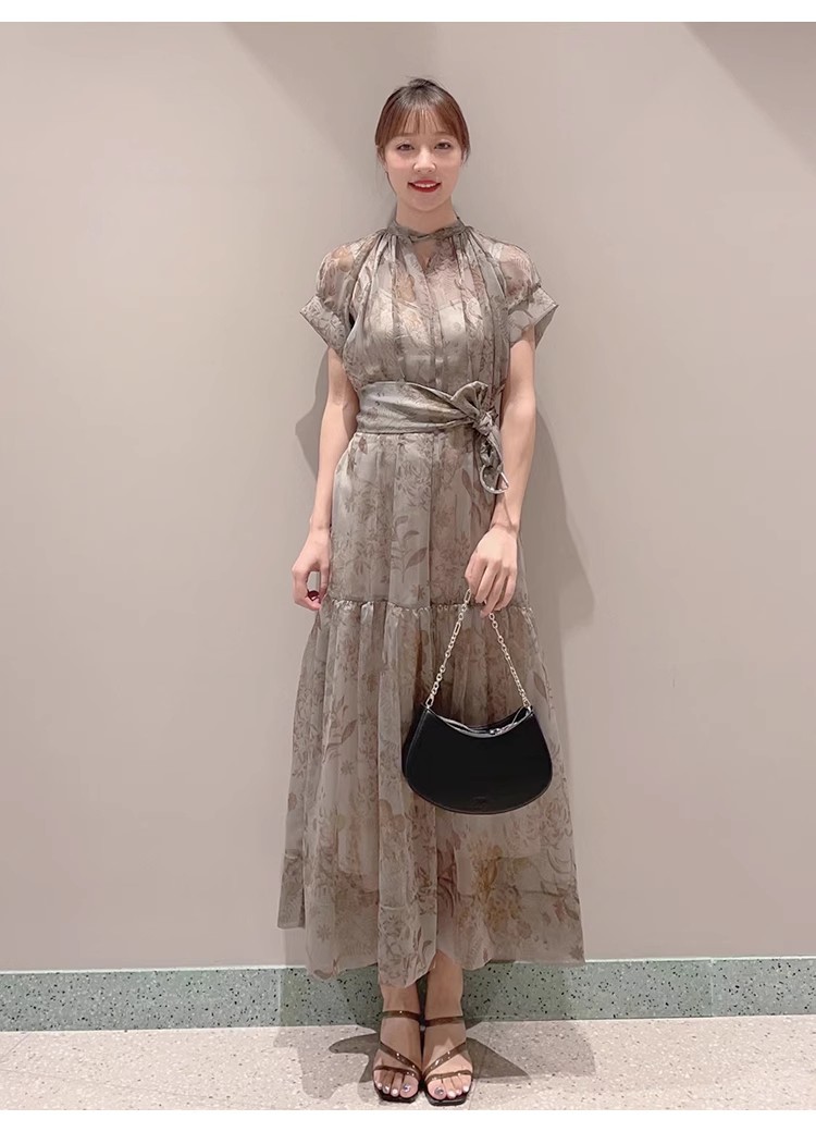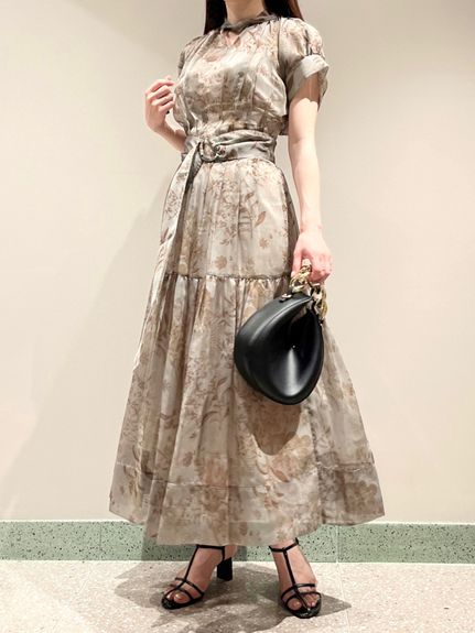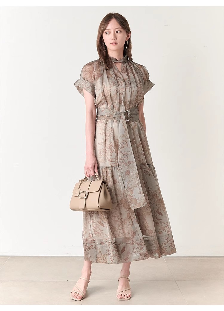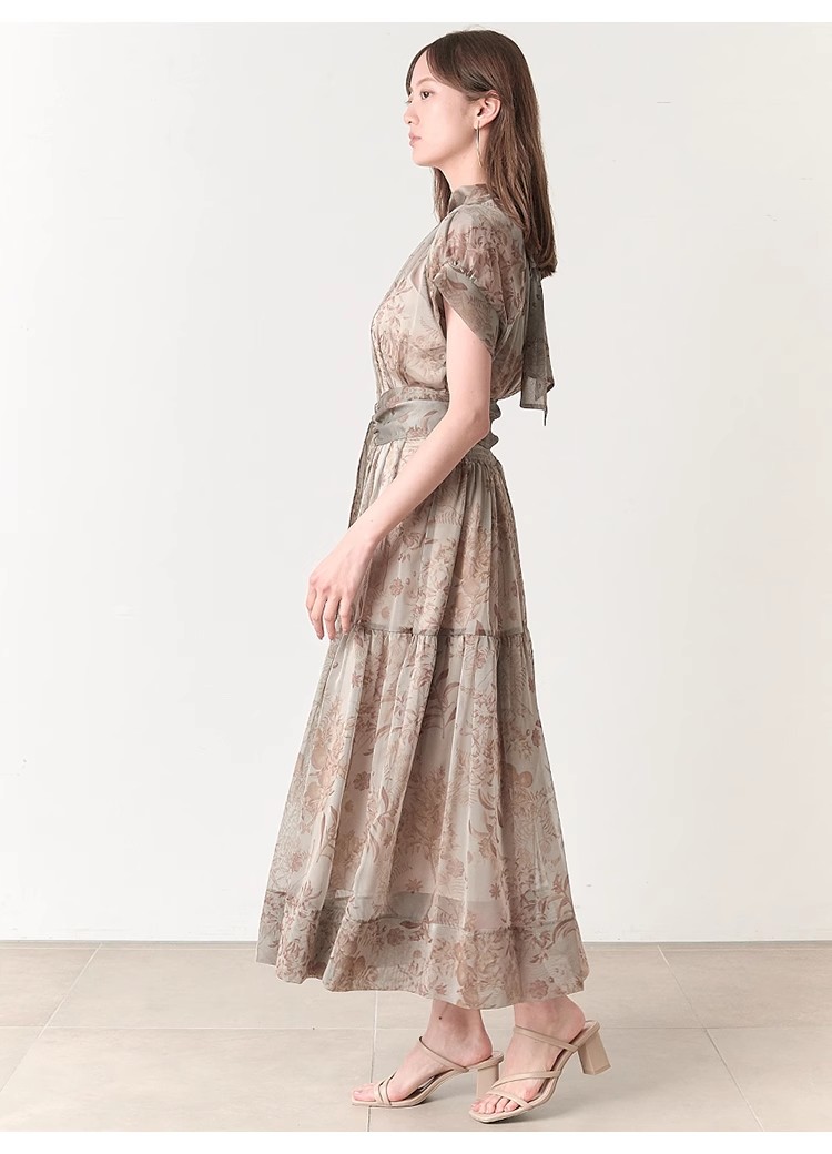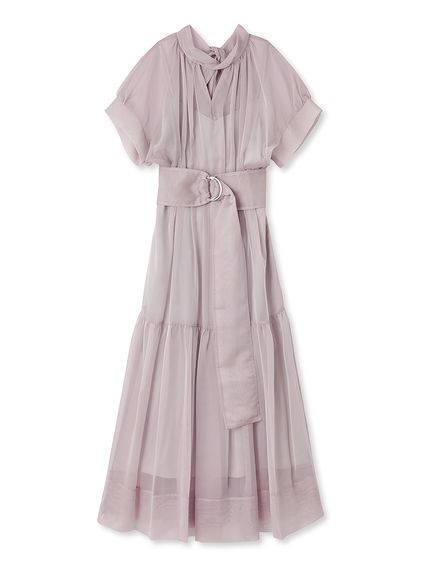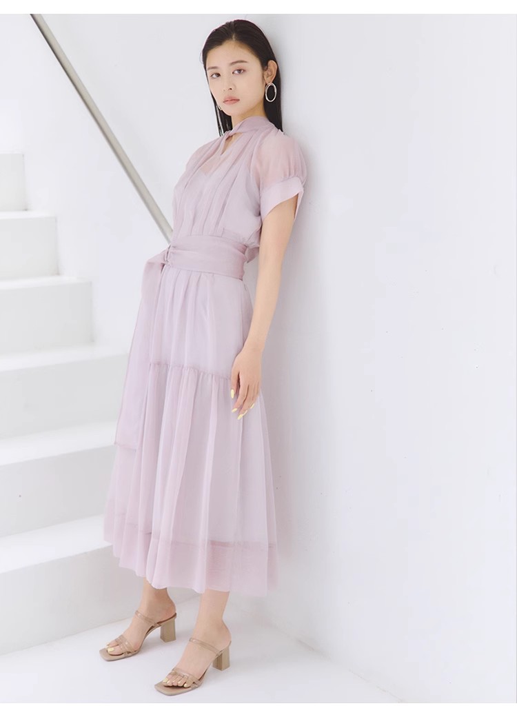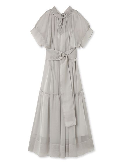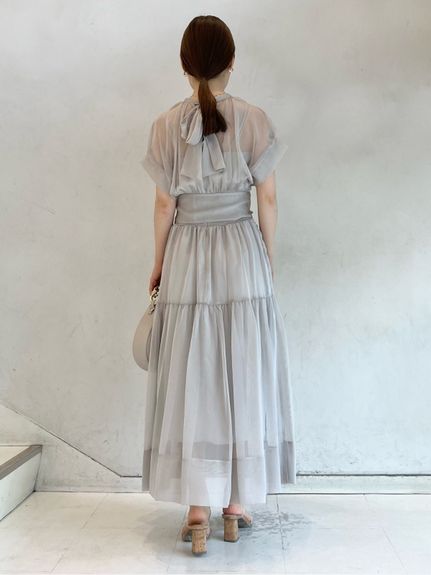 シアーで軽やかな生地を使用した、女性らしくセンシュアルな表情のワンピース。たっぷりとギャザーを効かせたボリューム感のあるティアードシルエットで華やかに仕上げました。共地のベルトでウエストをマークすればスタイルアップ効果絶大のメリハリシルエットに。バックネックではリボンを結び、後ろ姿までフェミニンに見せています。