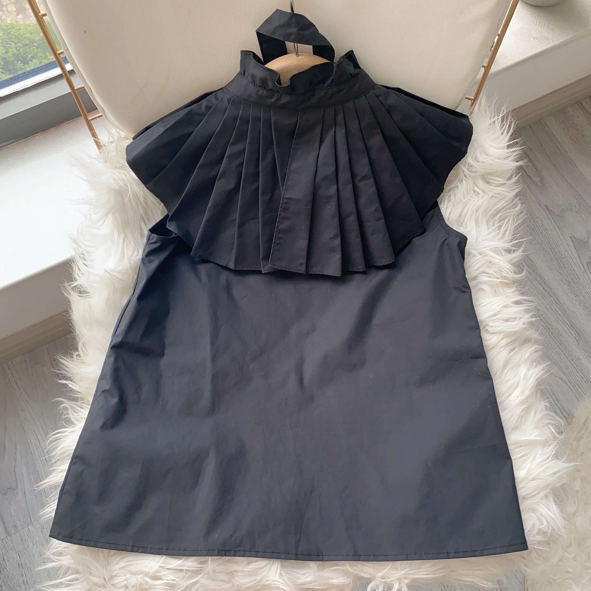たっぷりのプリーツフリルがあしらわれた、華やかかつモードなノースリブラウス。フェミニンなアクセントを添えるボウタイリボンは取り外しできるので、その日の気分やシーンに合わせてアレンジを楽しめます。たっぷりのフリル対して身頃部分はすっきりとシンプルに仕上げることでメリハリの取れたバランスの良いルックスに。パンツともスカートとも合わせやすく、幅広いスタイリングに取り入れられます。