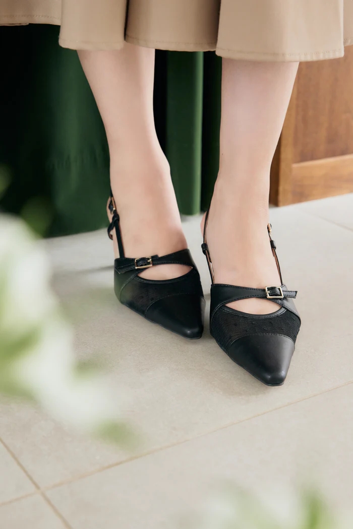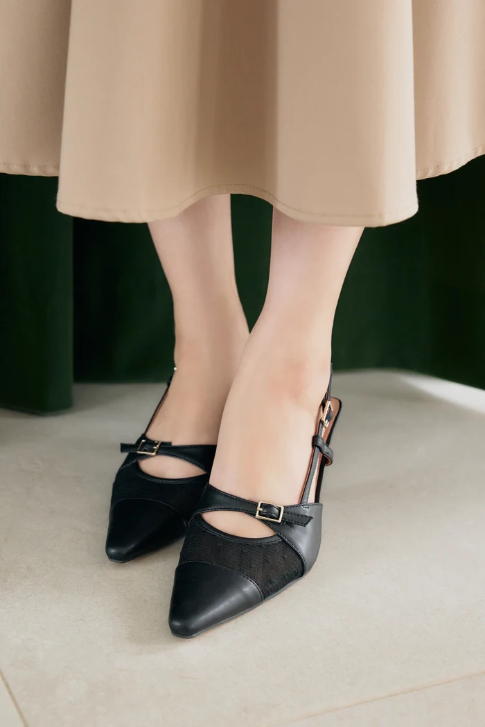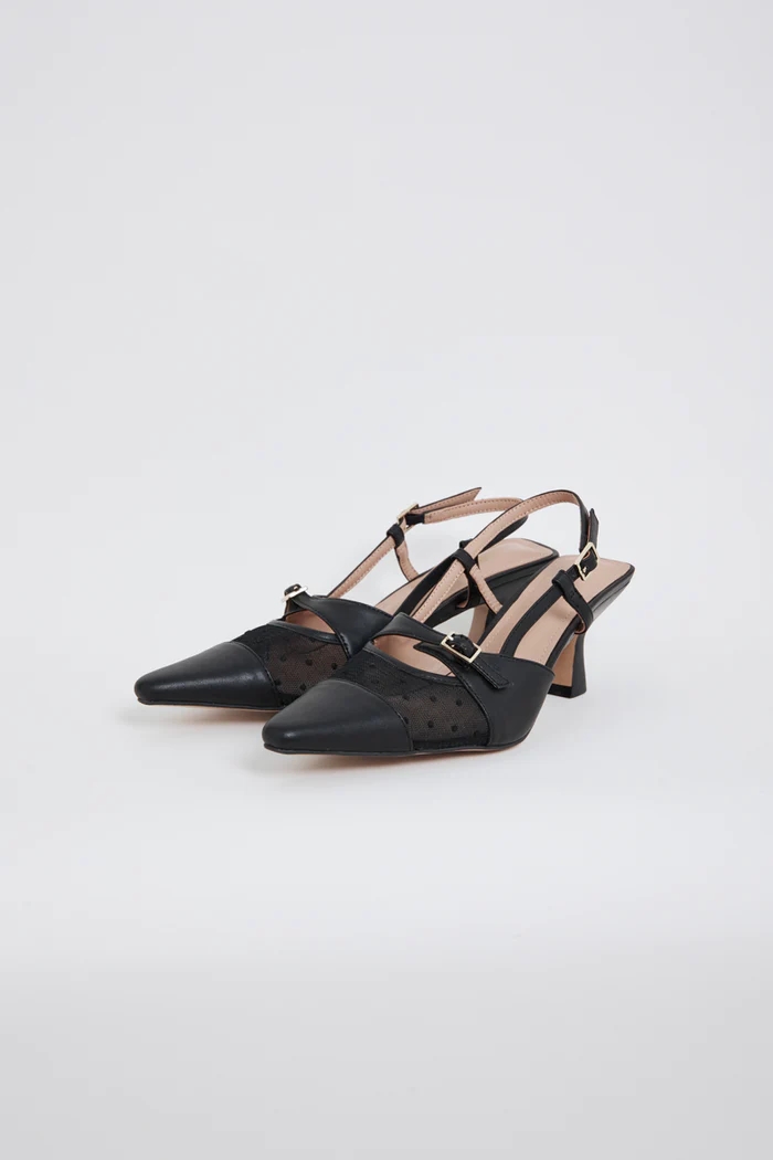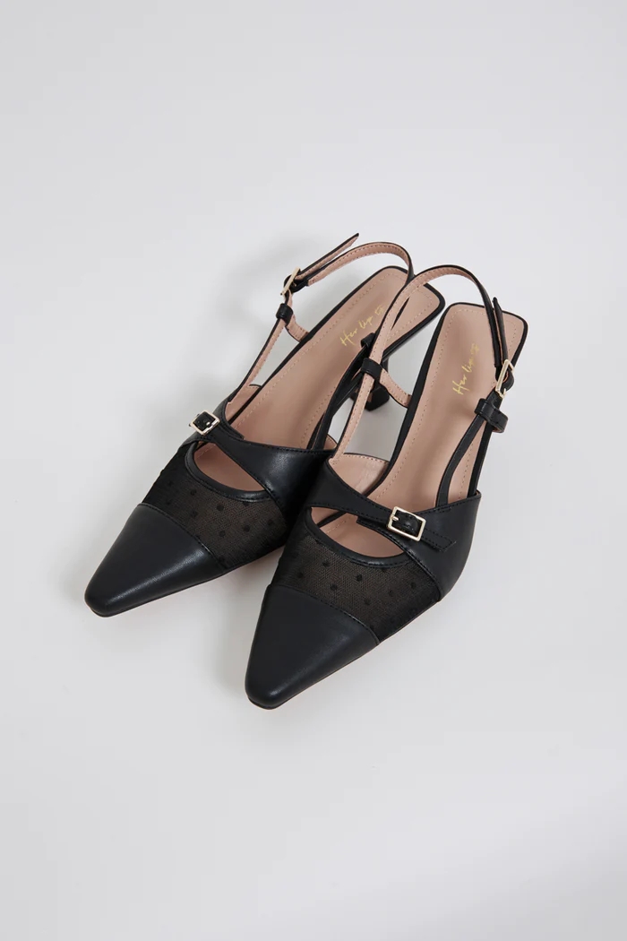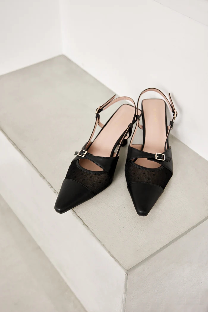 透け感のあるドットチュールが配されたデザインはレディなムードを放ってくれる一足です。