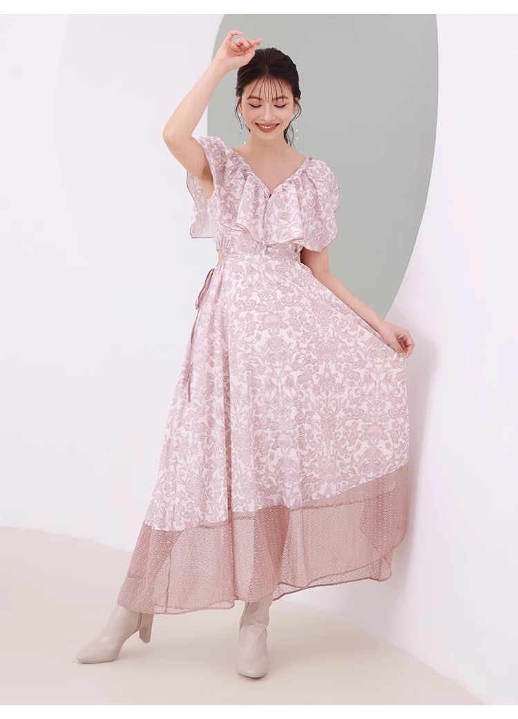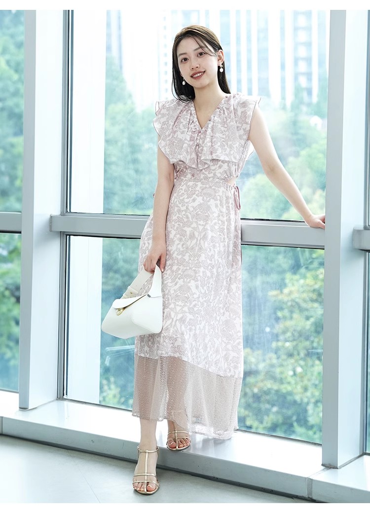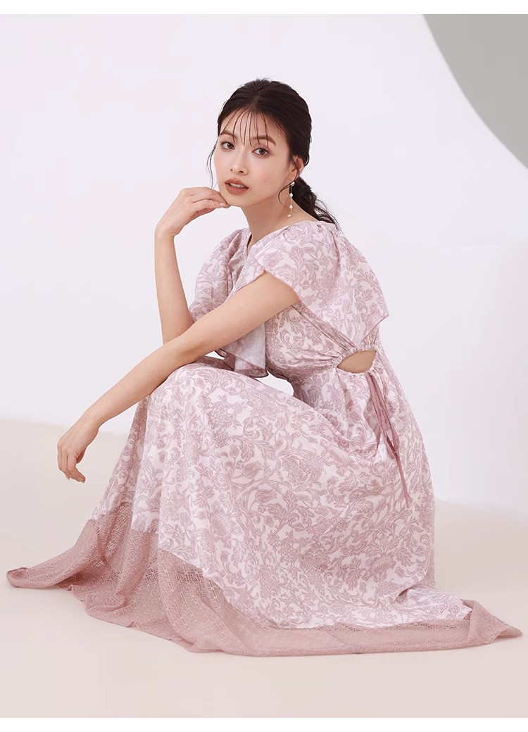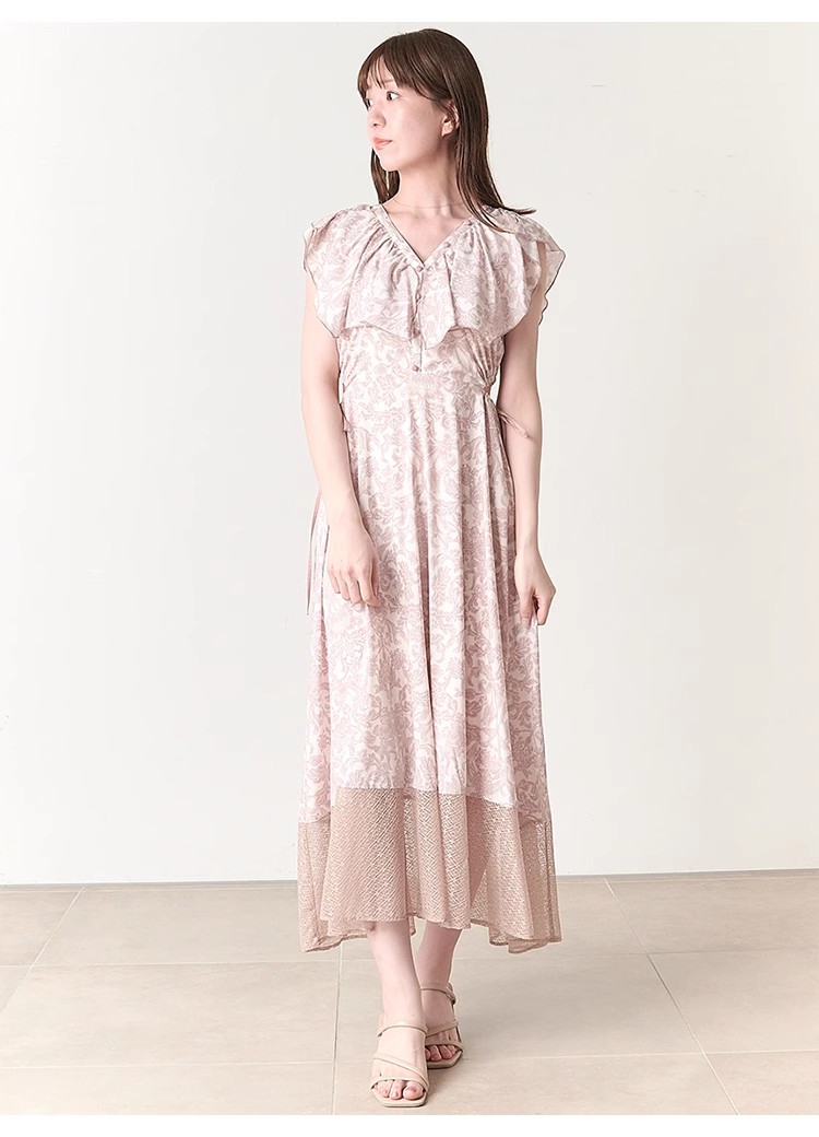 大胆なカットアウトやシアーなレースの切り替えでヘルシーな肌見せを演出する、トレンド感溢れるワンピース。「SNIDEL」オリジナルで柄を起こしたプリントを施し、華やかに仕上げました。襟ぐりにあしらわれたボリュームのあるフリルで、女性らしさはさらに加速。カットアウト部分はドロスト仕様なので、ギャザーの分量で肌見せの調節も可能です。