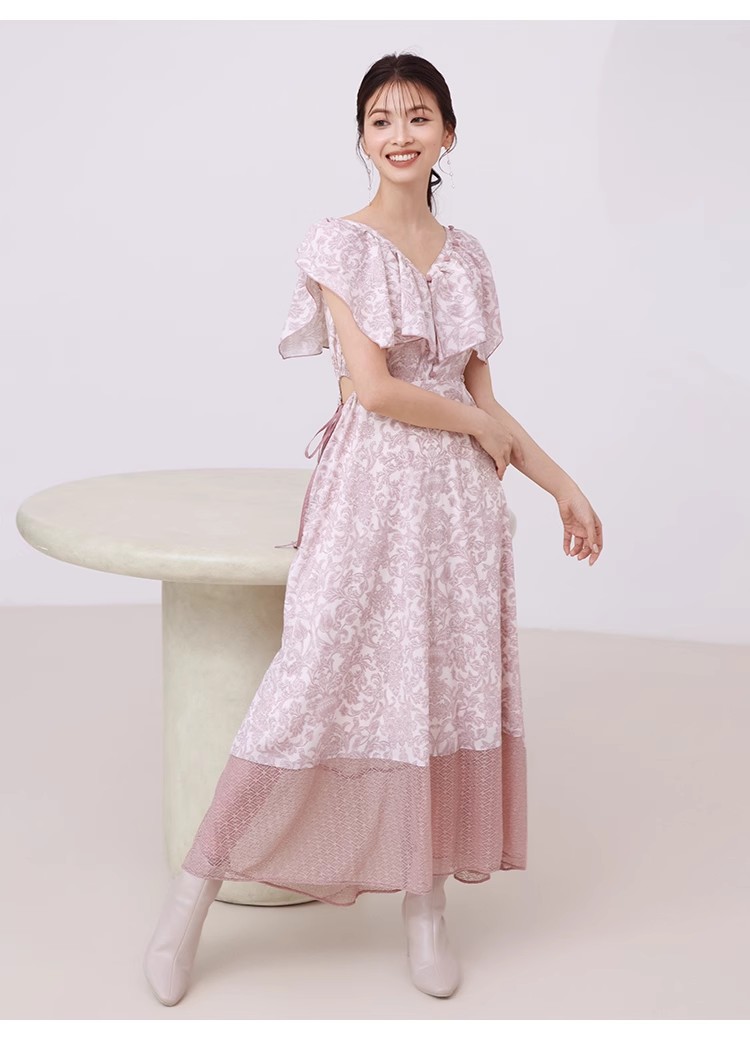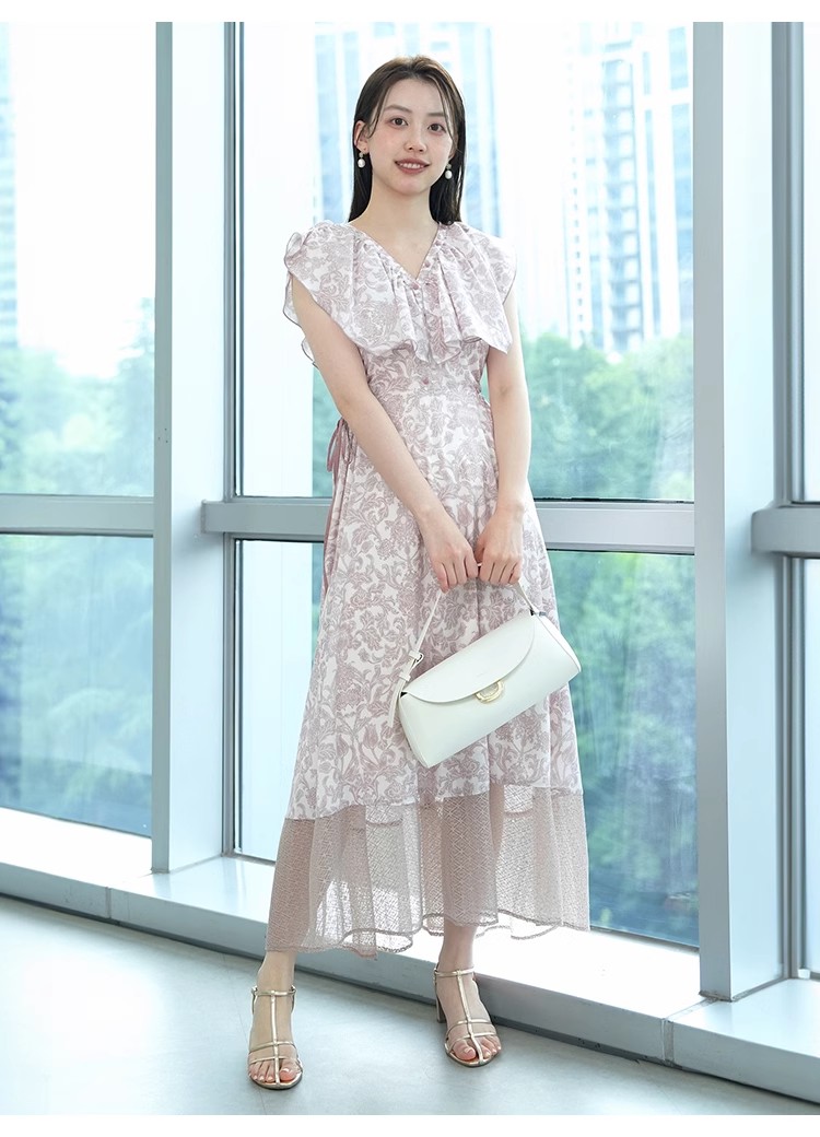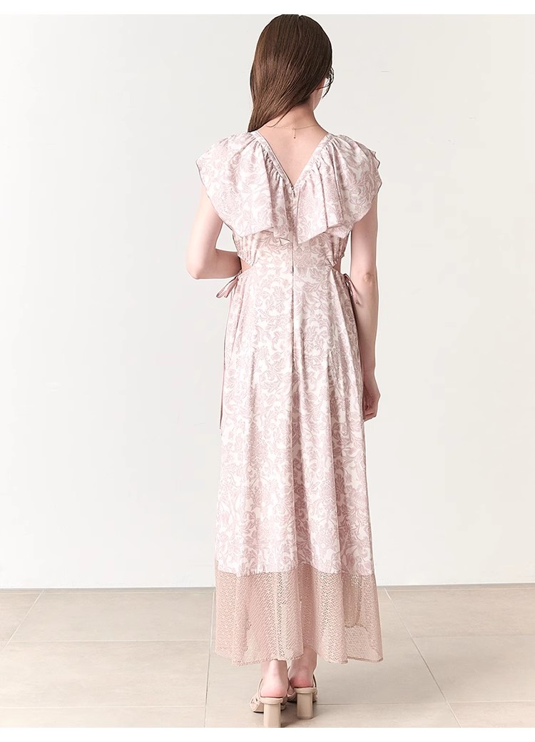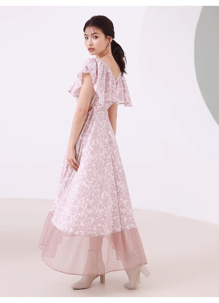 大胆なカットアウトやシアーなレースの切り替えでヘルシーな肌見せを演出する、トレンド感溢れるワンピース。「SNIDEL」オリジナルで柄を起こしたプリントを施し、華やかに仕上げました。襟ぐりにあしらわれたボリュームのあるフリルで、女性らしさはさらに加速。カットアウト部分はドロスト仕様なので、ギャザーの分量で肌見せの調節も可能です。