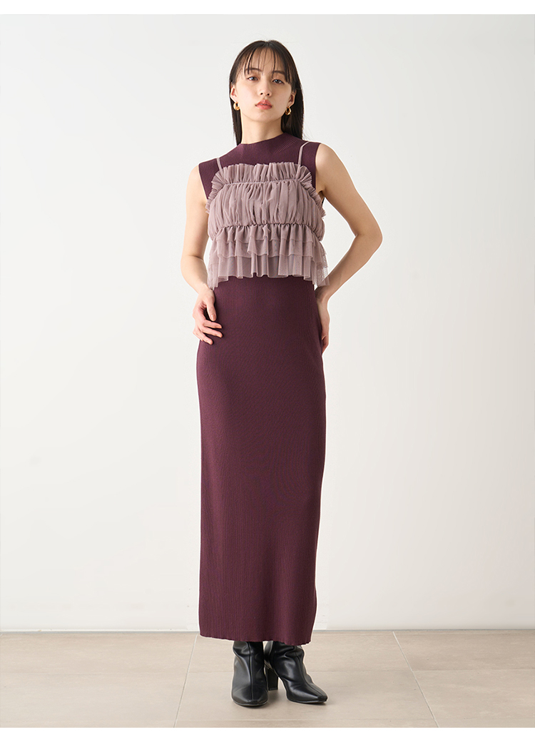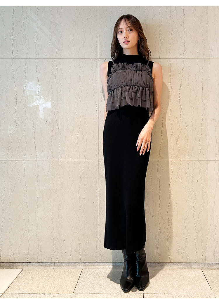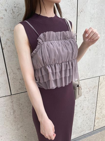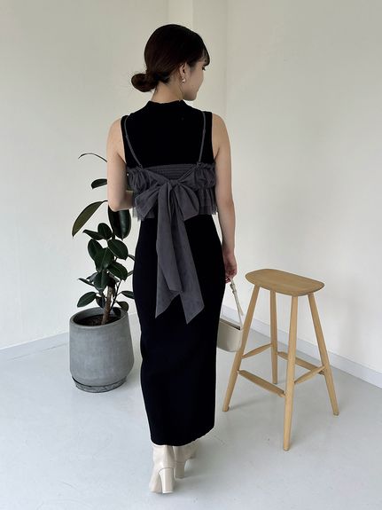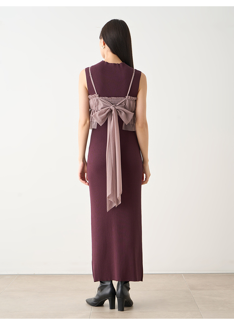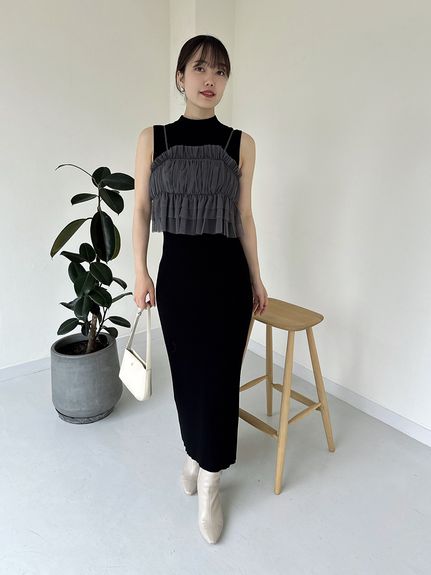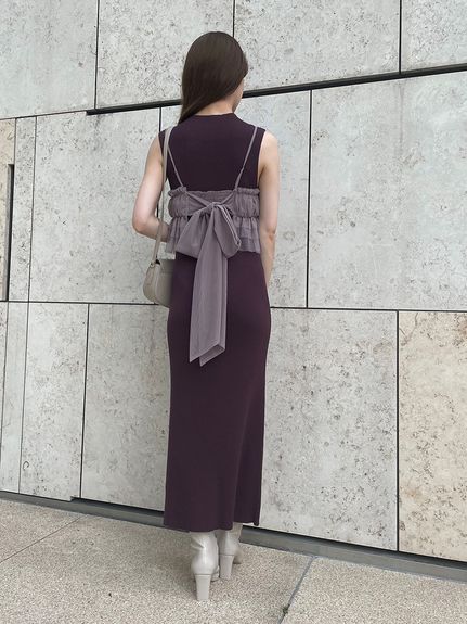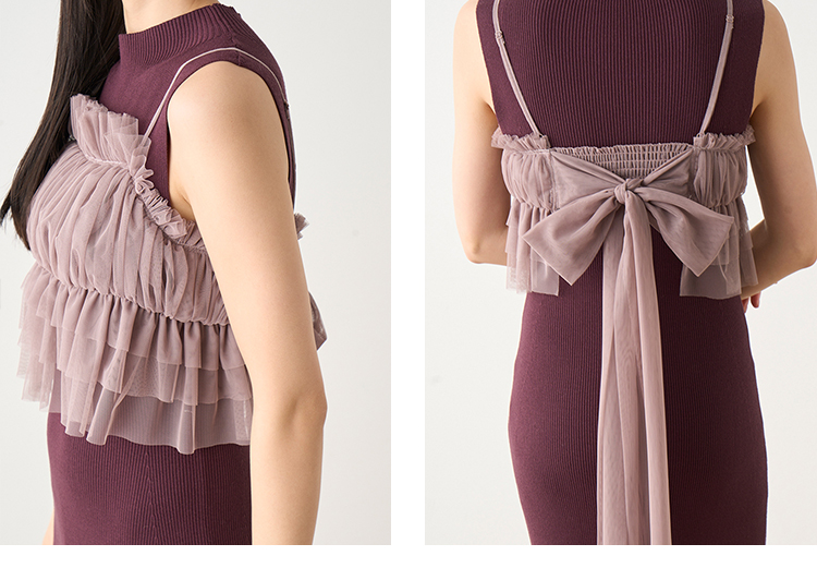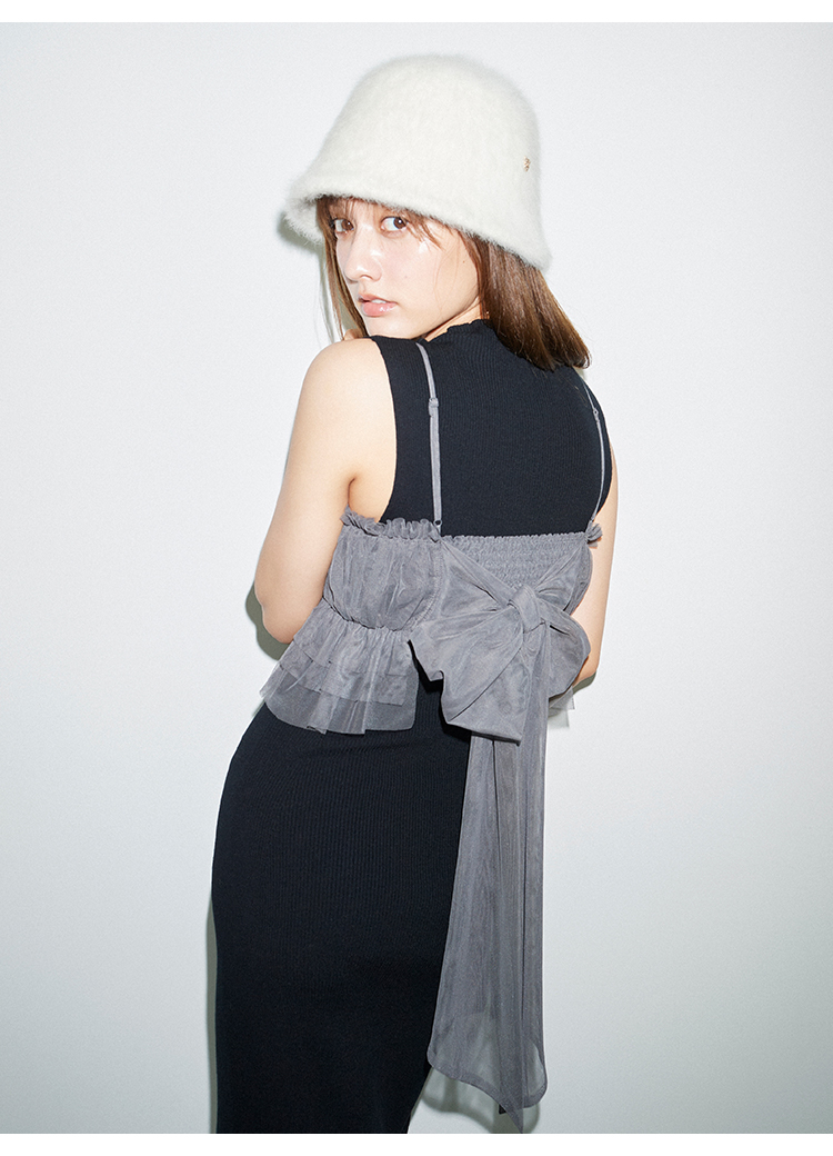 ボリューミーなチュールキャミとニットワンピースを組み合わせたセットアイテム。キャミソールは高めの位置で大きくリボンを結べるように設計。ニットワンピと合わせることで甘辛のバランスが良いスタイリングが完成します。それぞれ単体でも着用できるのでお得感があり、コーディネートの幅が広がります。
