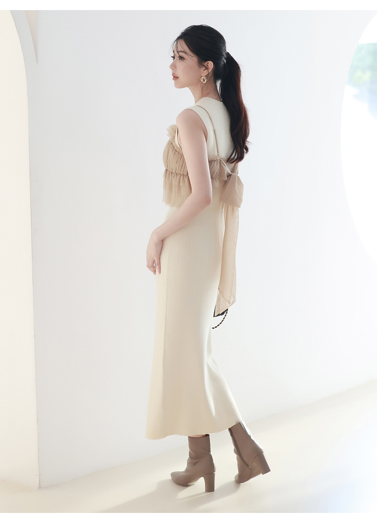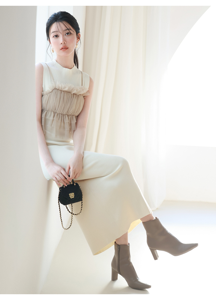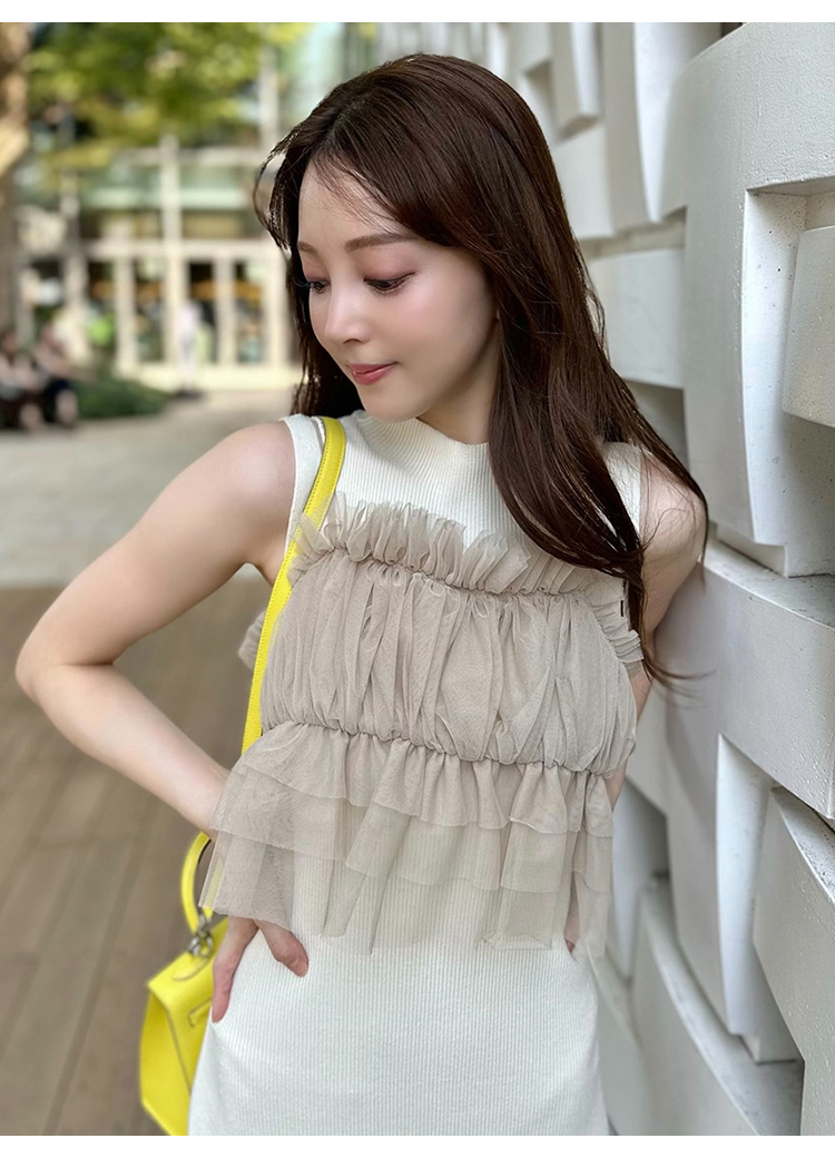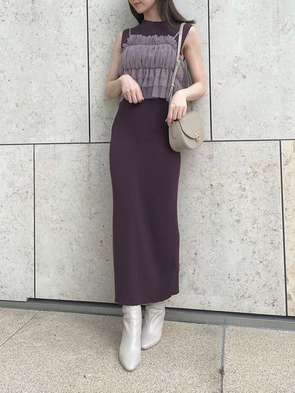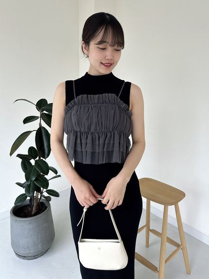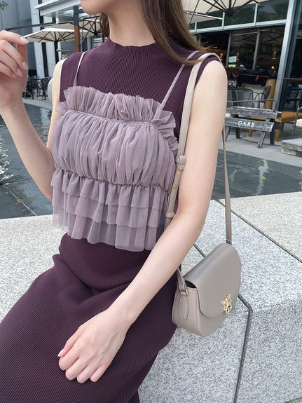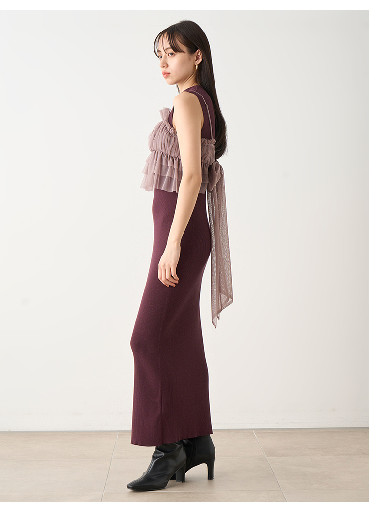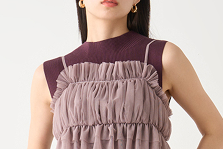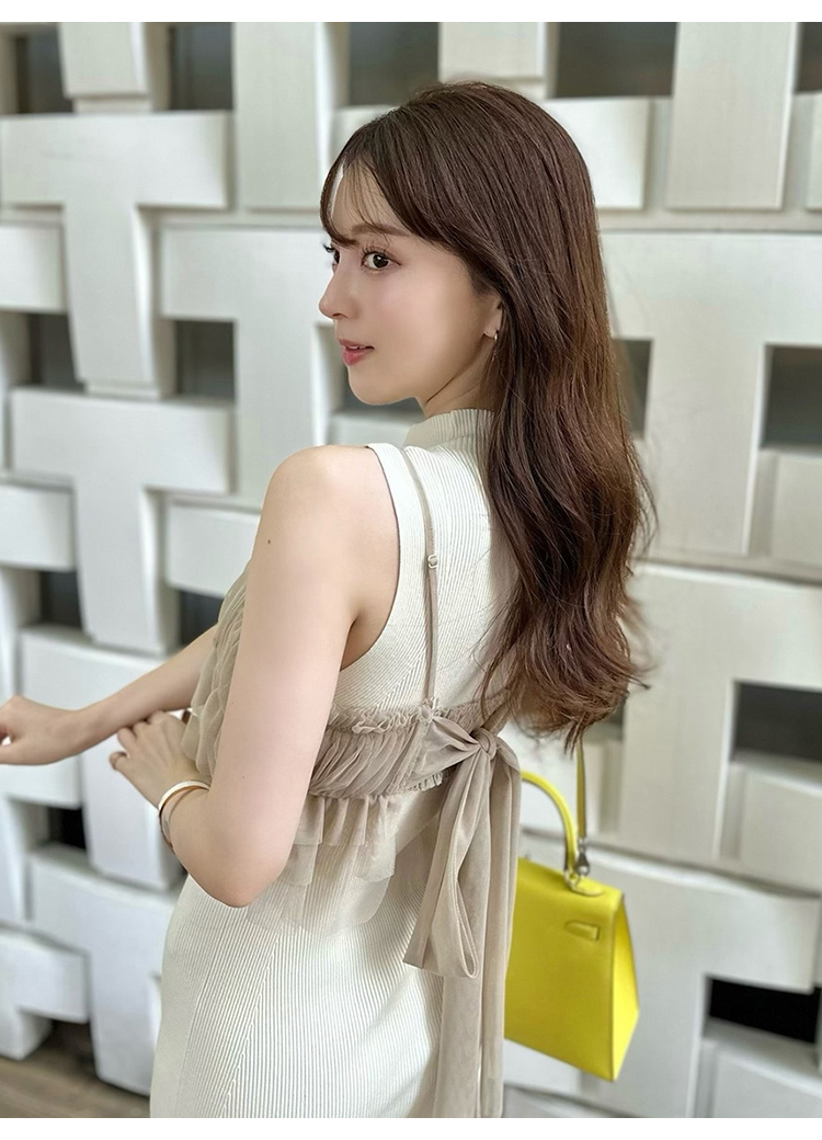 ボリューミーなチュールキャミとニットワンピースを組み合わせたセットアイテム。キャミソールは高めの位置で大きくリボンを結べるように設計。ニットワンピと合わせることで甘辛のバランスが良いスタイリングが完成します。それぞれ単体でも着用できるのでお得感があり、コーディネートの幅が広がります。