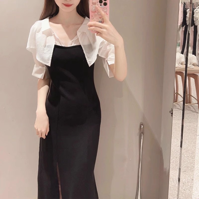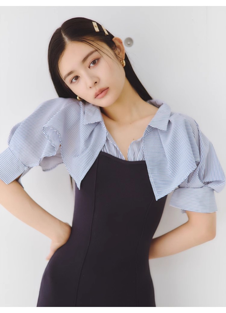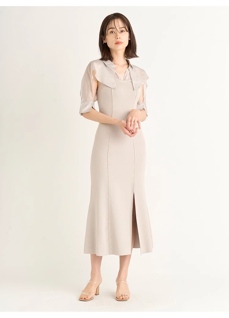 インにシャツをレイヤードしているかのような、ドッキングデザインのワンピース。ひらりと広がるフリルや袖のスリットで、女性らしいエッセンスをプラスしました。ボディにはストレッチ入りのニットを使用し、程よいフィット感のある美シルエットを演出。裾には深めにスリットを入れ、今年らしい抜け感を添えています。