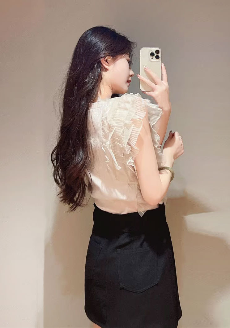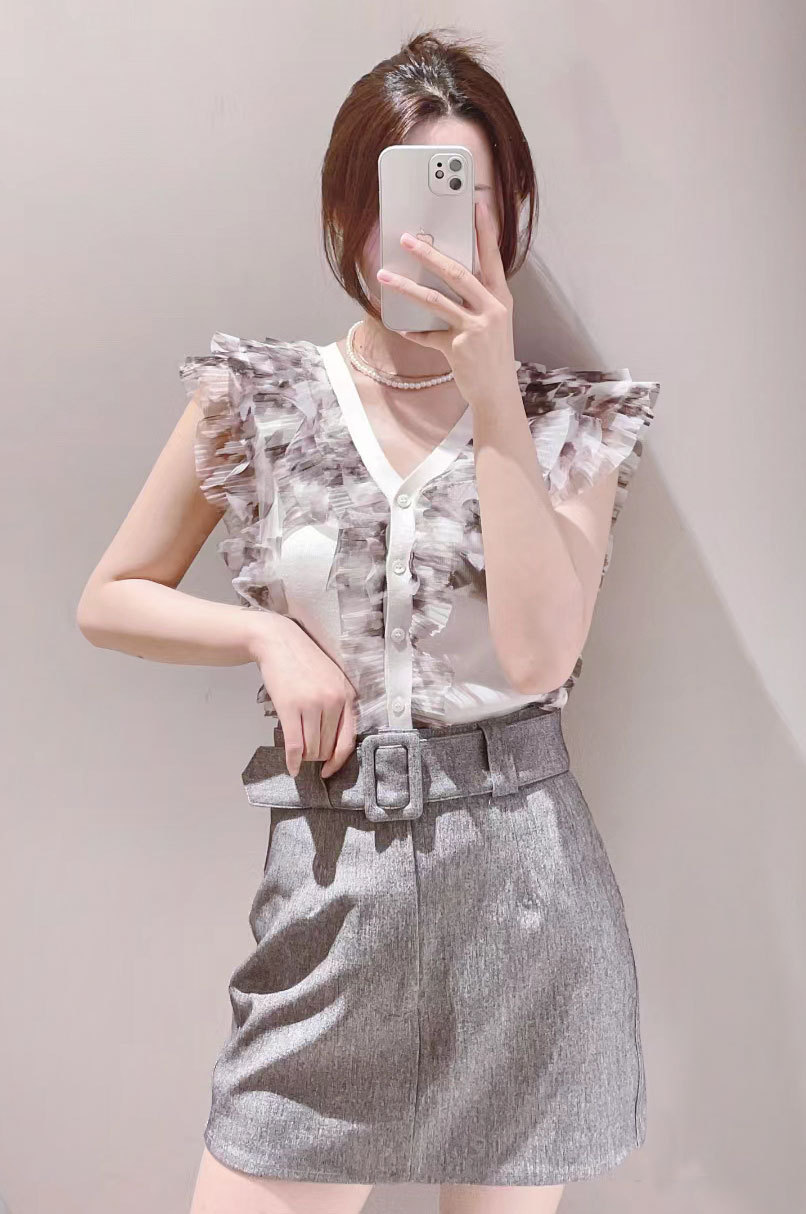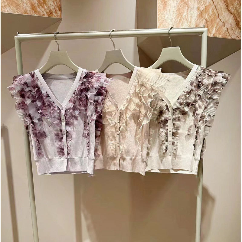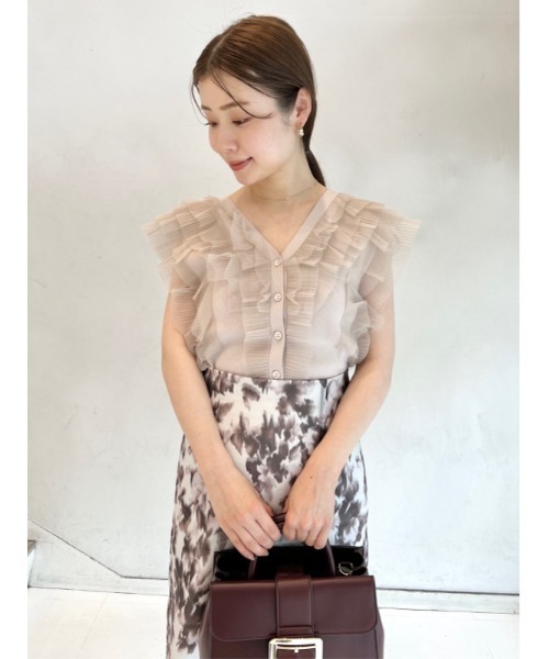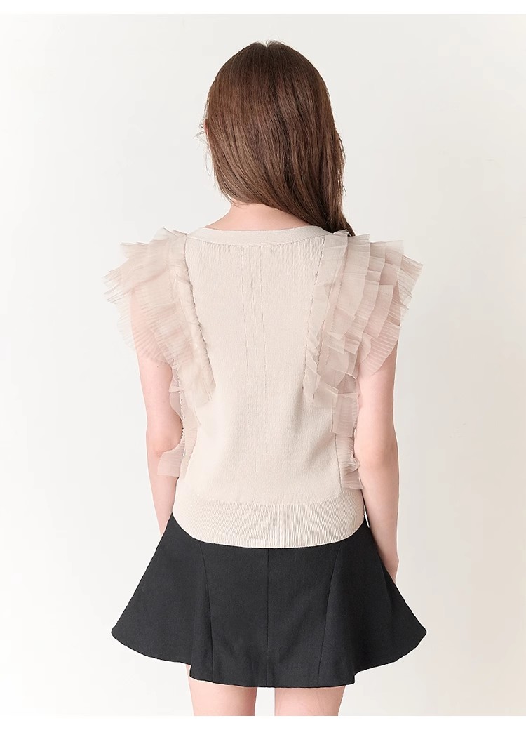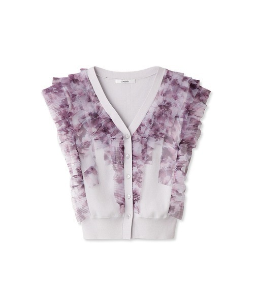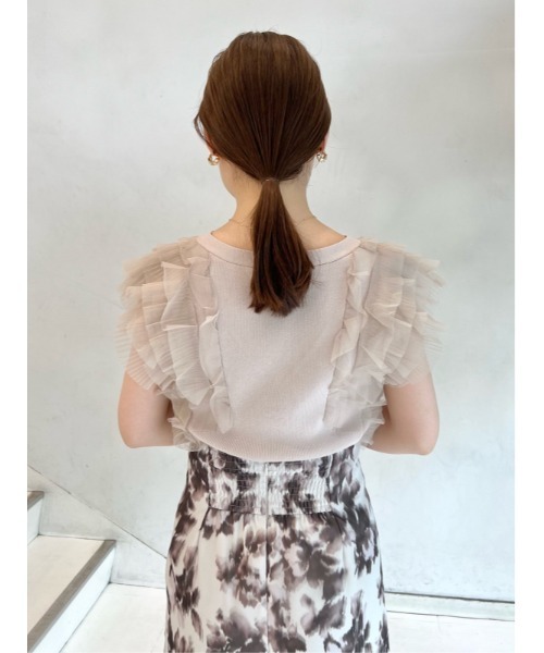 綺麗めな質感のニットにチュールフリルをドッキングしました。淡い色合いで女性らしさ高まるピンクベージュ、ベージュ、ラベンダーの3色展開でお届けします。
