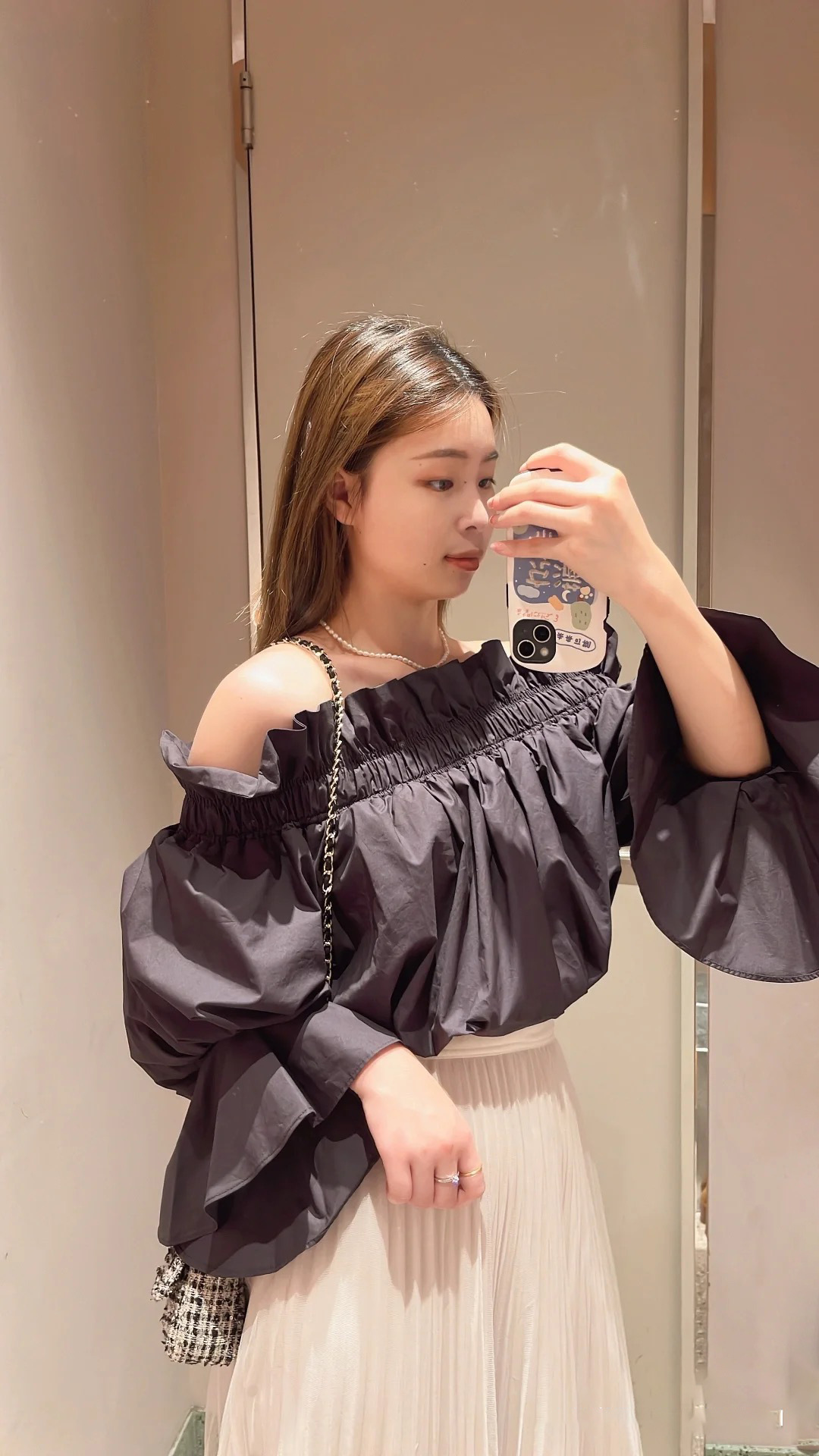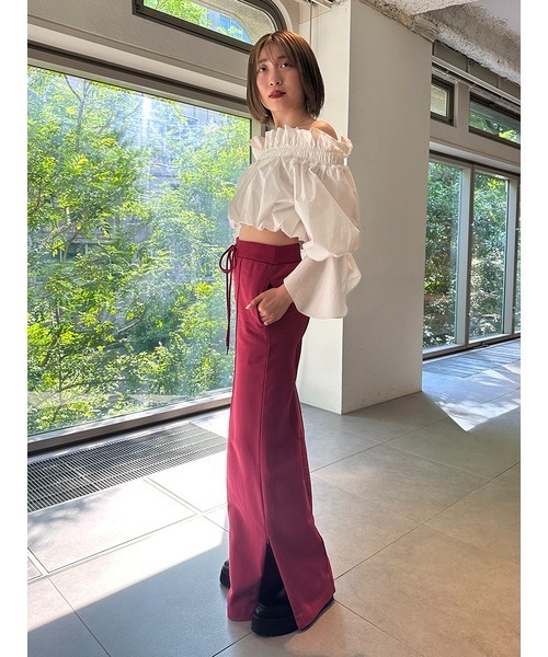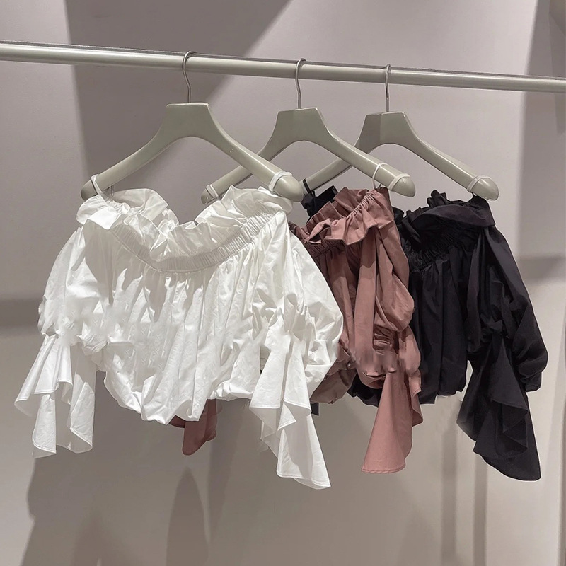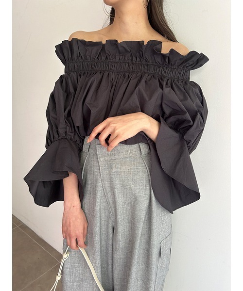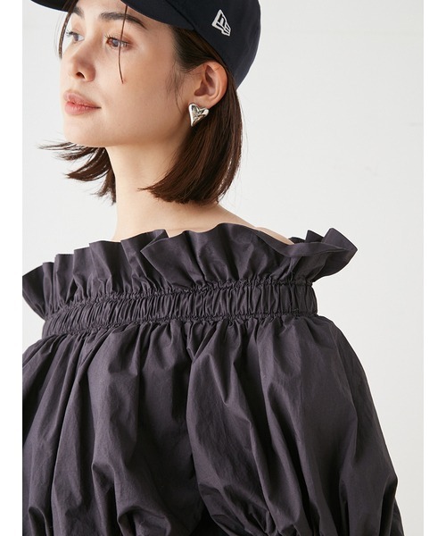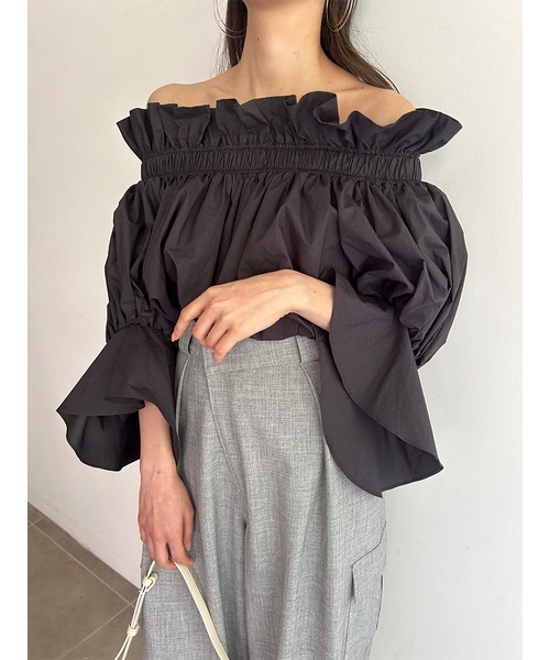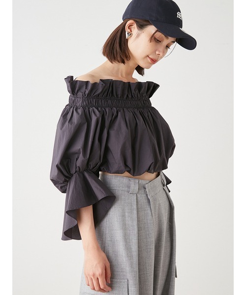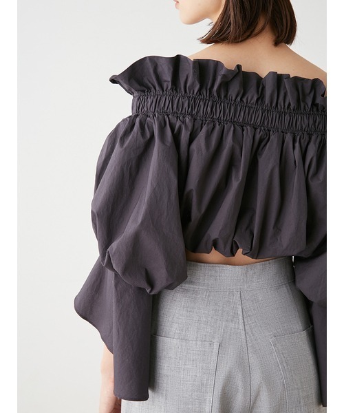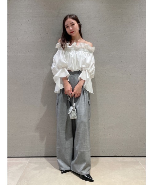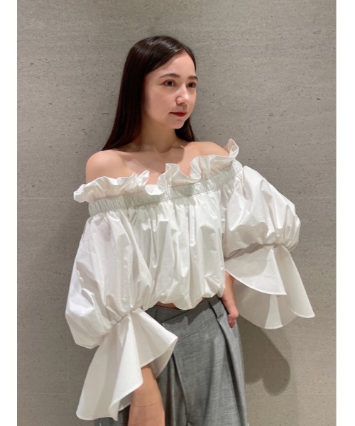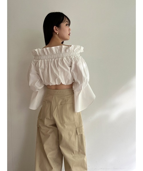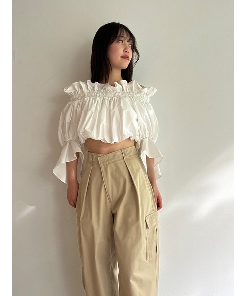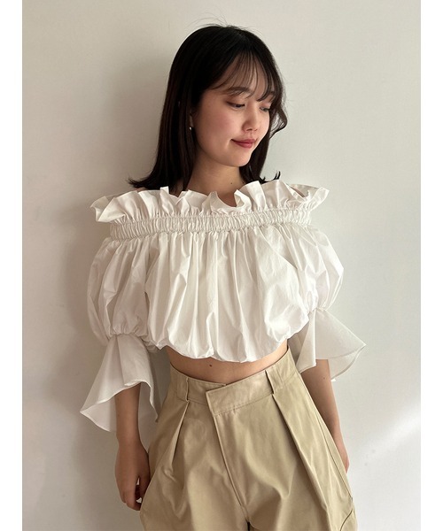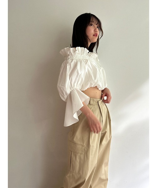 前シーズンに続きトレンド継続中のクロップド丈ブラウス。ふんわりとしたバルーンシルエットの程よいボリューム感がウエスト周りを華奢に見せてくれます。袖のフレアデザインも前後差を付けることにより華やかながらも重たい印象に見えるのを防ぎました。レディライクなアイテムにはもちろん、カジュアルなボトムなどと合わせたMIXスタイルもおすすめです。