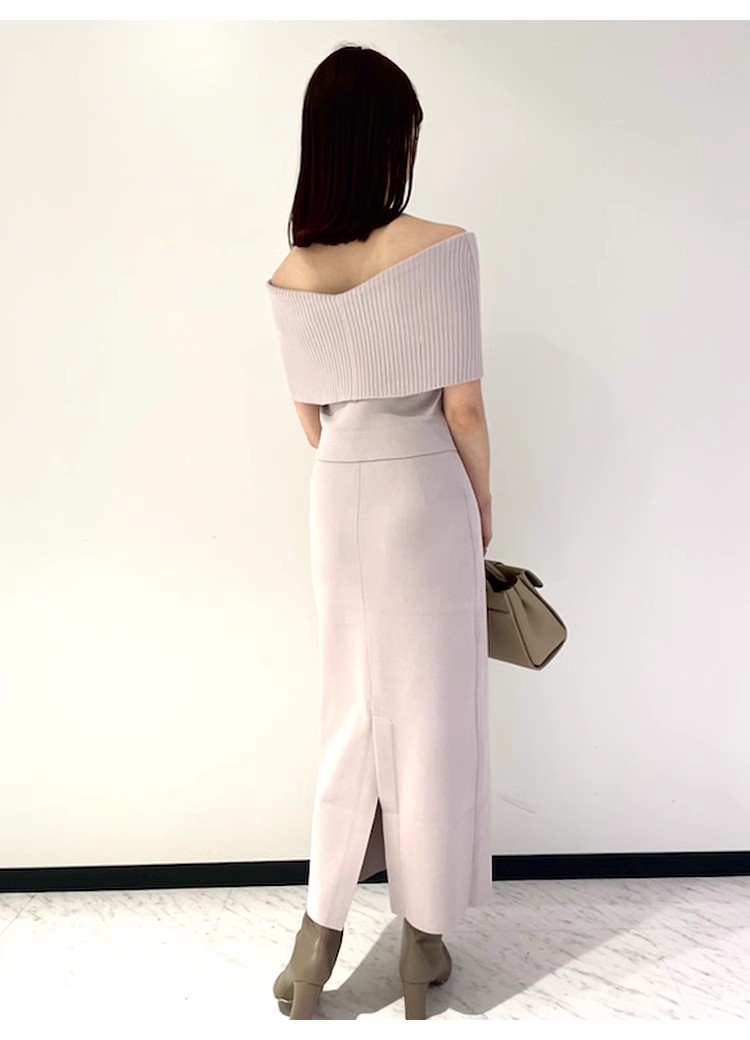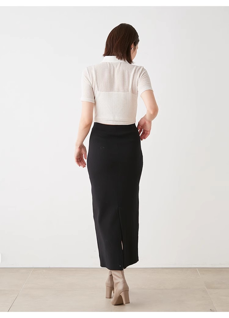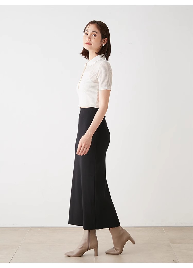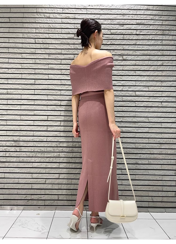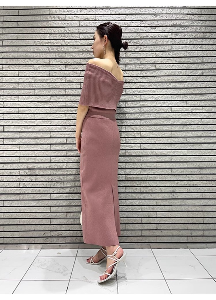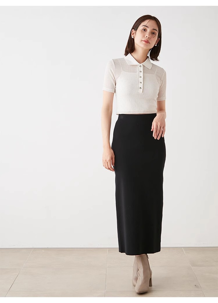 総針編みできれいめに仕上げたニットスカート。ボディラインを綺麗に見せるタイトシルエットで、スタイルアップ効果絶大の1着です。バックヘムには深めのスリットを入れ、女性らしい肌見せを演出。どんなシルエットのトップスとも合わせやすく、同素材を使用したニットトップス(SWNT234173)とセットアップでの着用もおすすめです。