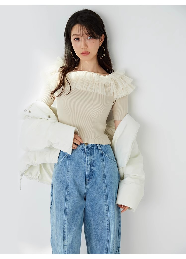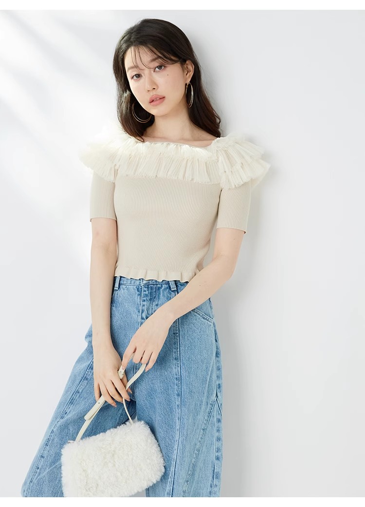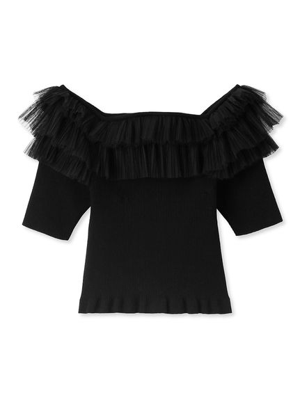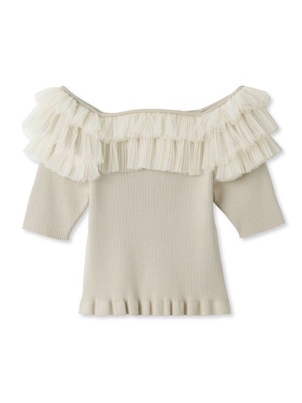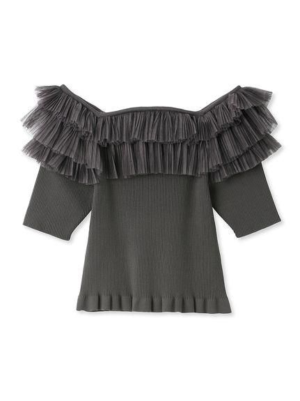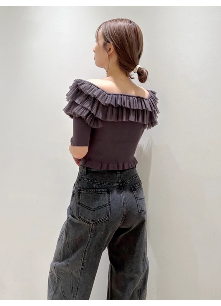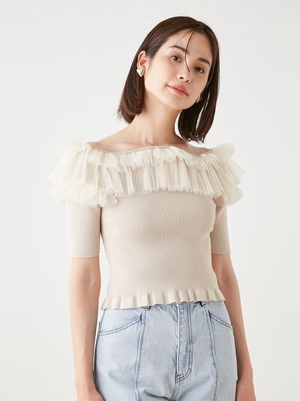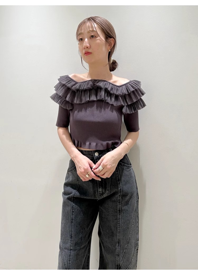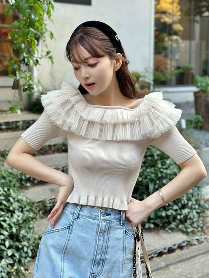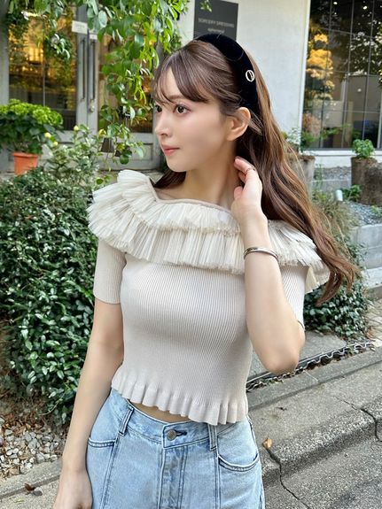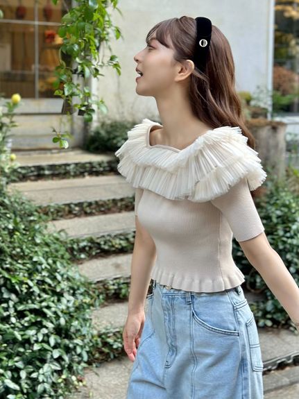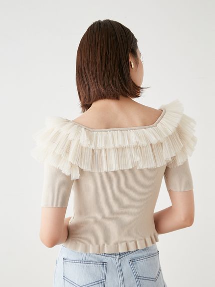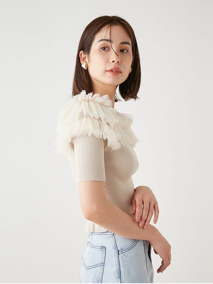 【顔周りを華やかに見せるチュールフリルのニットトップス】