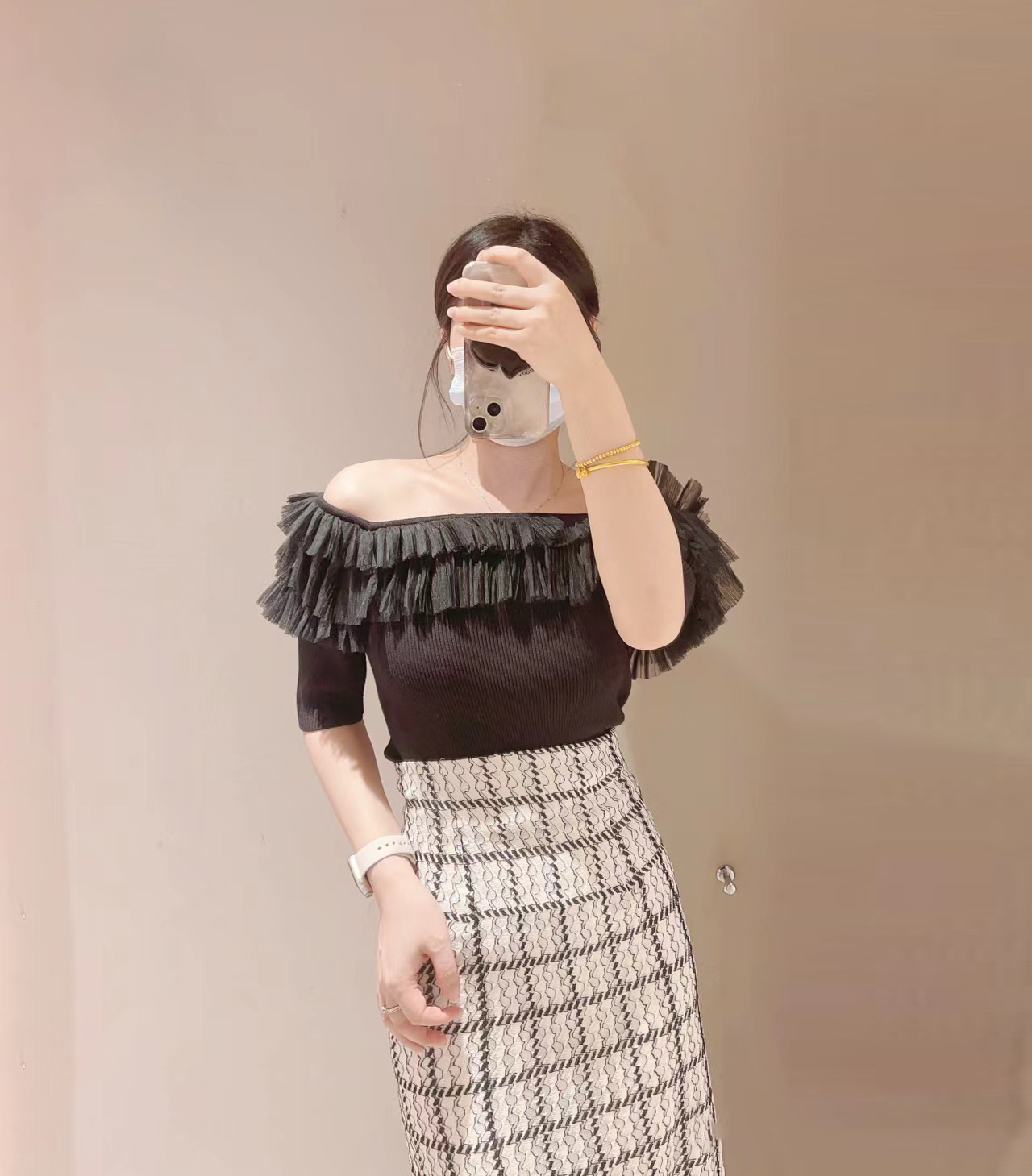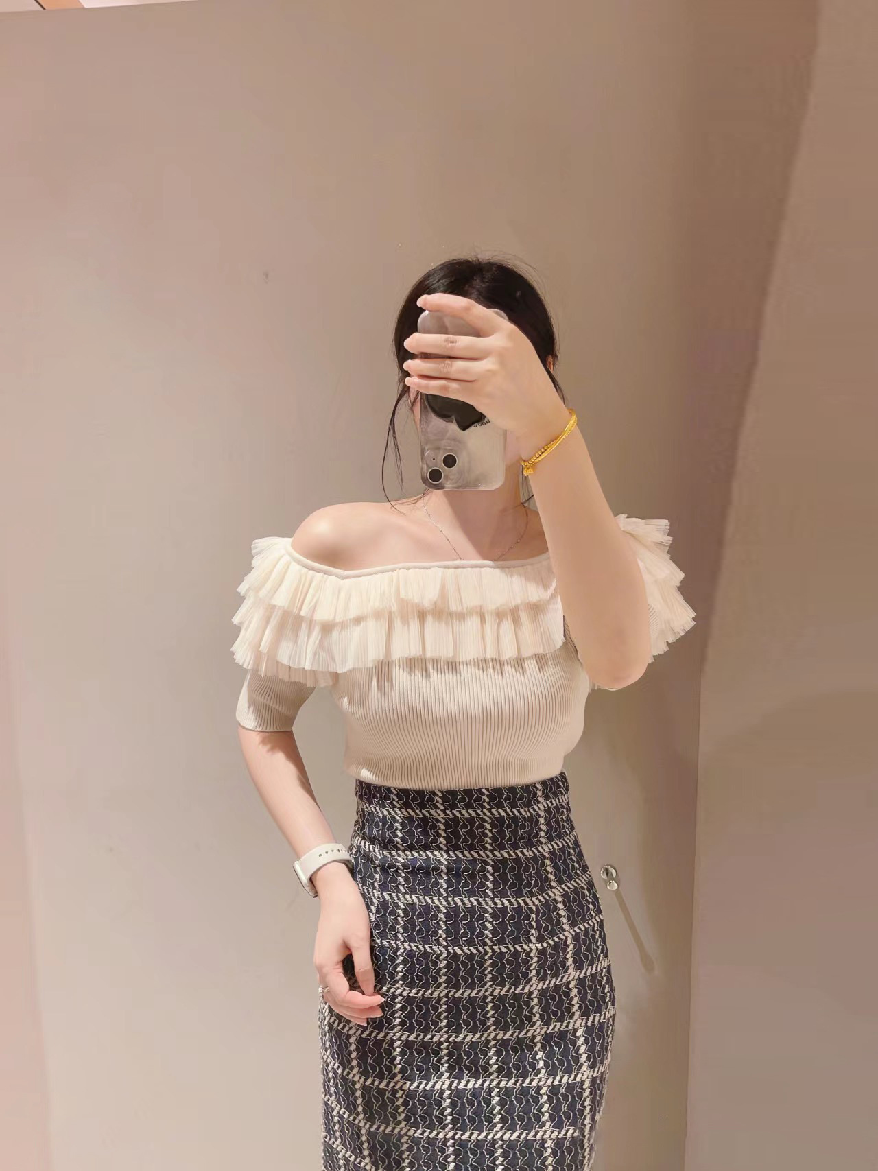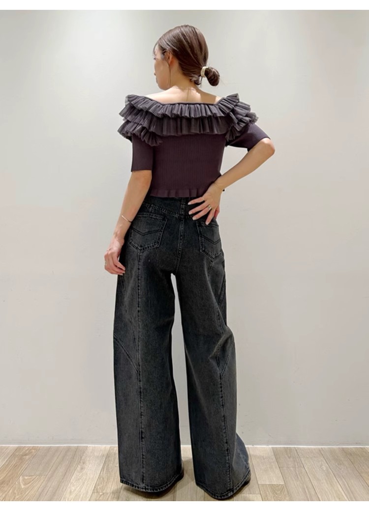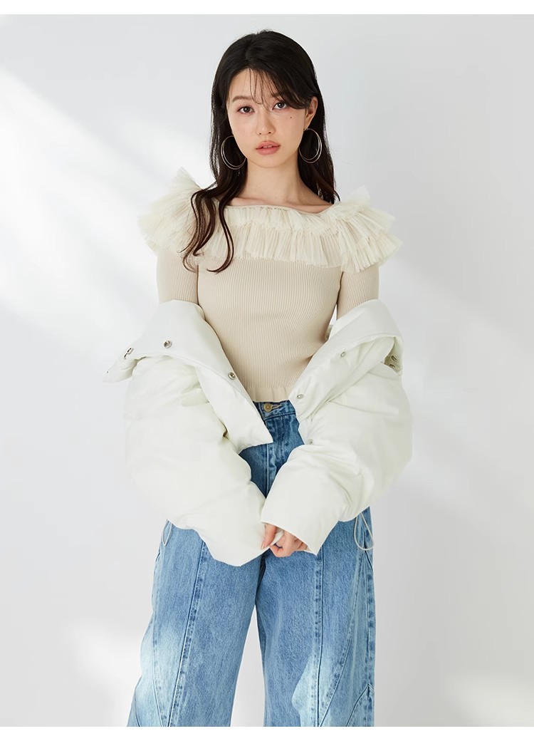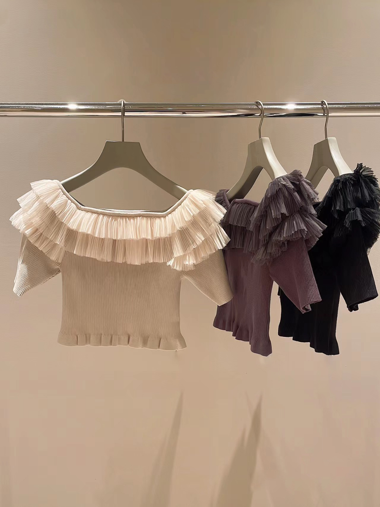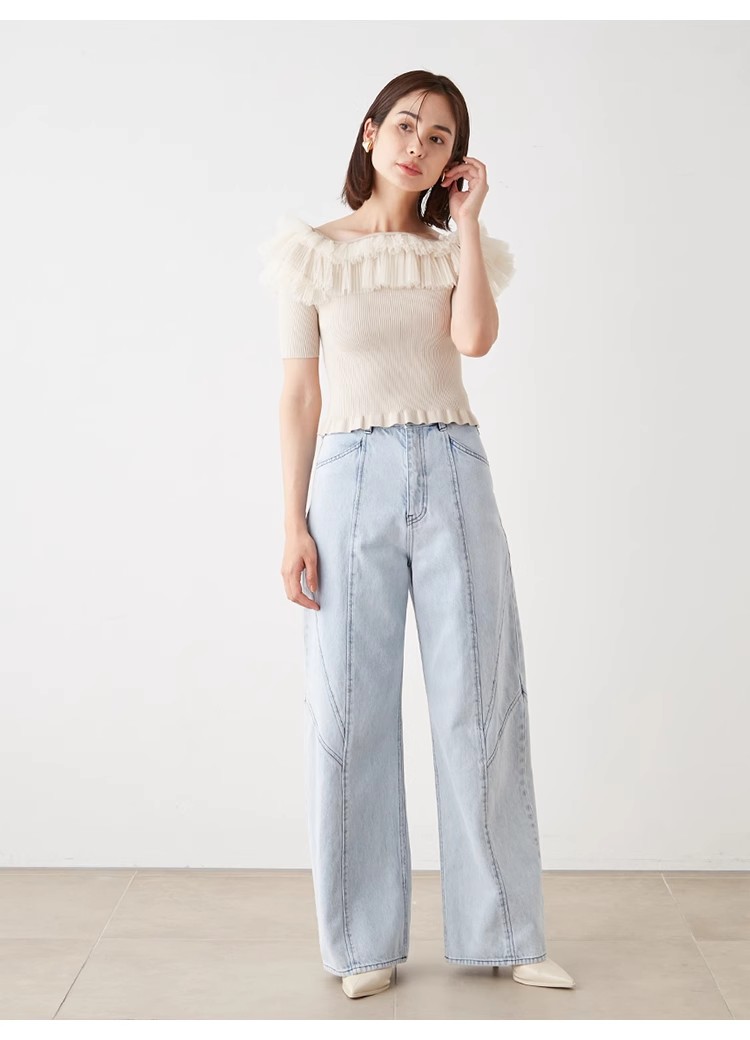 【顔周りを華やかに見せるチュールフリルのニットトップス】