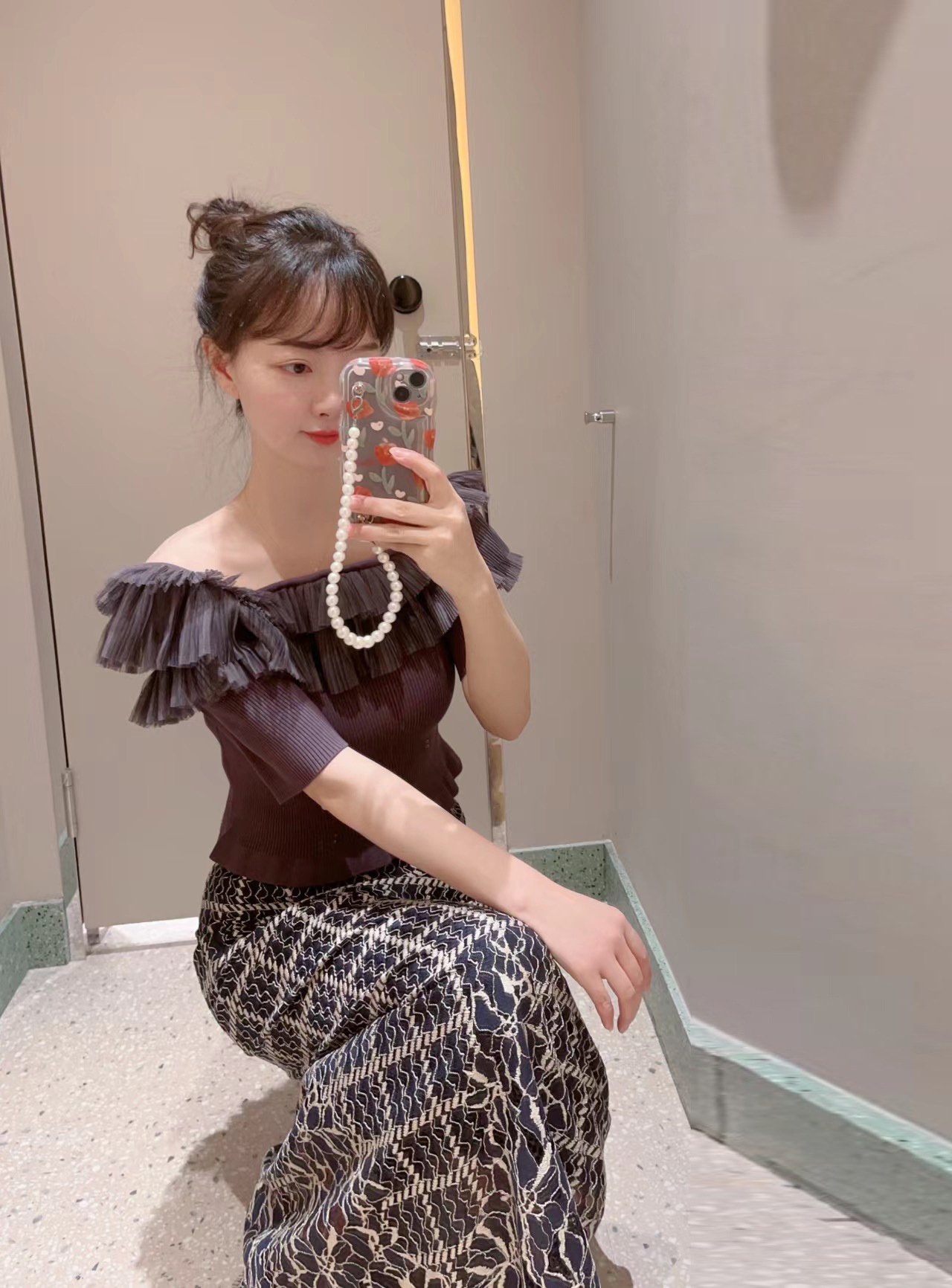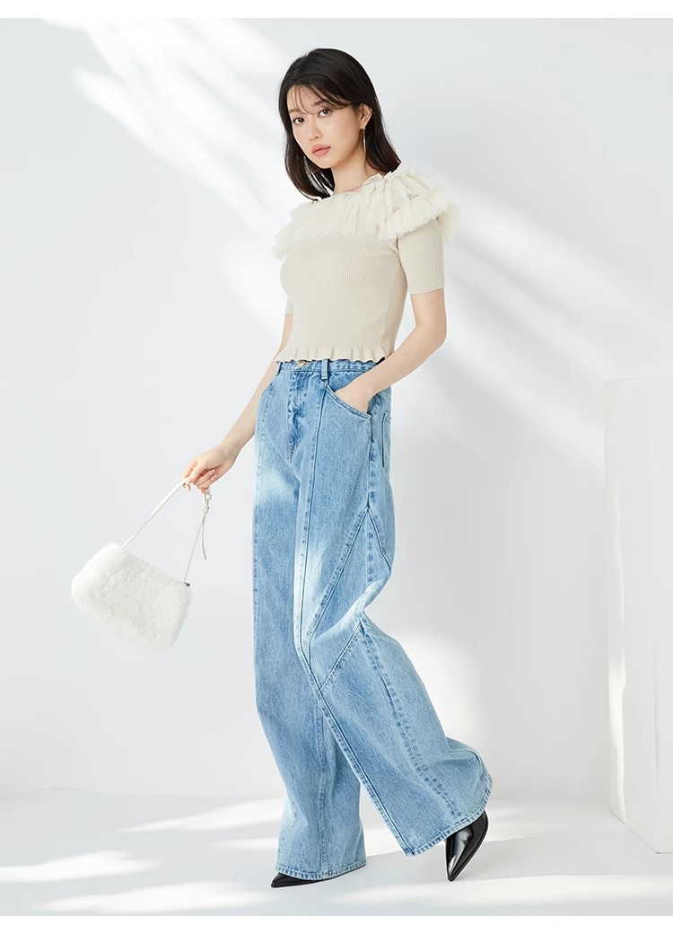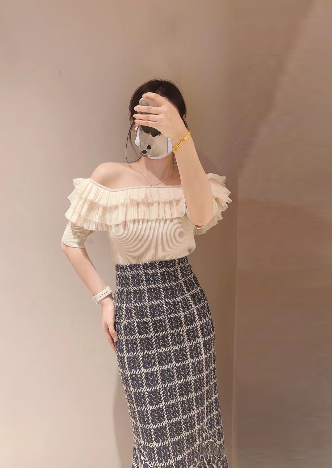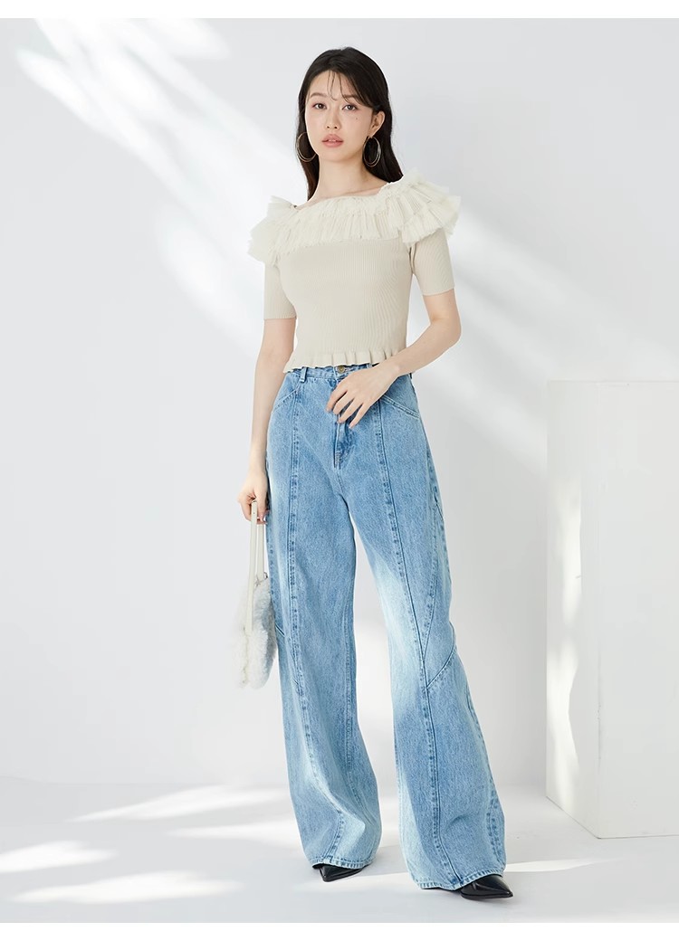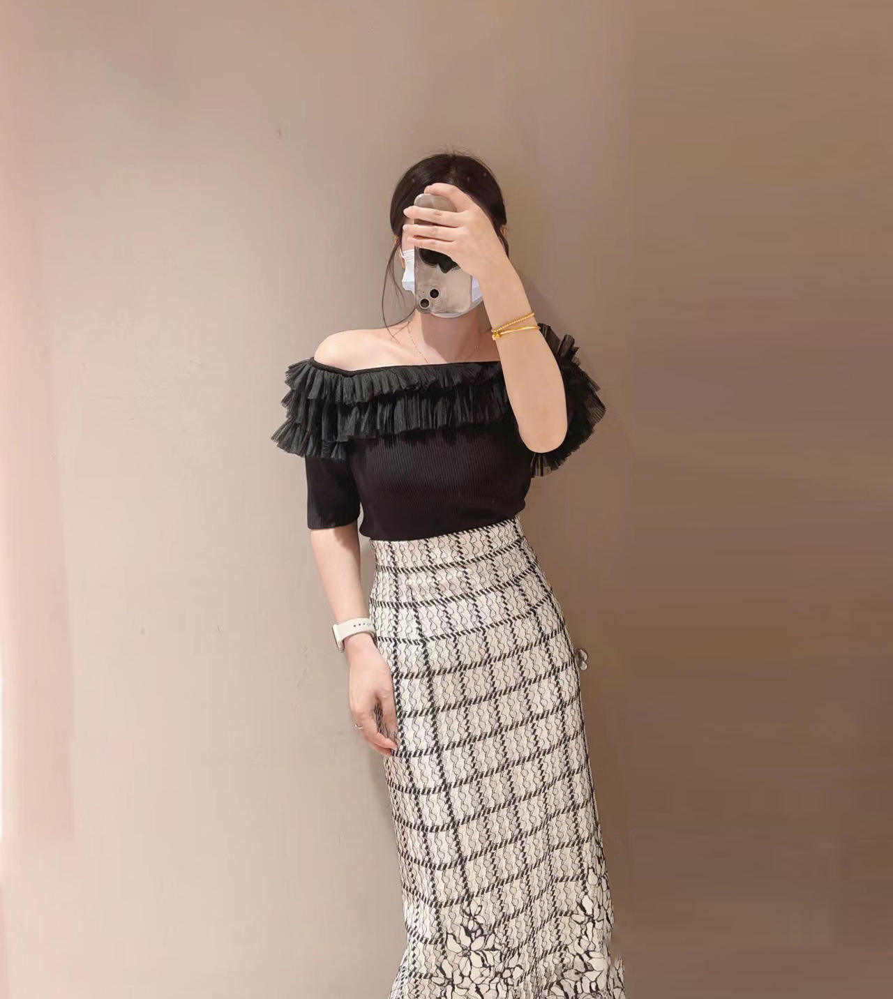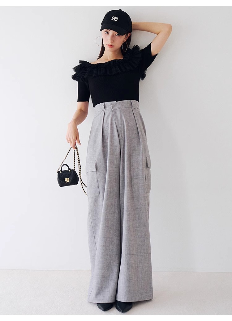 【顔周りを華やかに見せるチュールフリルのニットトップス】