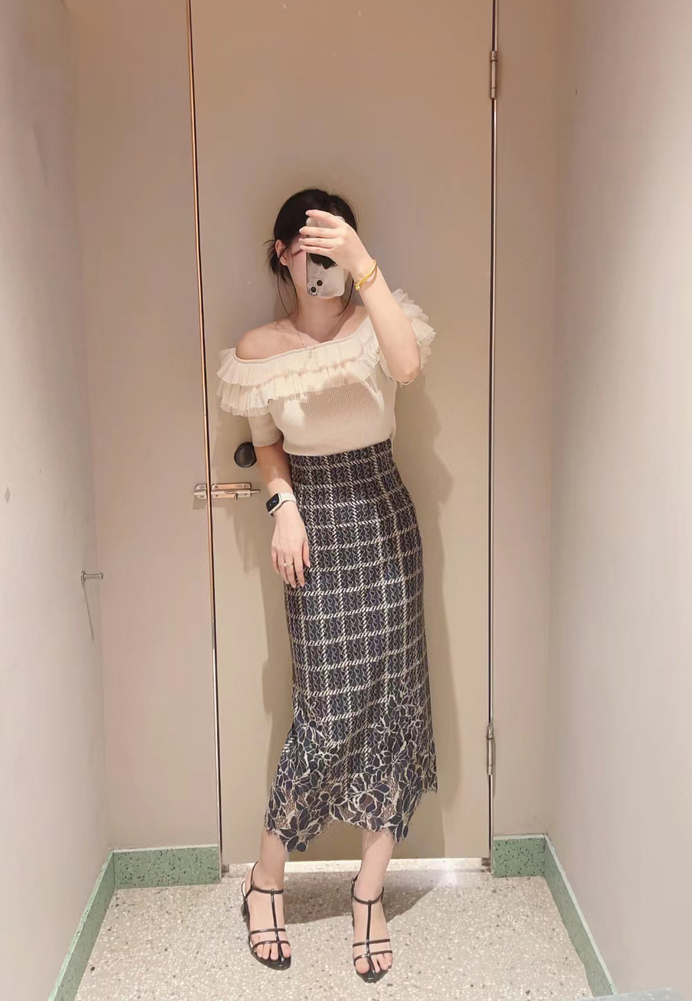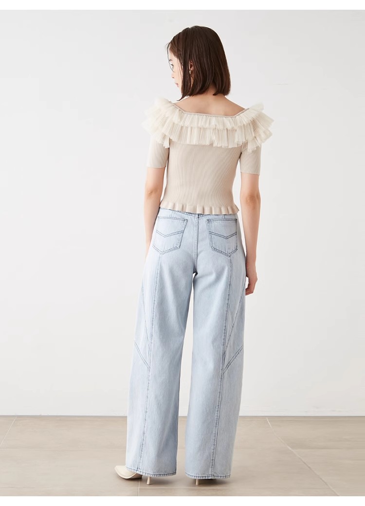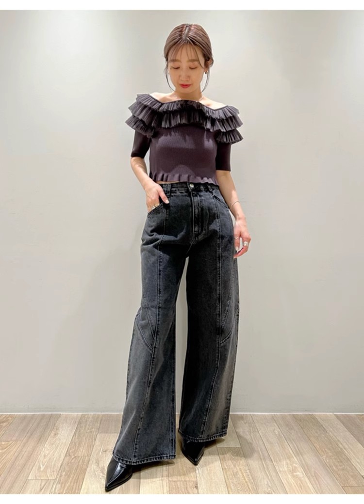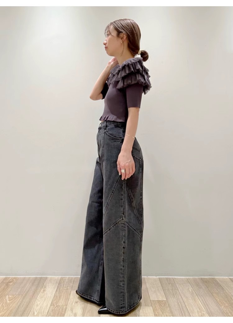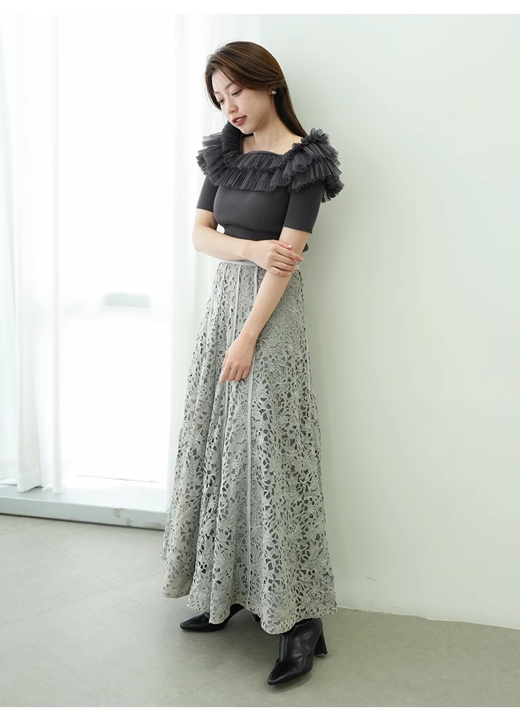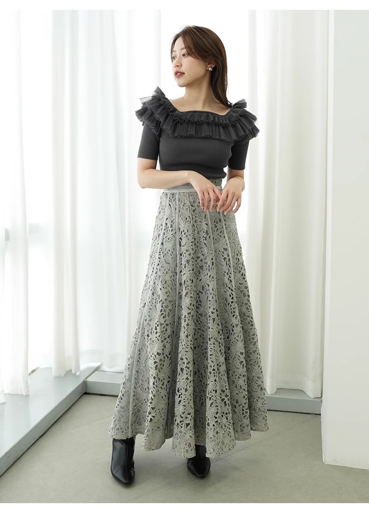 ボリュームたっぷりのチュールフリルをあしらった、華やかな雰囲気のニットトップス。裾部分は編地の変化でフリリーに仕上げ、どこまでも女性らしい1着です。フィット感のあるタイトシルエットがボディラインを美しく見せスタイルアップ効果を発揮。甘めのディテールなのでデニムなどと合わせたMIXスタイルがおすすめです。