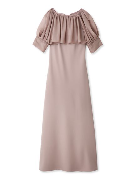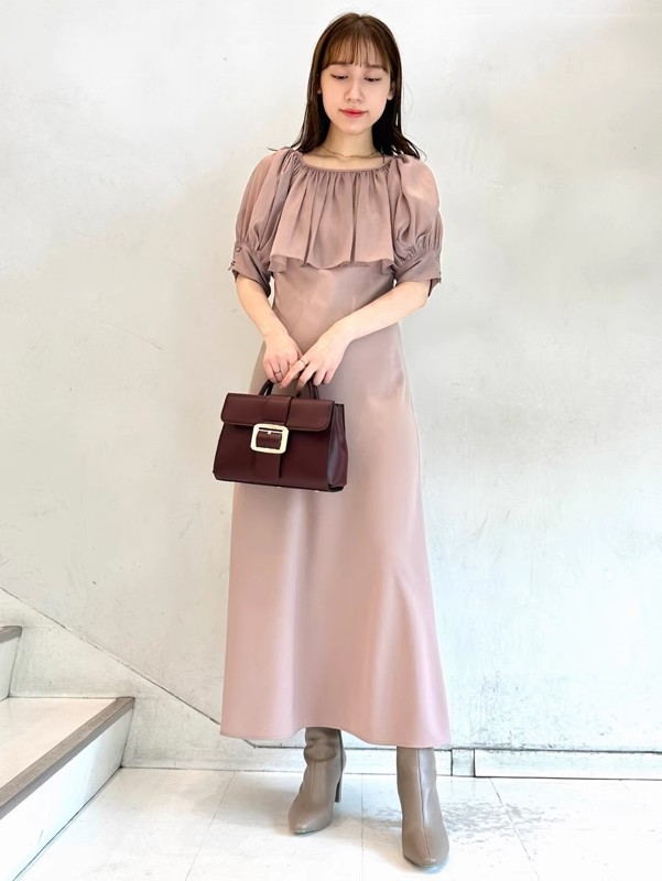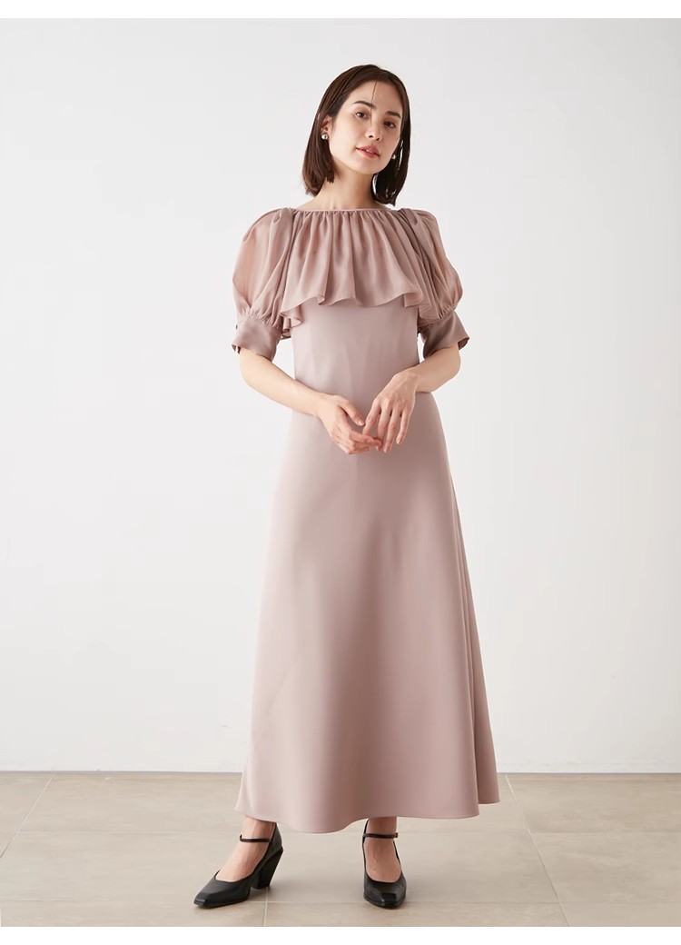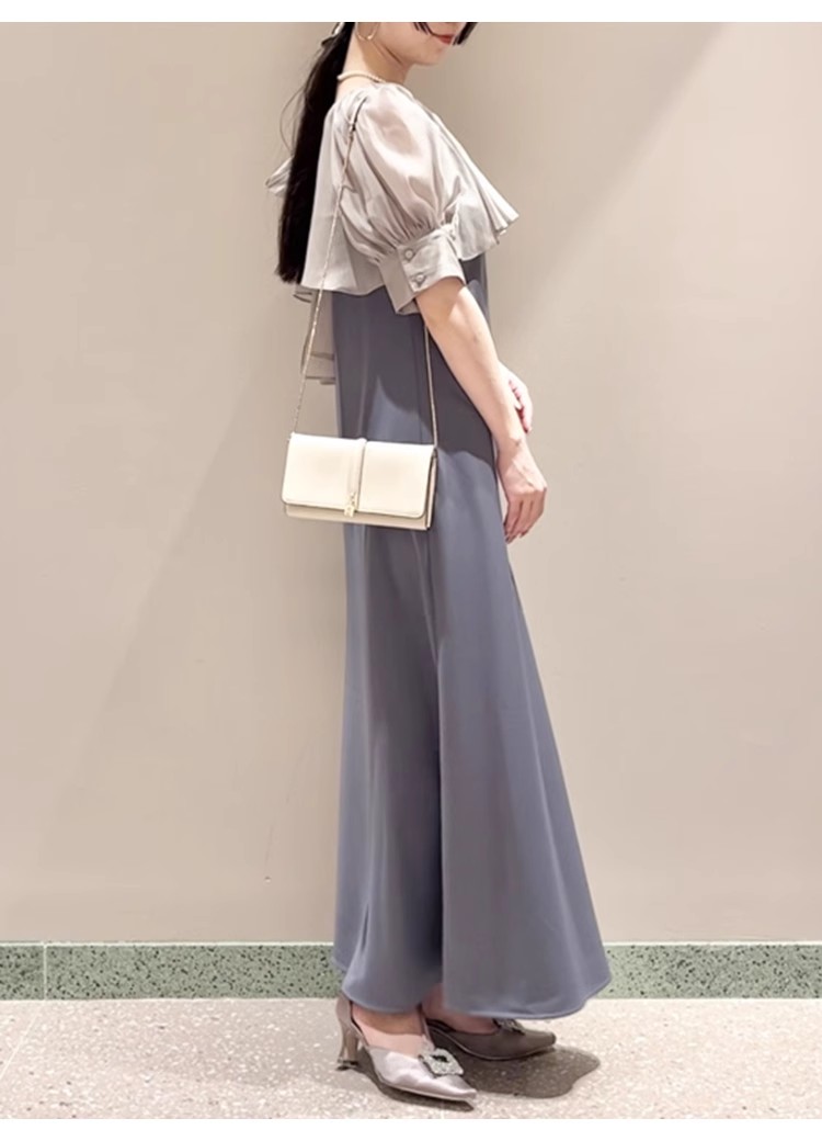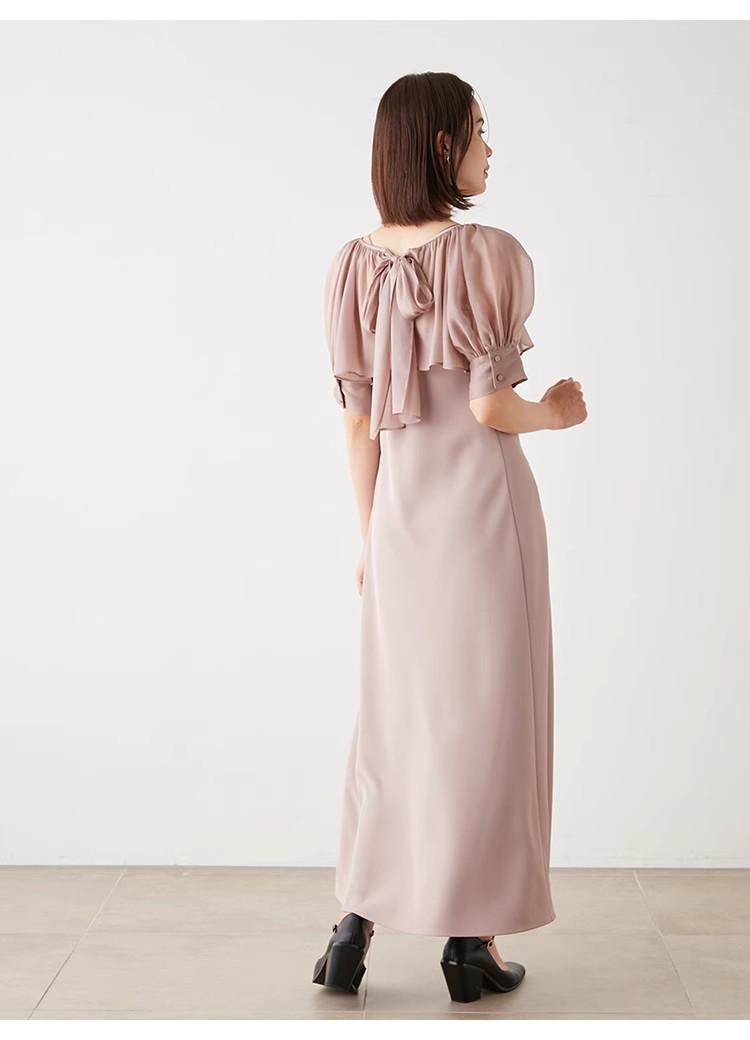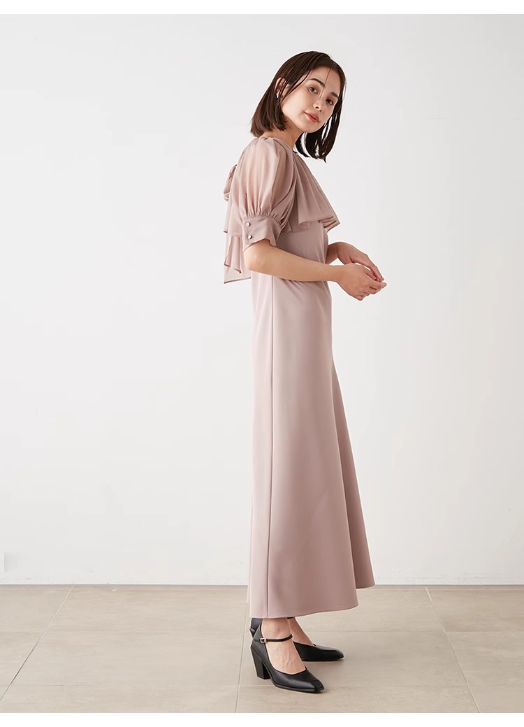程よい光沢でピタッとしすぎないシルエットのキャミワンピースに、シフォンのボレロをレイヤードしたセットアイテム。品が良く華やかなルックスでオケージョンシーンにぴったりの1品です。ボレロはたっぷりのギャザーでエレガントなフレアラインを演出し、バックリボンで愛らしさをプラス。ワンピースには華奢なストラップをあしらい、どこまでも女性らしく仕上げています。