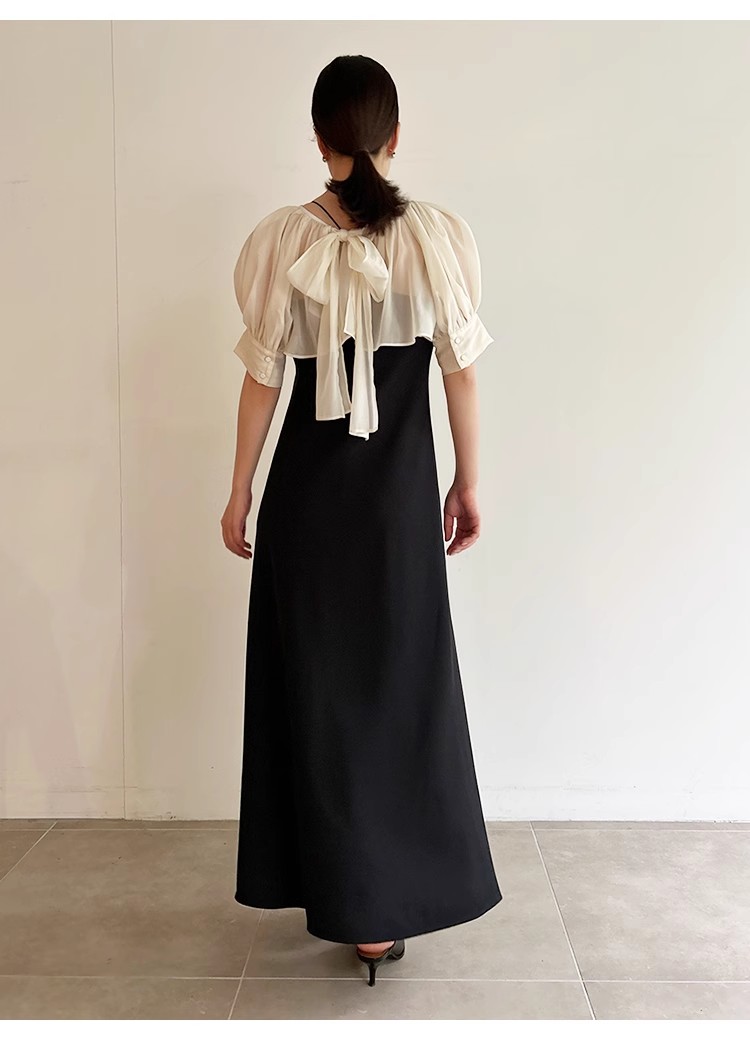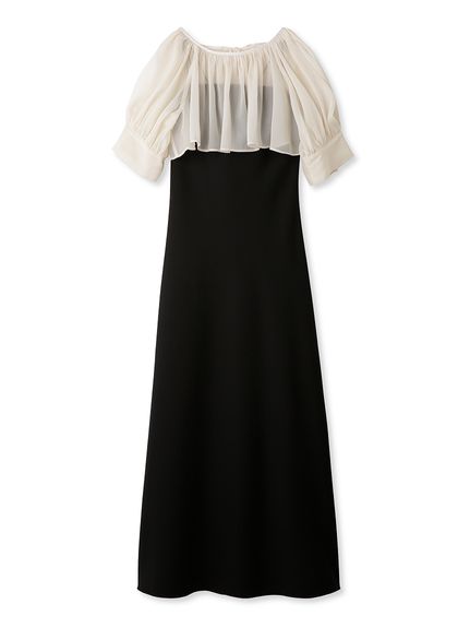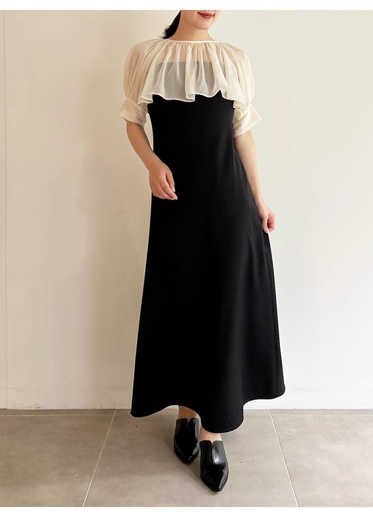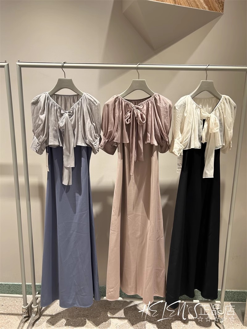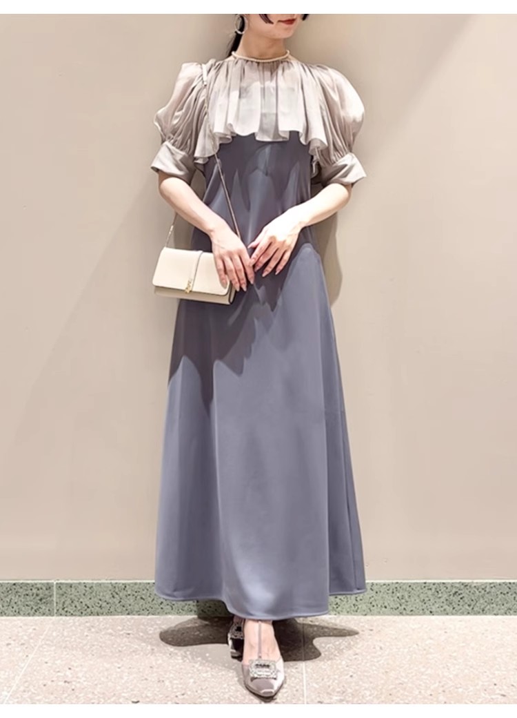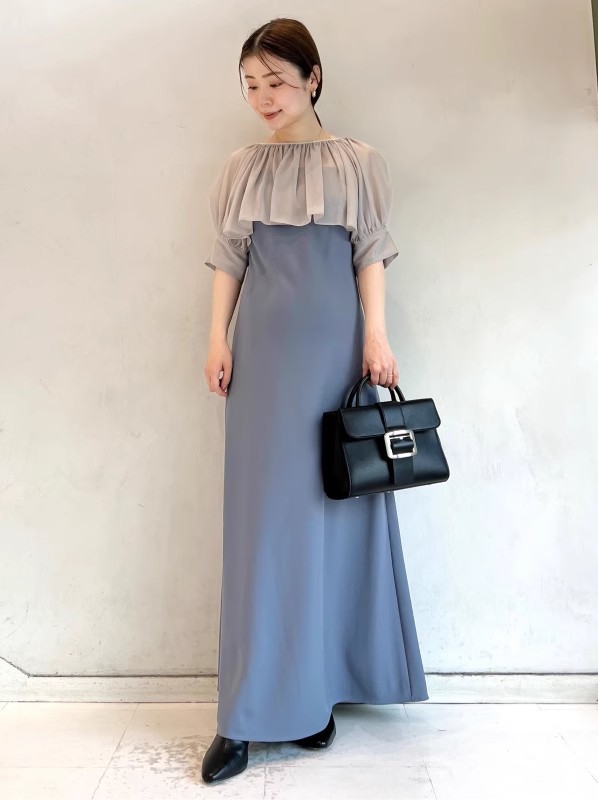 ボレロには程よい透け感のシフォン素材、ワンピースには上品な光沢の布帛を使用しました。バイカラーの組み合わせがモードなブラック、くすみカラーが今年らしいブルー、女性らしいニュアンスカラーのモカの3色展開です。
