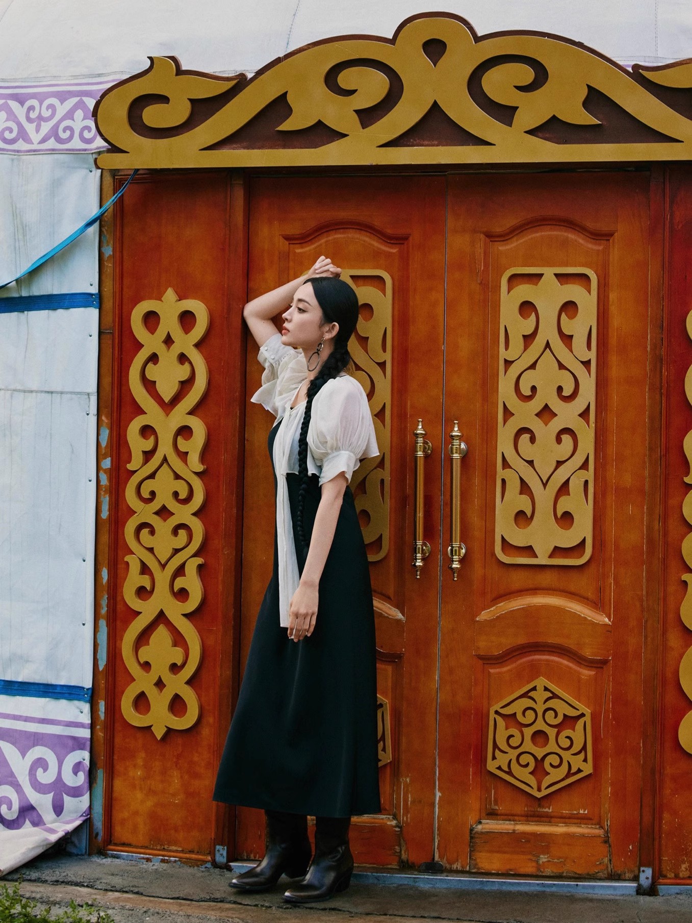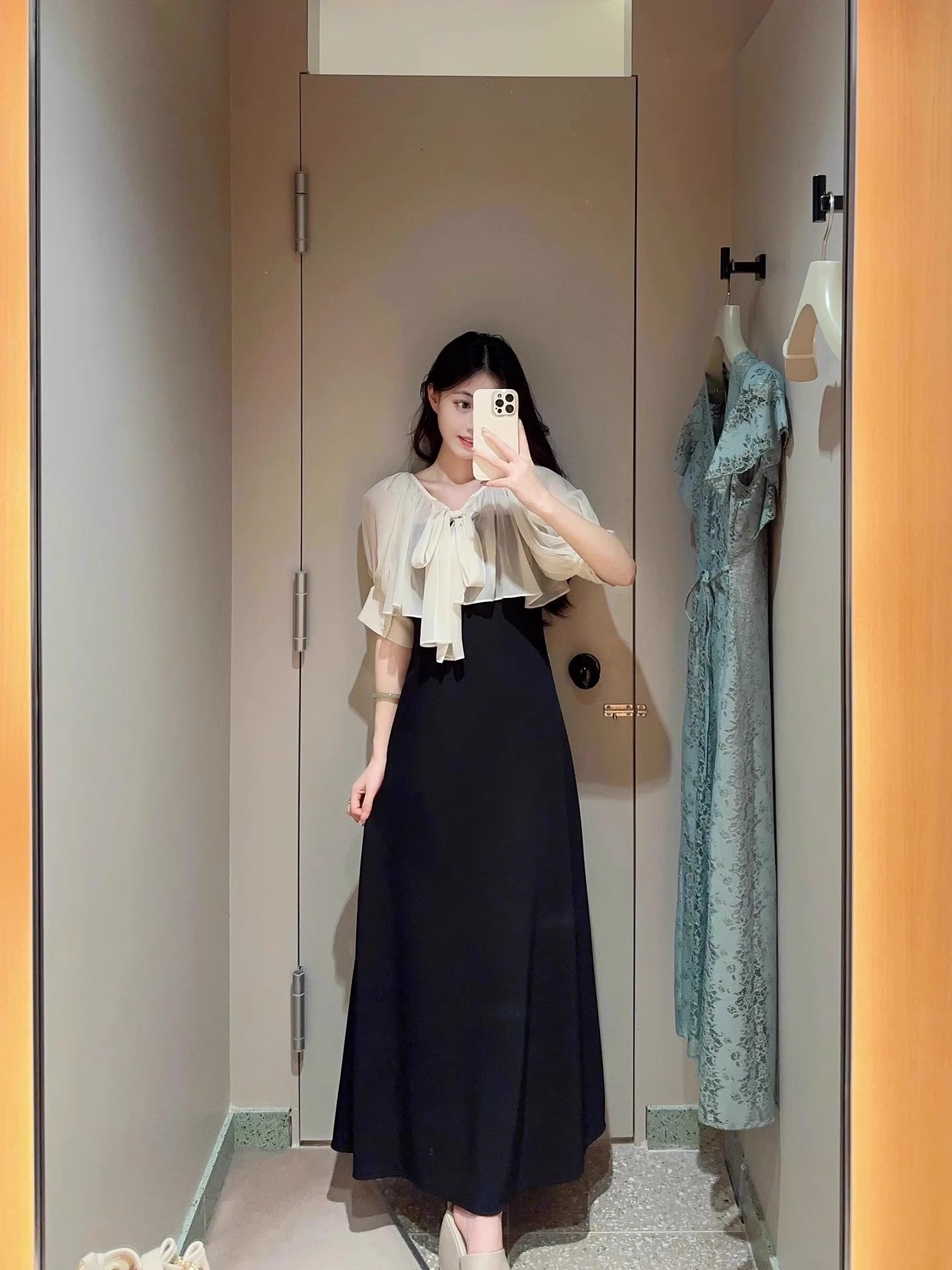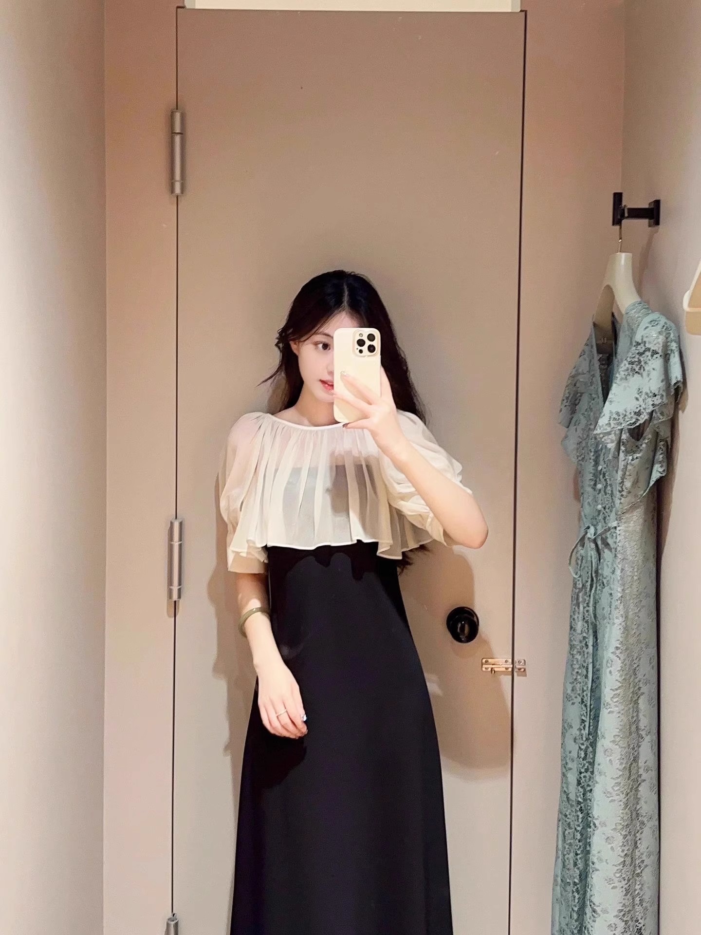 ボレロには程よい透け感のシフォン素材、ワンピースには上品な光沢の布帛を使用しました。バイカラーの組み合わせがモードなブラック、くすみカラーが今年らしいブルー、女性らしいニュアンスカラーのモカの3色展開です。