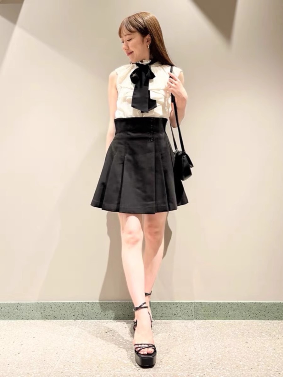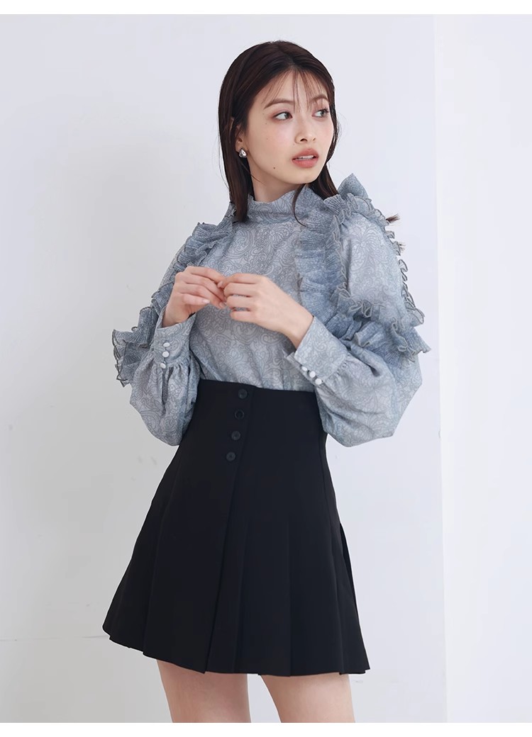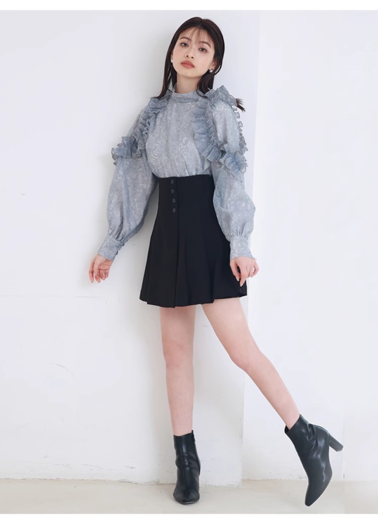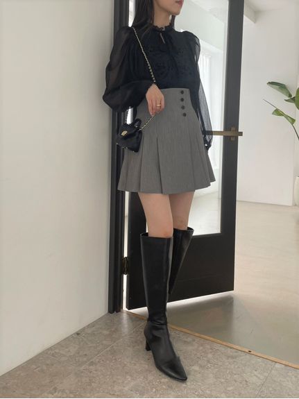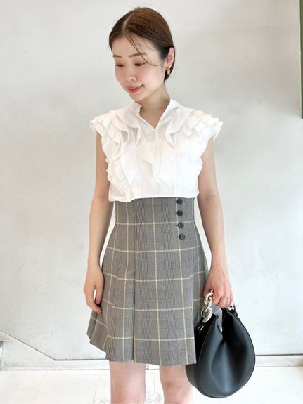 サイドにプリーツを畳んだクラシカルなフレアシルエットが印象的なスカショーパン。タイトなウエストから裾のフレアが八の字になるようにプリーツの広がりにミリ単位でこだわった1着です。ボタンでアクセントをプラスしたハイウエストデザインでスタイルアップ効果抜群。トップスはウエストインしてすっきりとまとめるのがおすすめです。