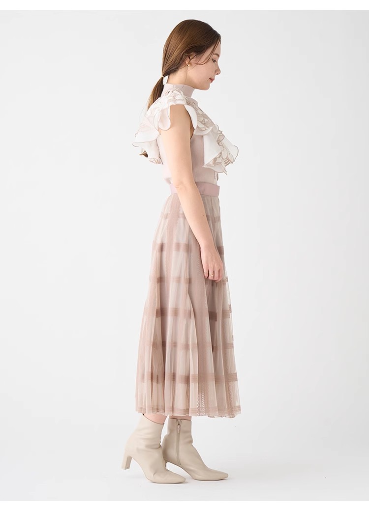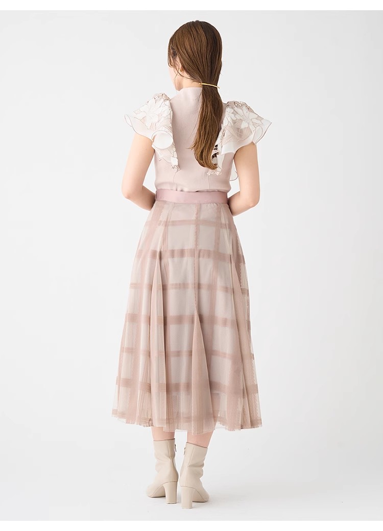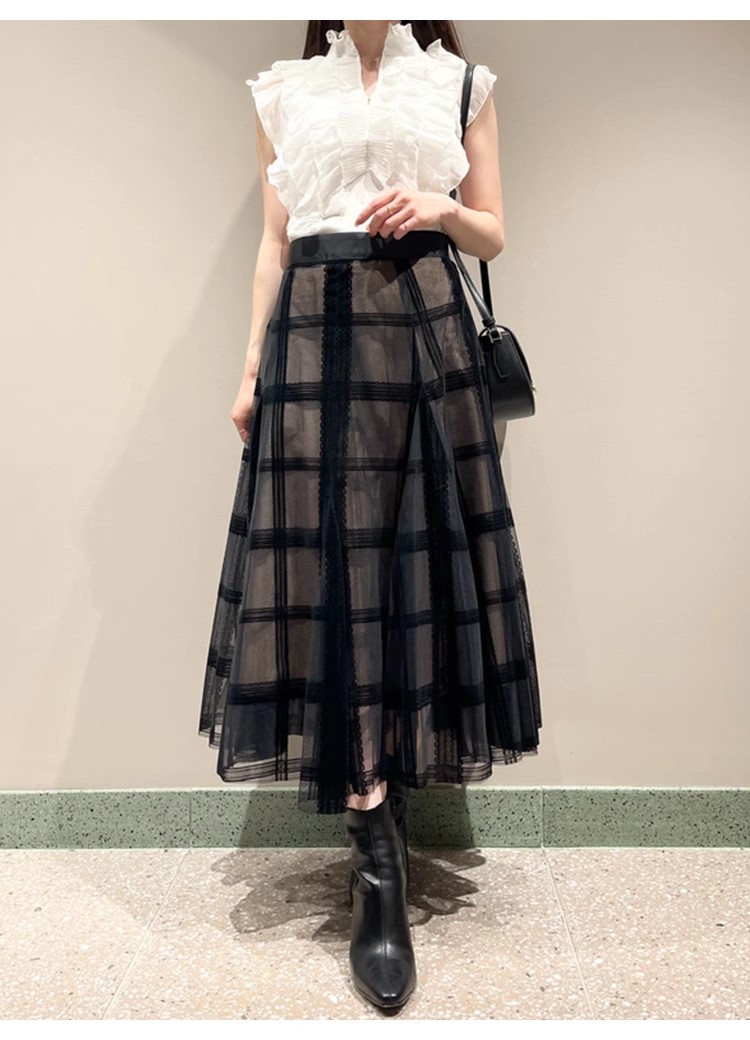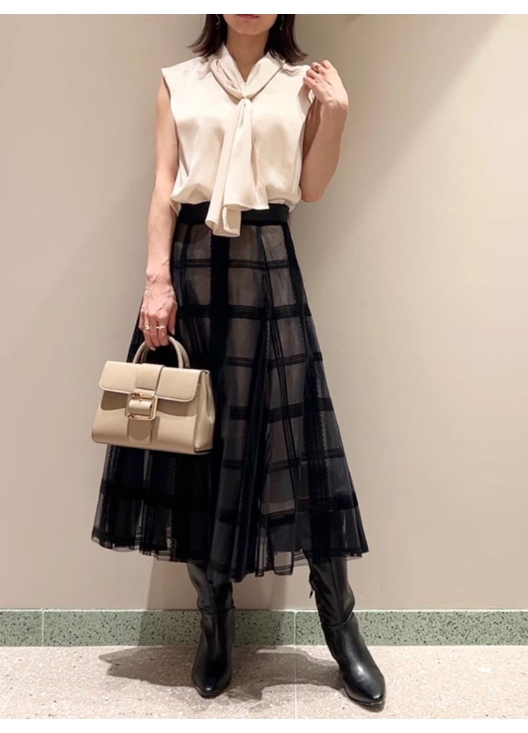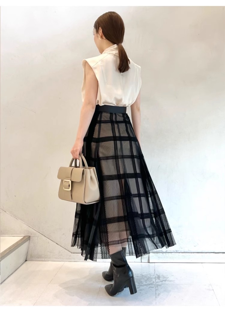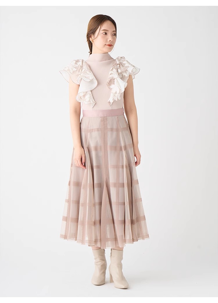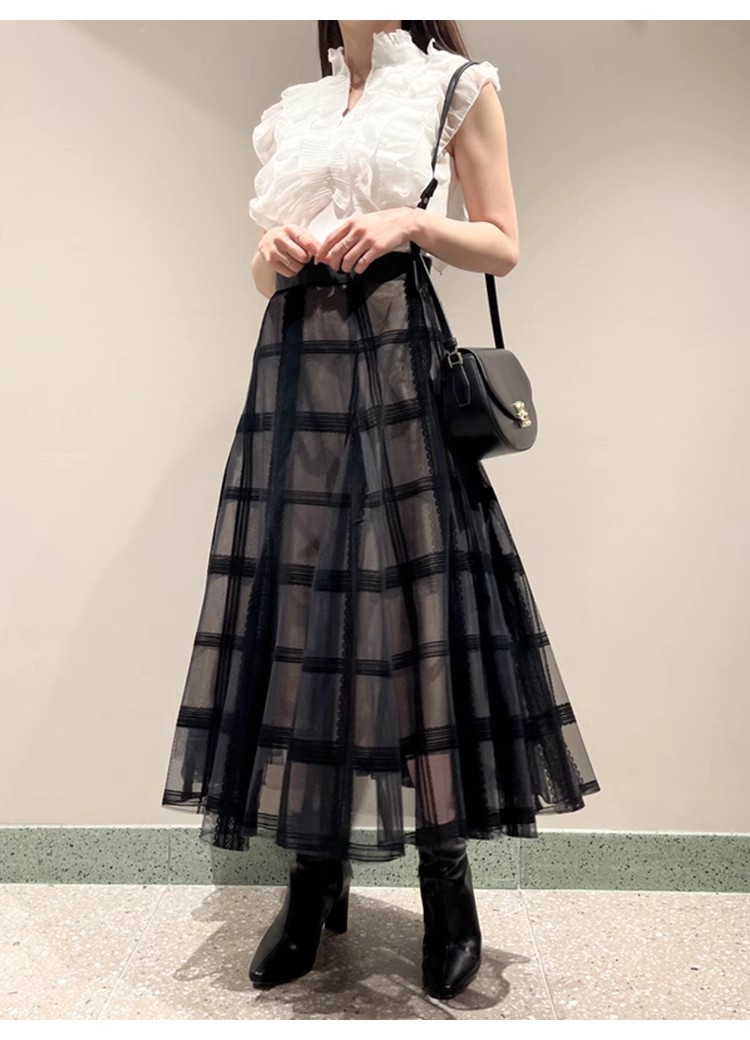 「SNIDEL」定番のエンブロイダリーチュールスカートにフロッキーデザインを加えた、抜群の存在感でスタイリングを華やかに彩る1着が到着です。動作のたびに揺れ足元をセンシュアルに映し出す透け感が女性らしさを高める秘訣。ボリュームのあるフレアシルエットなので、トップスはシンプルなニットなどを合わせてコンパクトにまとめるのがオススメです。