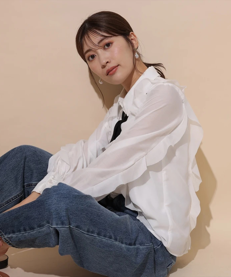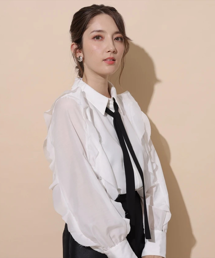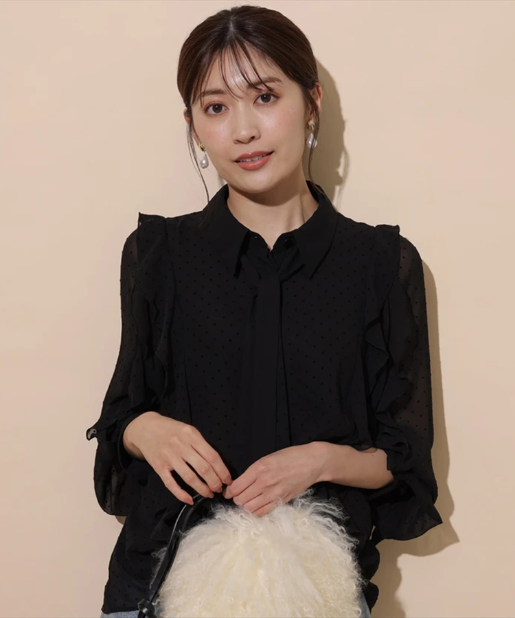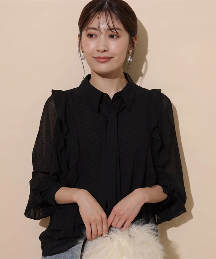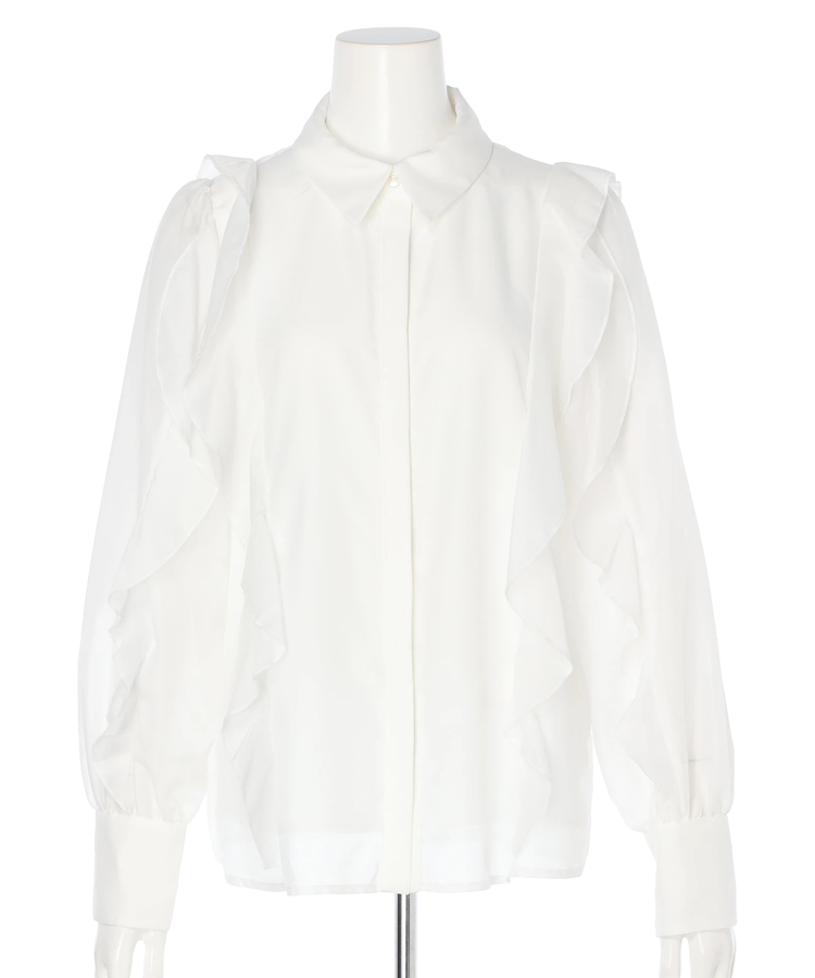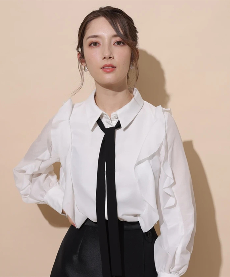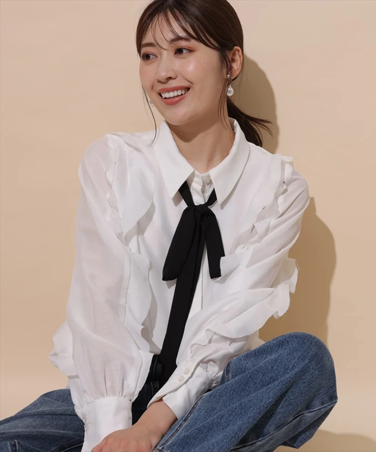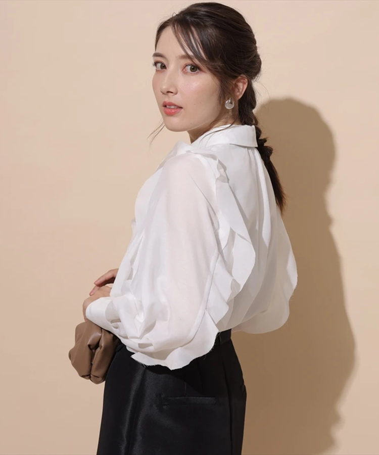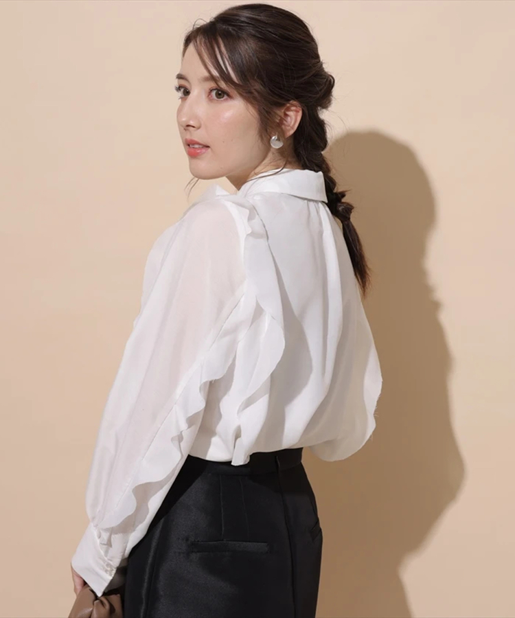 波打つフリルが甘さをプラスするシャツ襟ブラウス。