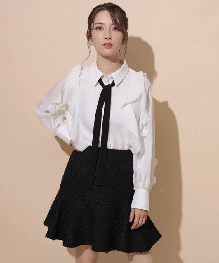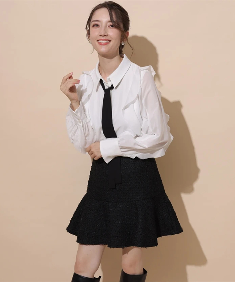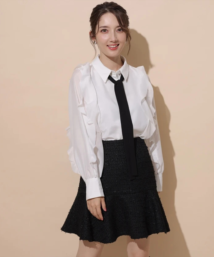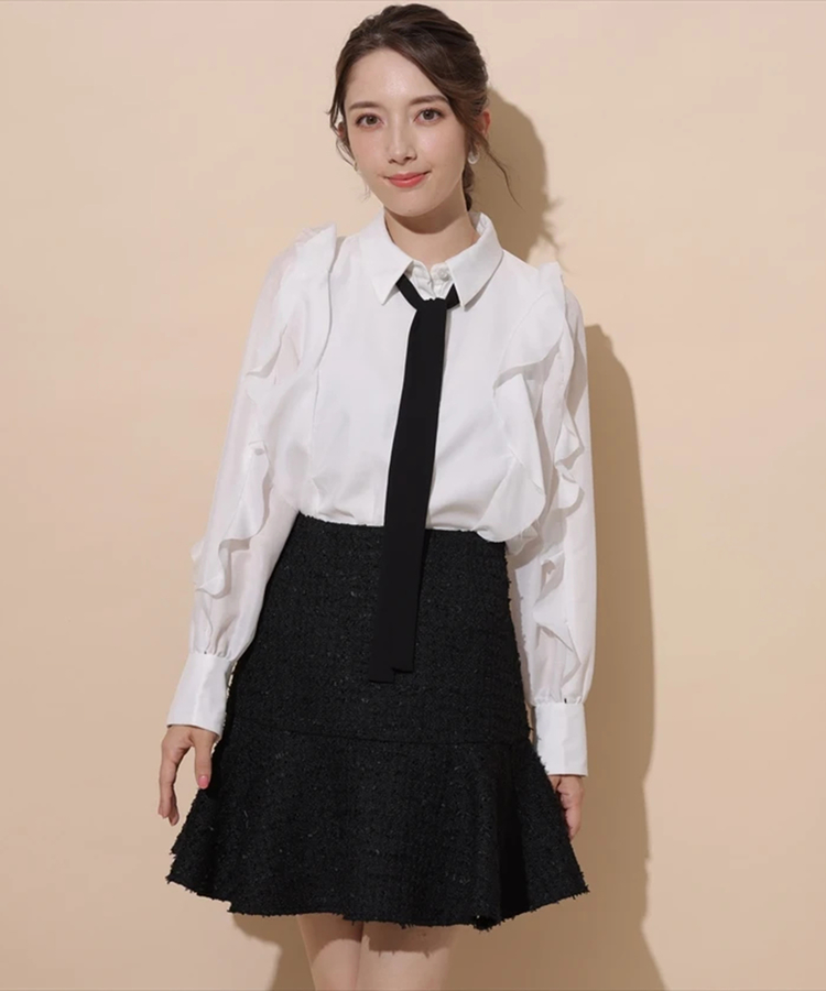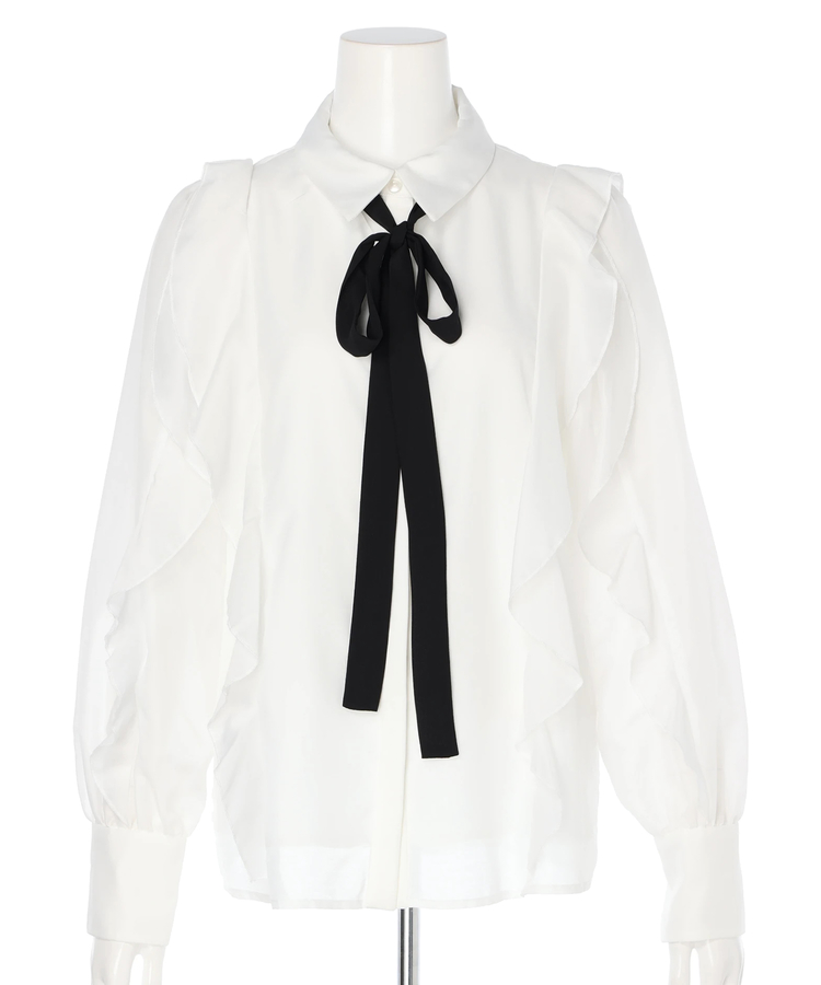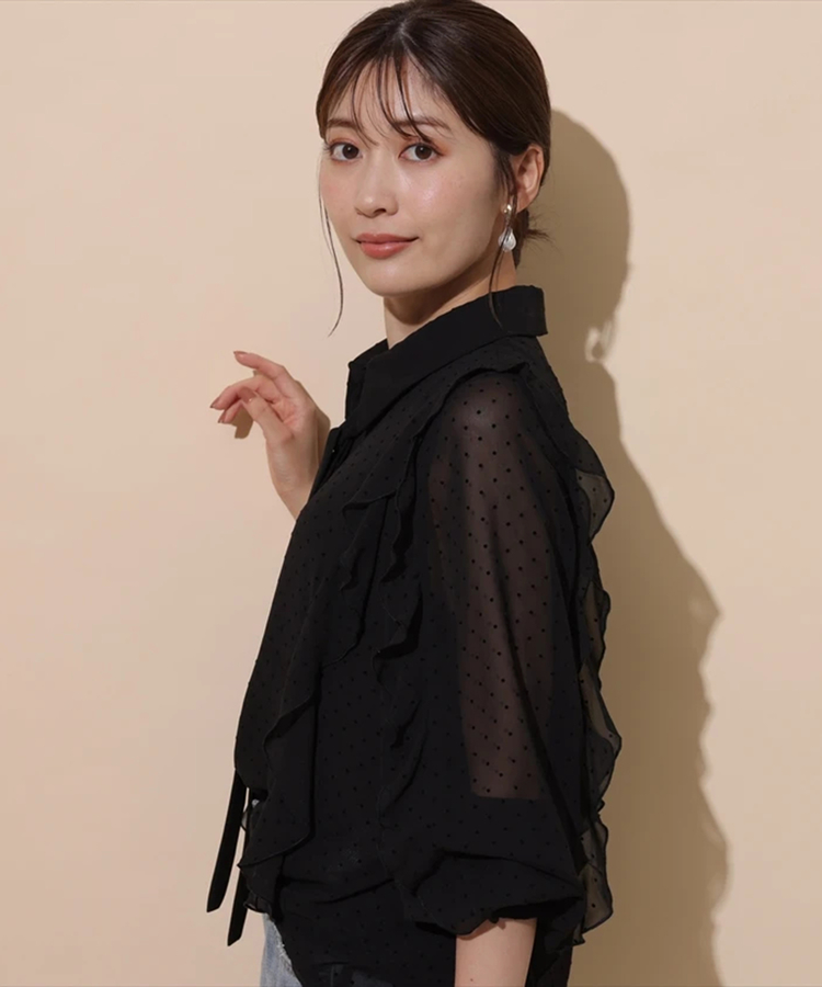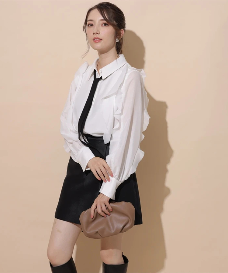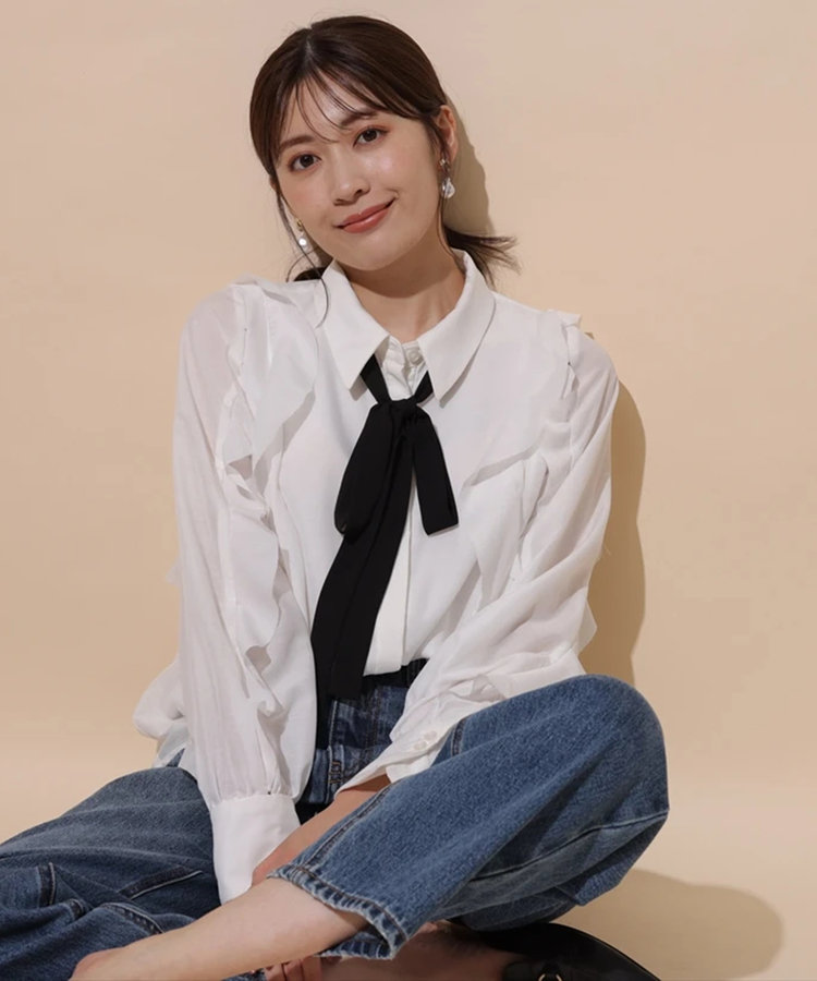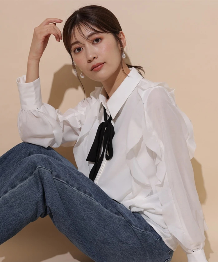 波打つフリルが甘さをプラスするシャツ襟ブラウス。