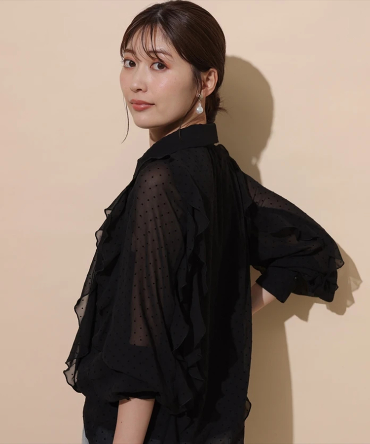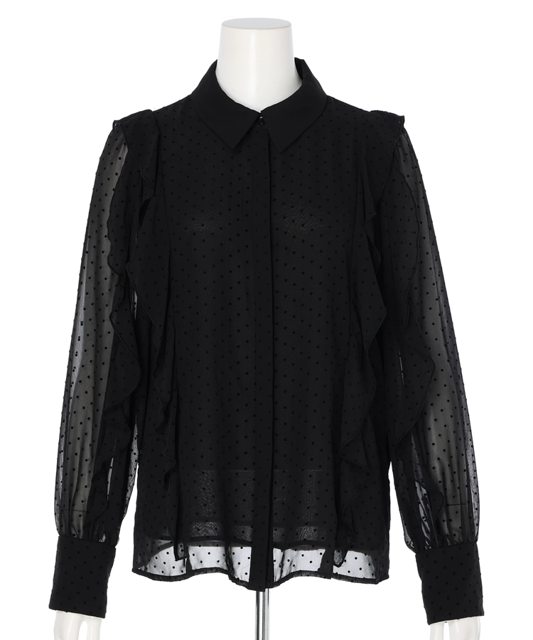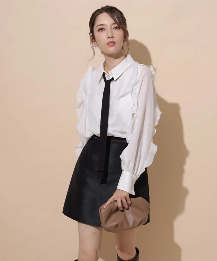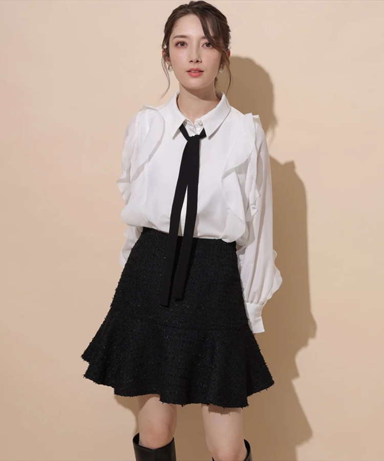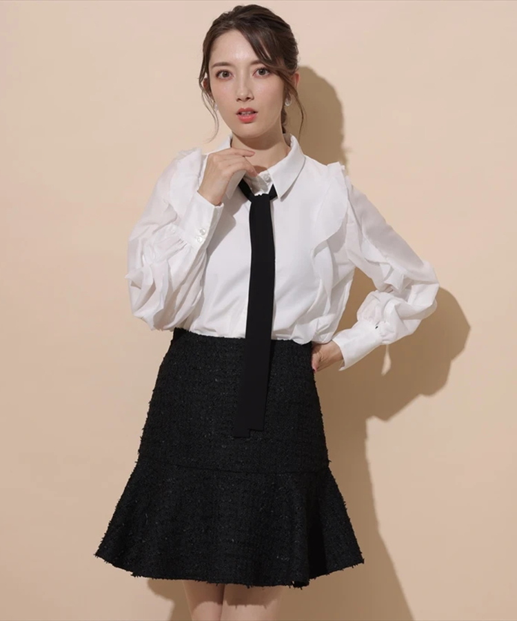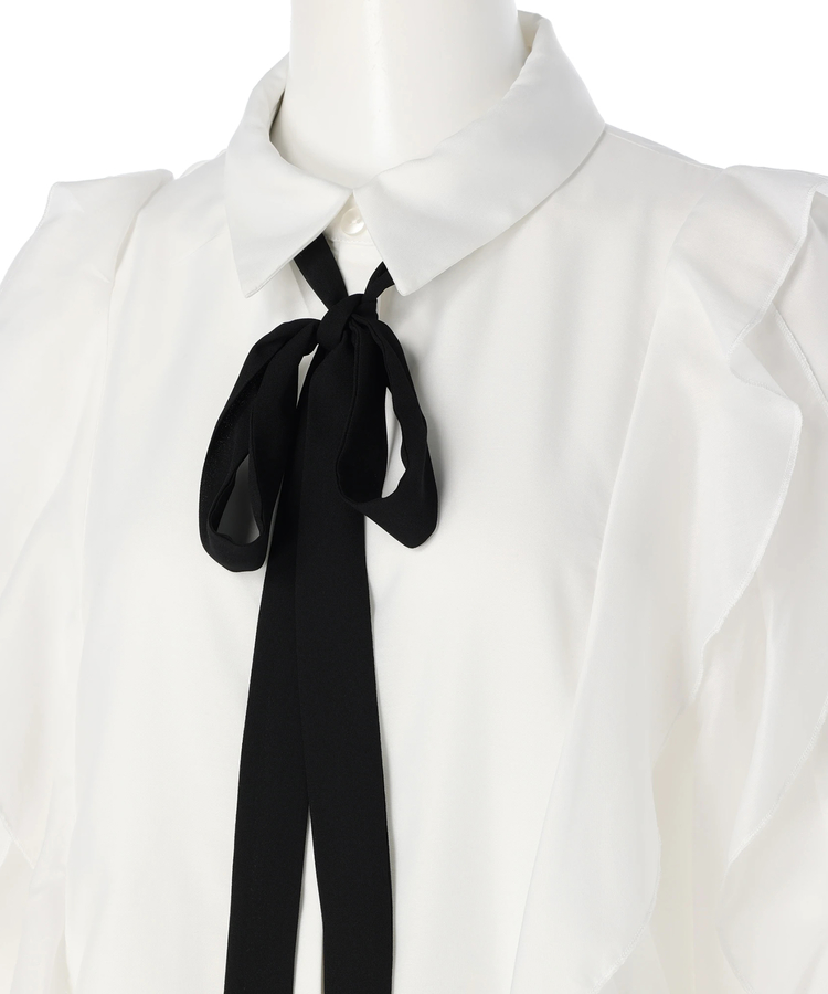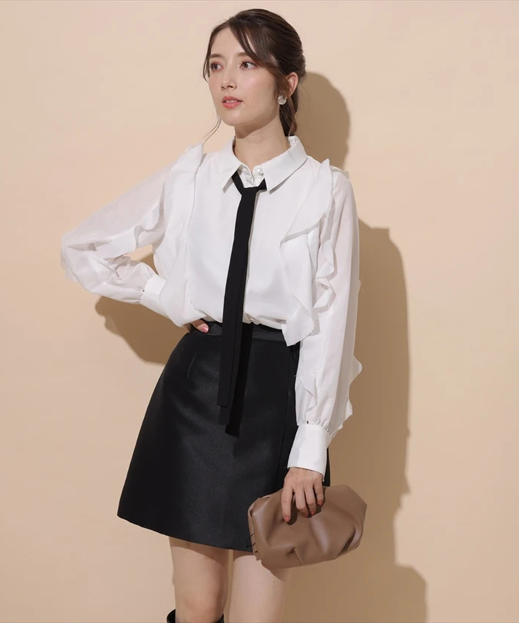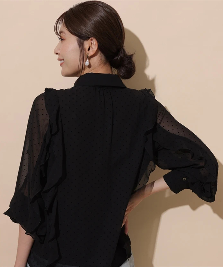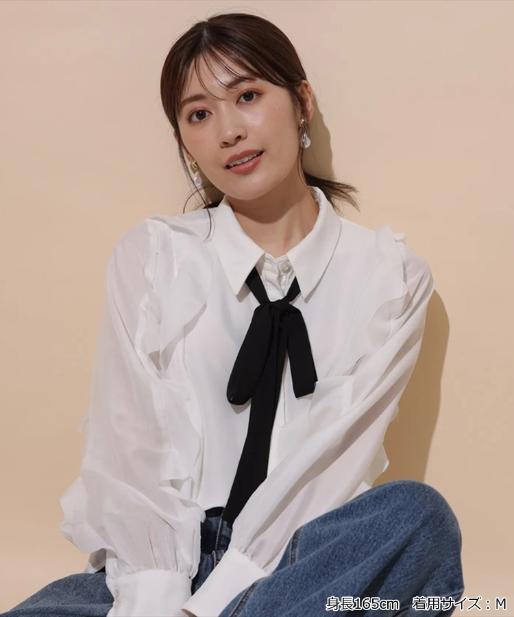 波打つフリルが甘さをプラスするシャツ襟ブラウス。